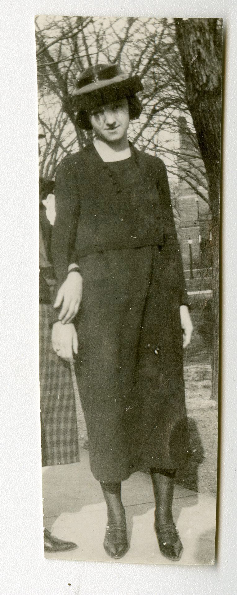 Black and white photograph of a woman wearing dark colored clothing. Photograph included with Brunner family photographs.