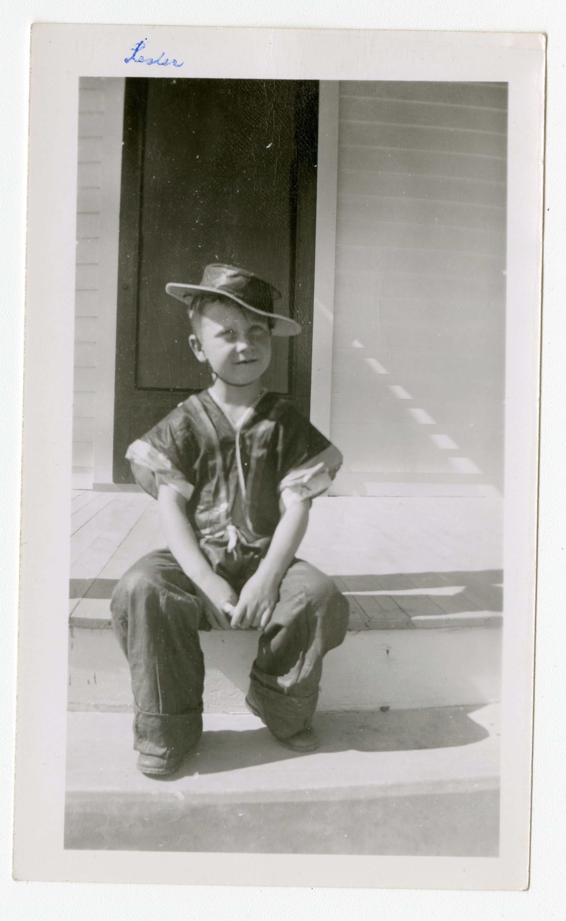 Black and white photograph of Lester K Brunner on a porch.