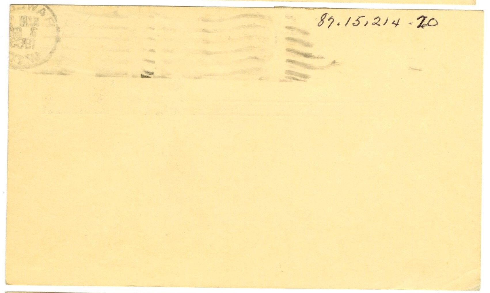 Postcard is addressed to "Postmaster, Broomfield, Colo." Postage stamps, green, 1c, and purple, 3c. Postal stamp from Rawlins, Wyo. Mar 6, 1963. Tape on top middle edge, and under postal stamp.Collection