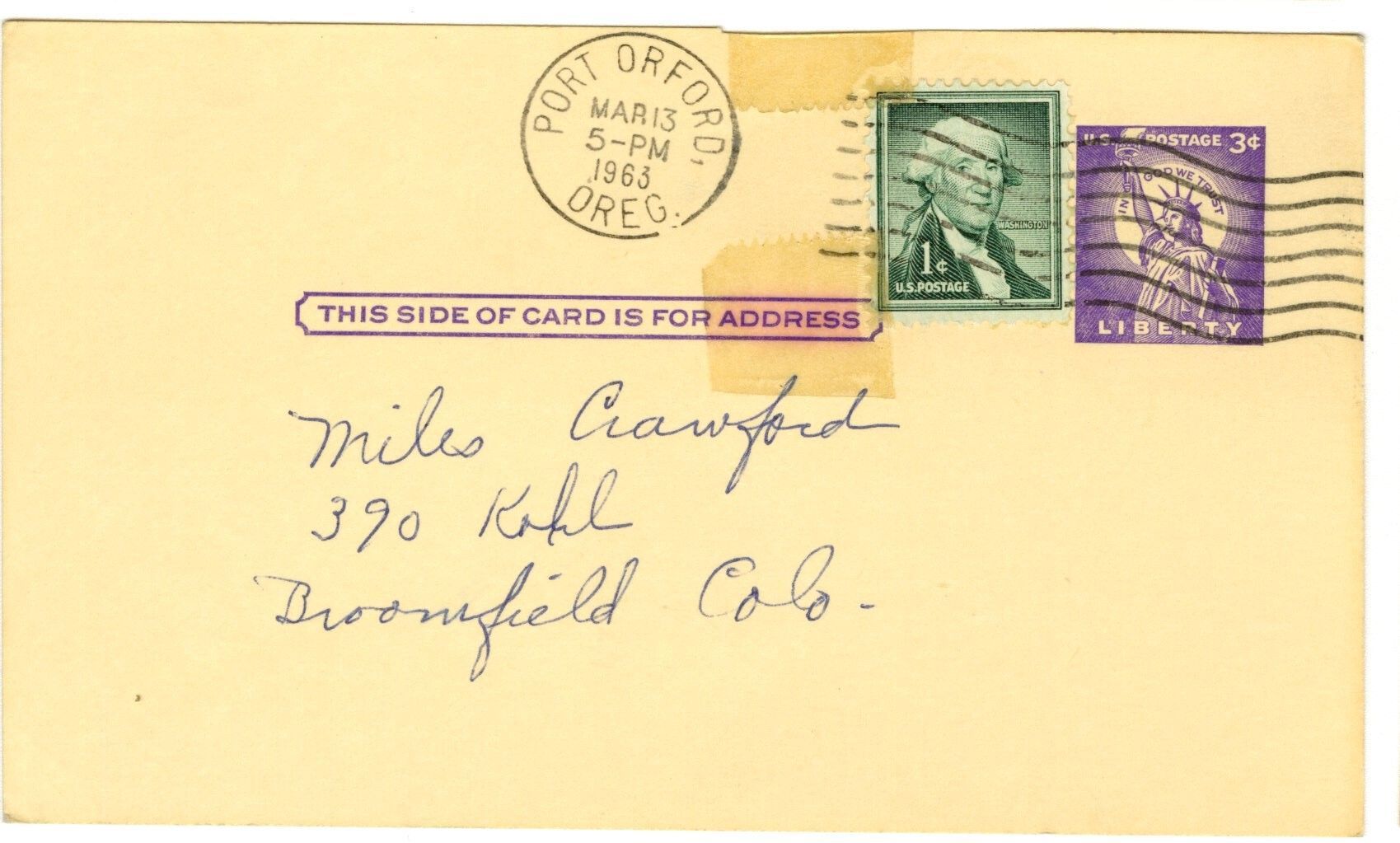 B: Postcard addressed to "Miles Crawford, 390 Kohl, Broomfield, Colo." Postage stamps, green, 1c, and purple, 3c. Postal stamp from Port Orford, Oreg. Mar 13, 1963. Tape on top middle of page just just above name "Crawford."Collection