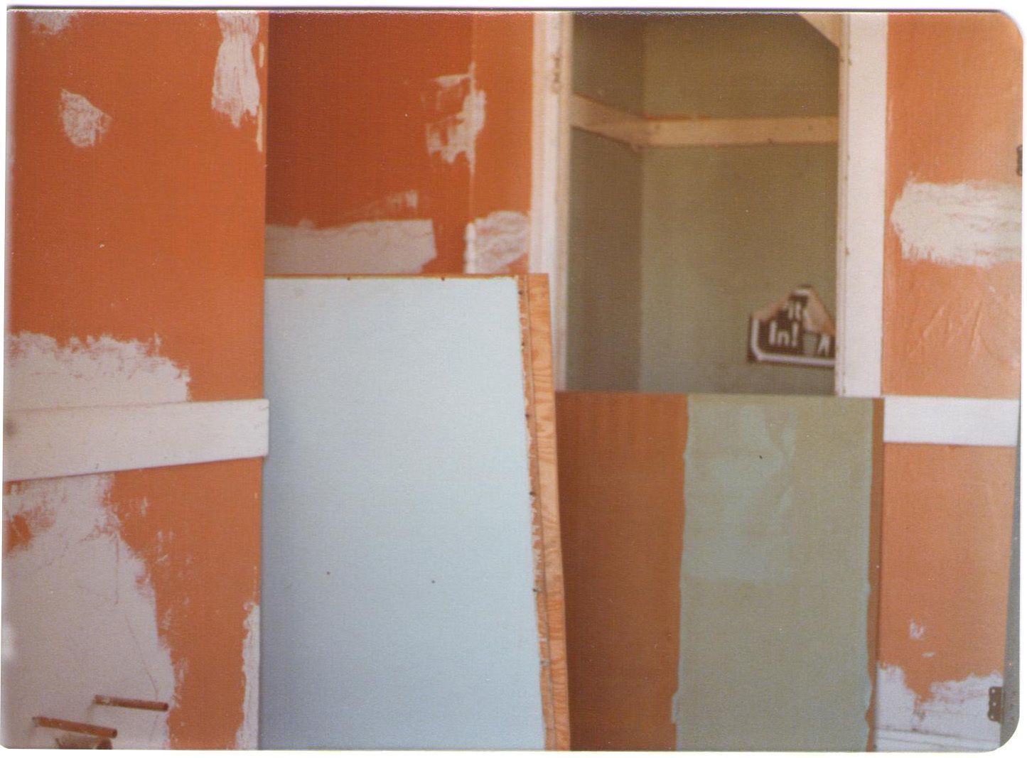 This is a scan of a photograph of the Broomfield Depot kitchen. There is an open door at the center of the photograph which leads to the former root cellar stairwell [currently a closet]. The walls of the kitchen are dark orange with patches of white primer. There is scrap plywood leaning against the open door and door frame.