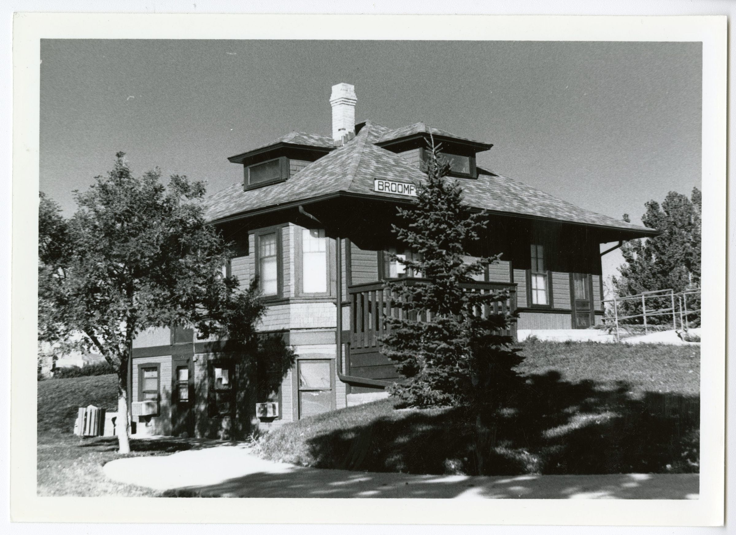 Black and white photo of the Broomfield Depot Museum circa 1993 showing building and landscaping facing northwest. Building has hip roof, one chimney, two dormers (shown in photo), numerous windows and two doors.