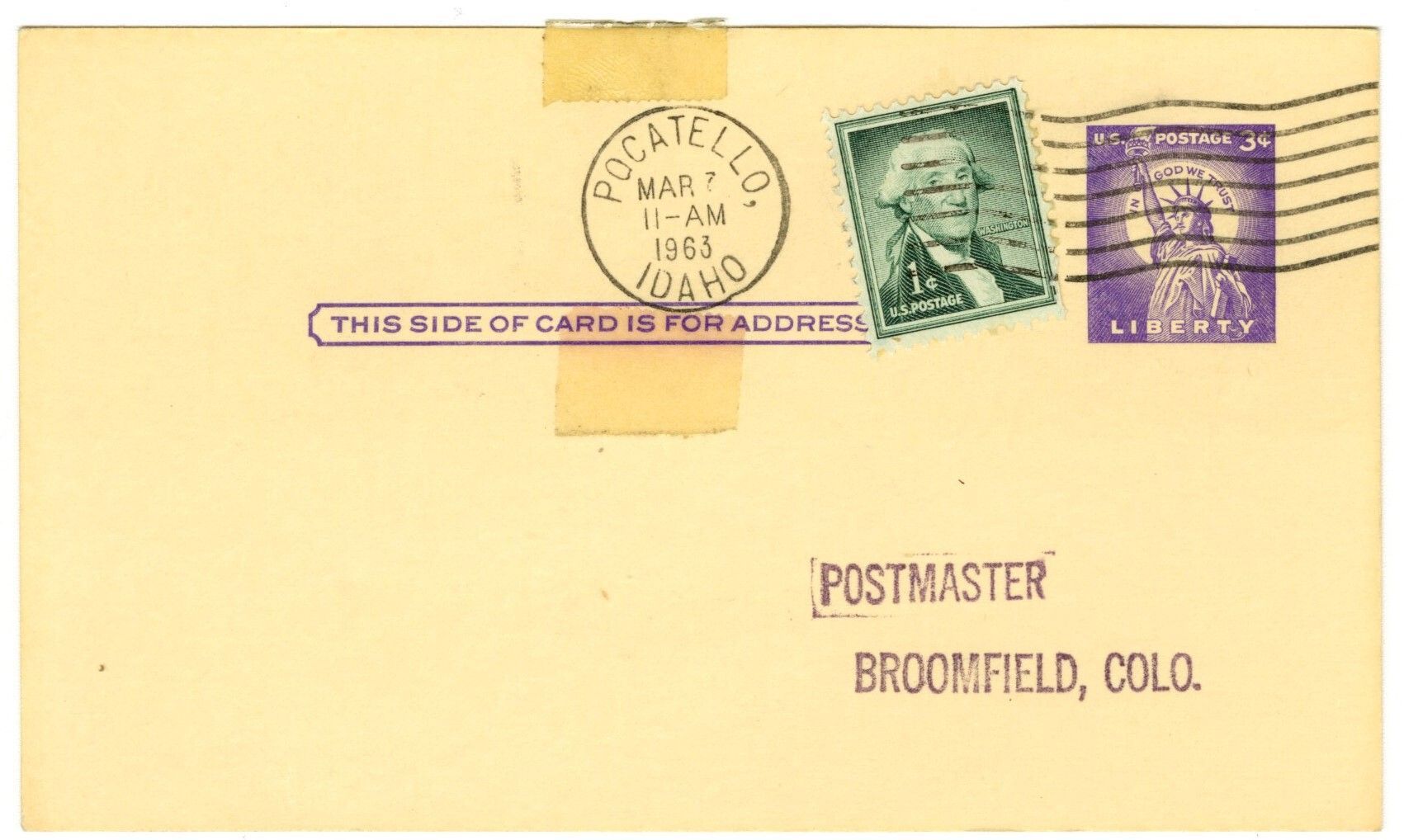 Postcard addressed to "Postmaster, Broomfield, Colo." Postage stamps, green, 1c and purple, 3c. Postal stamp from Pocatello, Idaho. Mar 7, 1963. Tape on top middle, and just below postal stamp.Collection