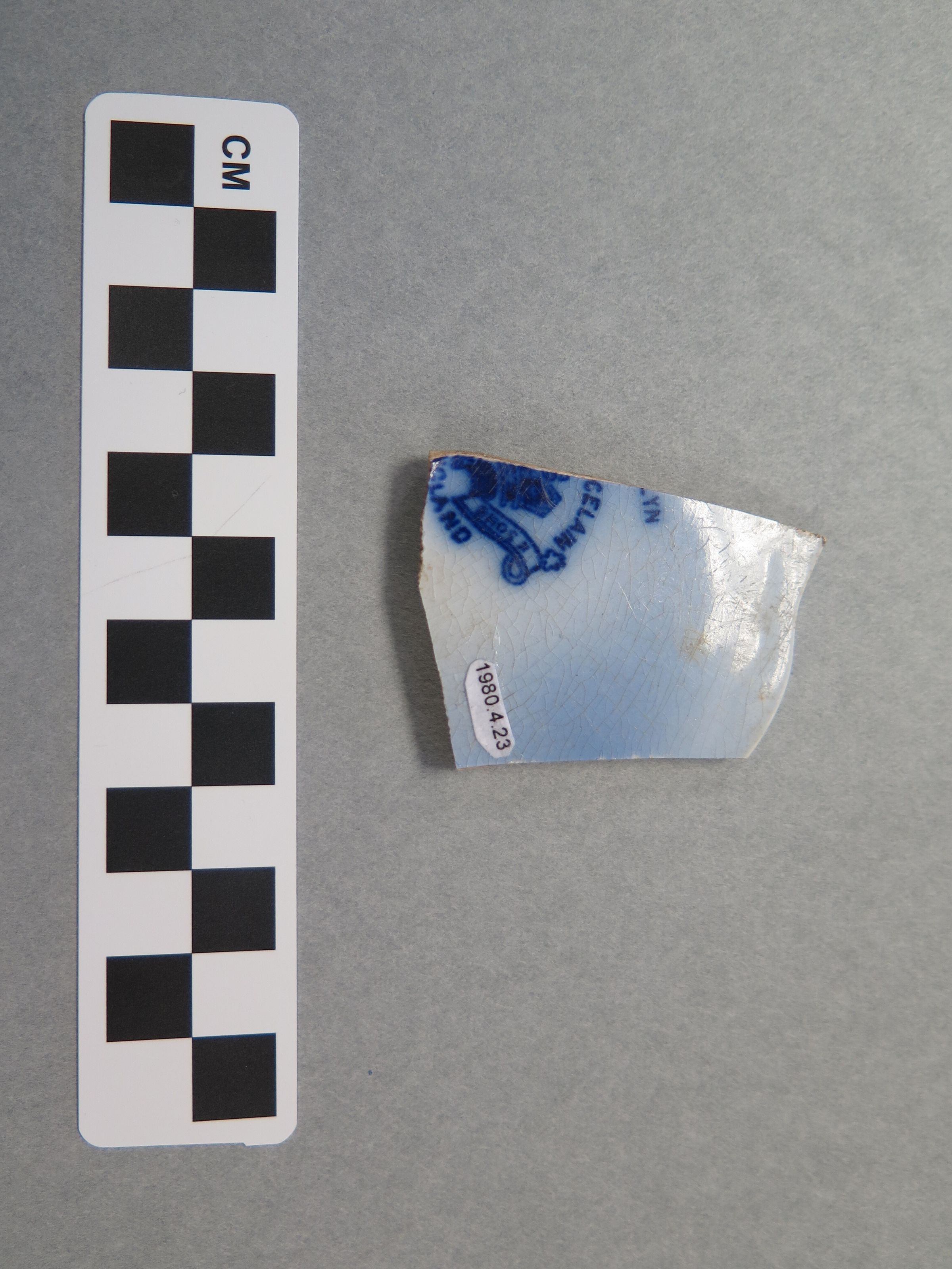 This is a fragment of a saucer. The fragment is of the rim of the plate, that has a curved edge that indicates it would have had a scalloped edge. The glaze on the plate is white with different shades of blue to create designs. The saucer has crazing happening to the glaze. It appears as though there was some design features drawn into the saucer before it was glazed with its raised topography. On the white glazed back of the fragment there is part of a design which appears to be a crest of some kind and the text "_YN / _CELAIN / _BROS II / _GLAND" stamped on it in blue. The fragment measures 1.5" (w) x 2.25" (l).