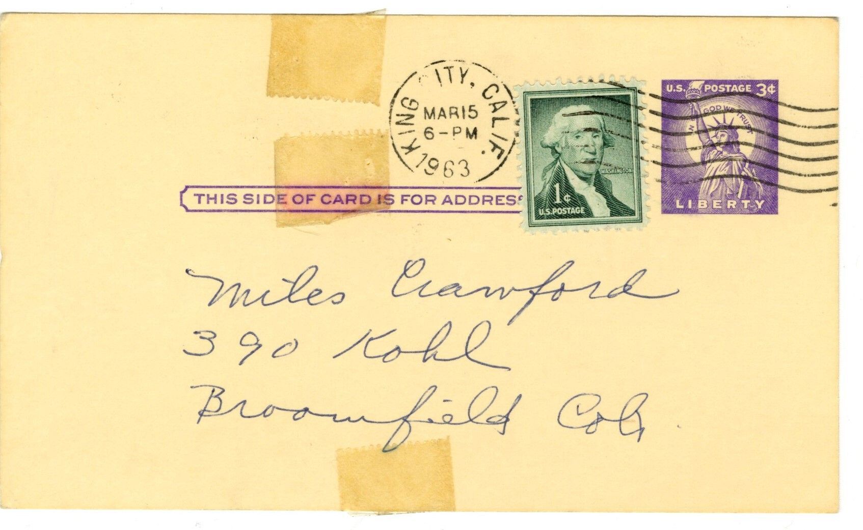 Postcard addressed to "Miles Crawford, 390 Kohl, Broomfield, Colo." Postage stamps, green, 1c and purple, 3c. Postal stamp from King City, Calif. Mar 15, 1963. Tape on top and bottom middle, and just beside postal stamp.Collection