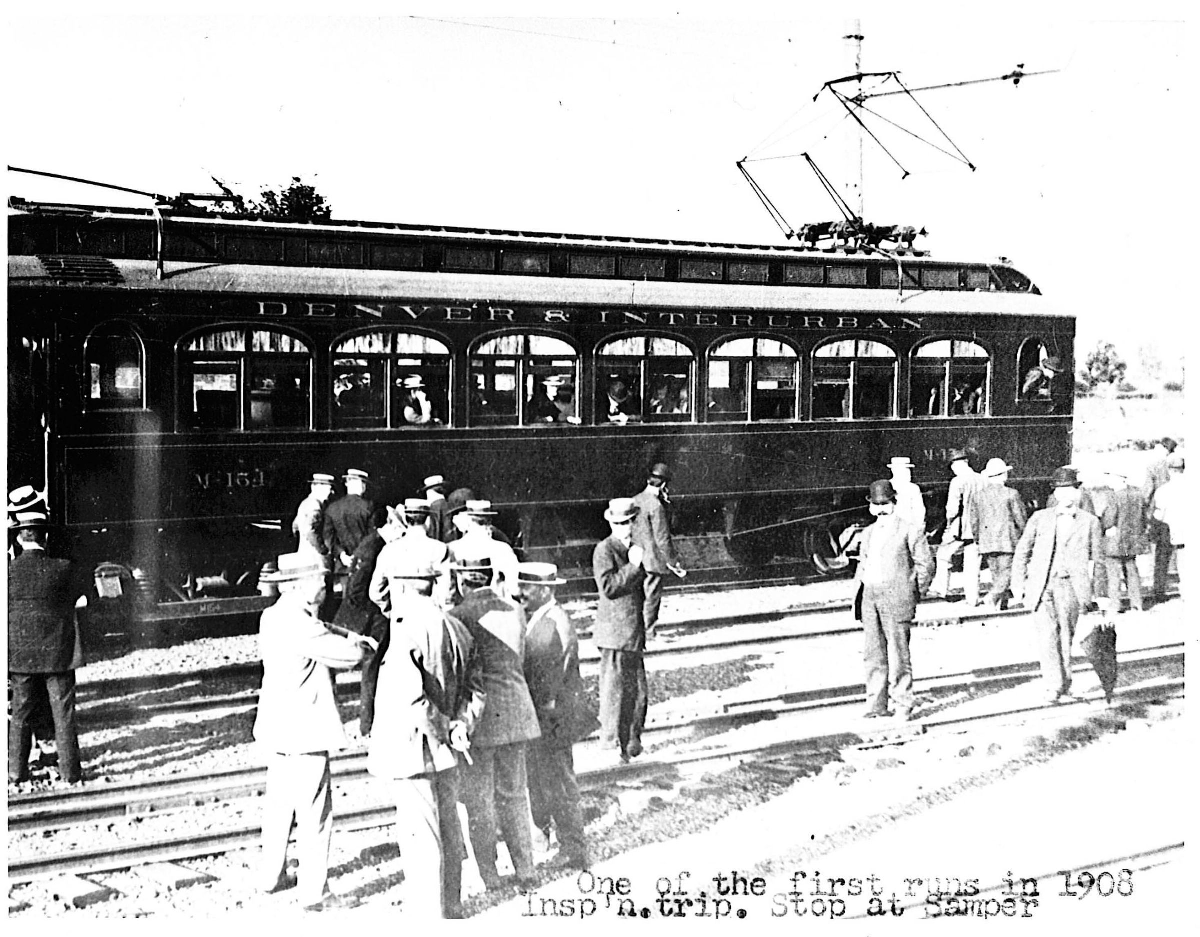 A black and white print of a photograph of a Denver and Interurban R.R. car stopped at Semper. The car is stopped on tracks in the background, multiple men in suits and hats are crowded in the foreground. At the bottom of the image; "One of the first runs in 1908. Insp'n. trip. Stop at Semper." R.F.Schilp is stamped on back.