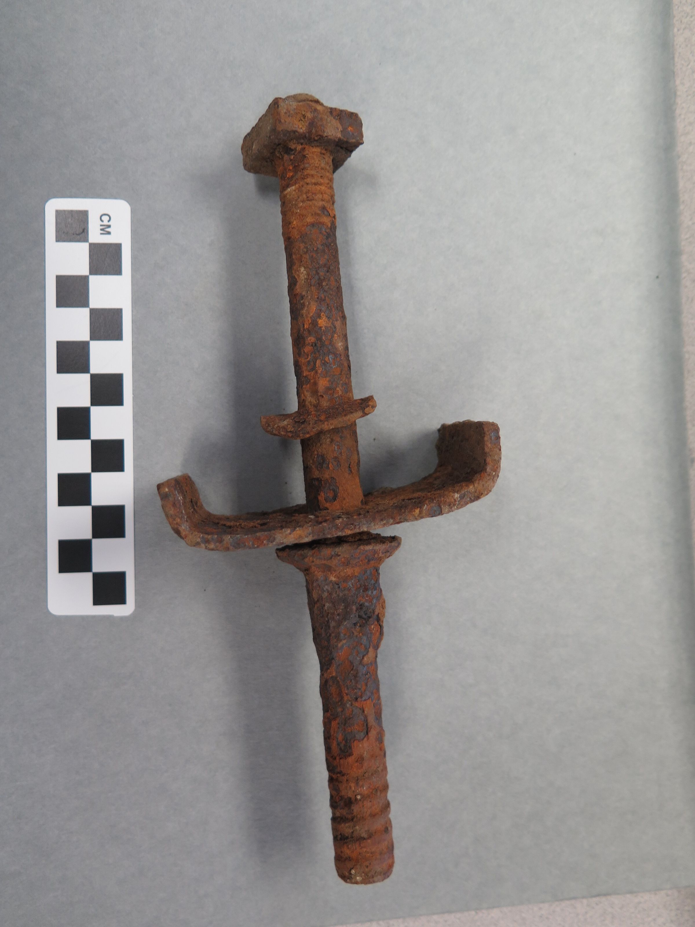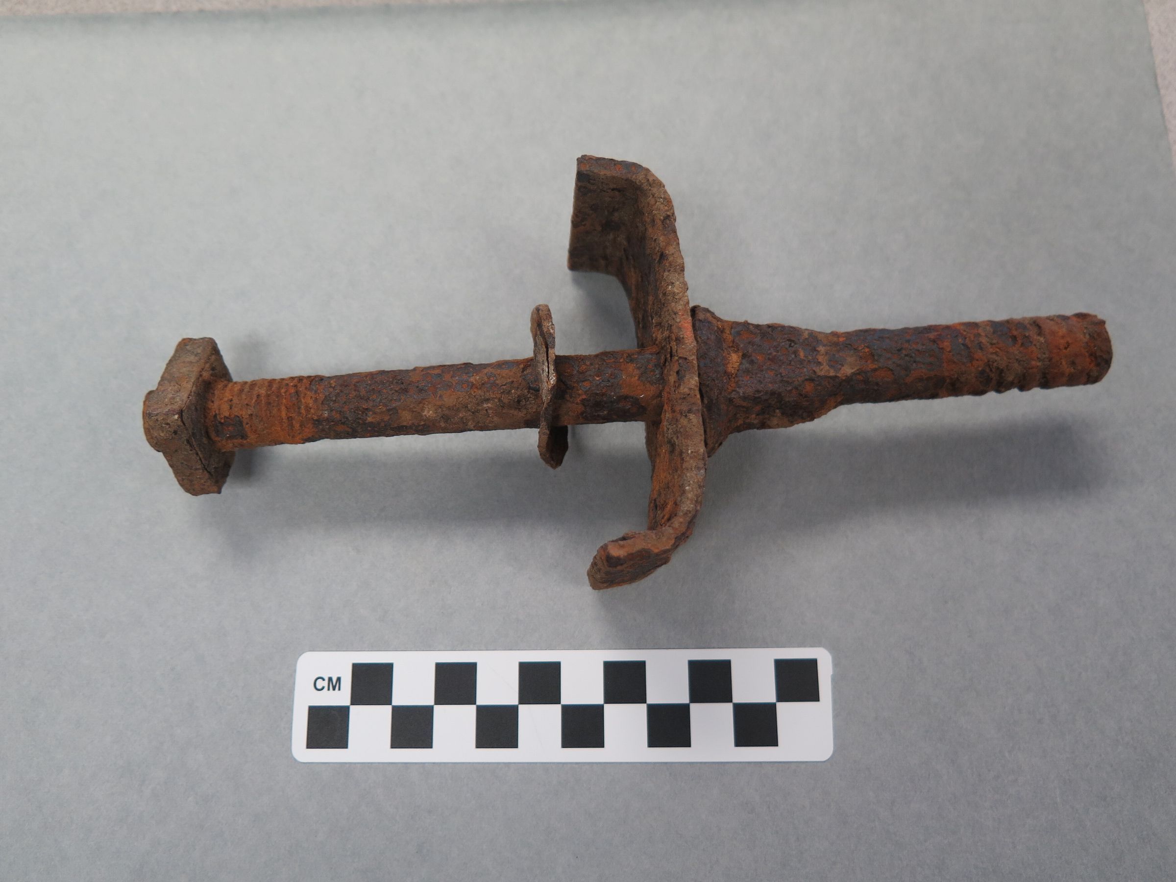 This is a metal screw that is very rusted. The screw is round and has crcular lines at the top. There is a square bolt screwed on at the top. There is a washer that is loose between the bolt and a rectangular piece of metal that curves up on two sides. The bottom of the screw widens and becomes more angular at the top stopping the rectangular piece of metal from falling off. The screw measures 2.25" (h) x 3.5" (w) x 9" (l).