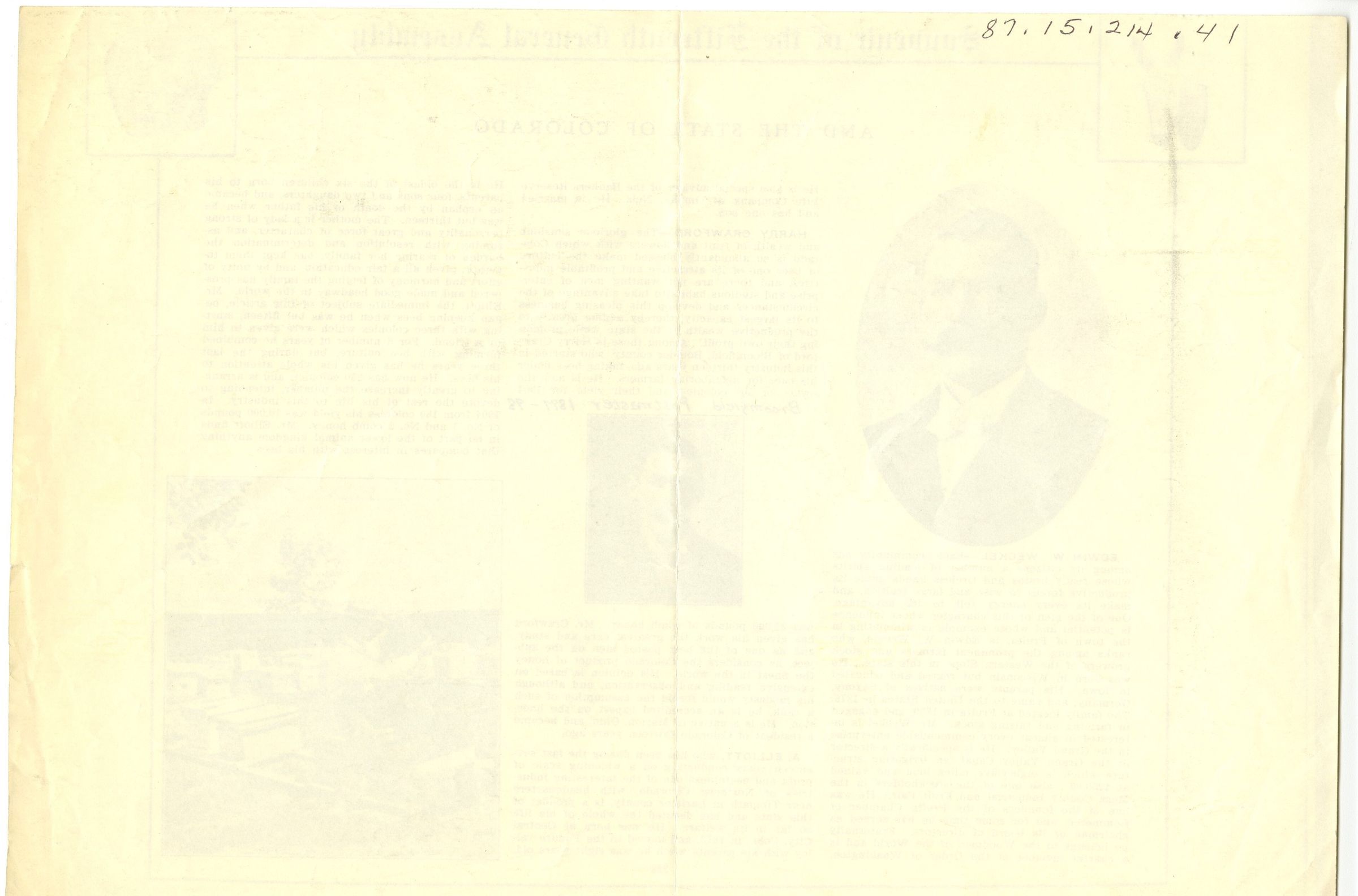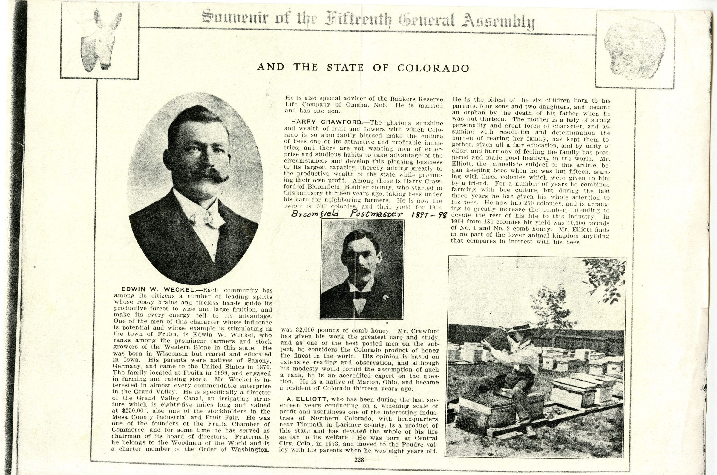 Photocopied article, Souvenir of the Fifteenth General Assembly. Lists three farmers in Colorado, including Harry Crawford and his bees. Written on page, just above Crawford's photo is "Broomfield Postmaster 1897-98."Collection