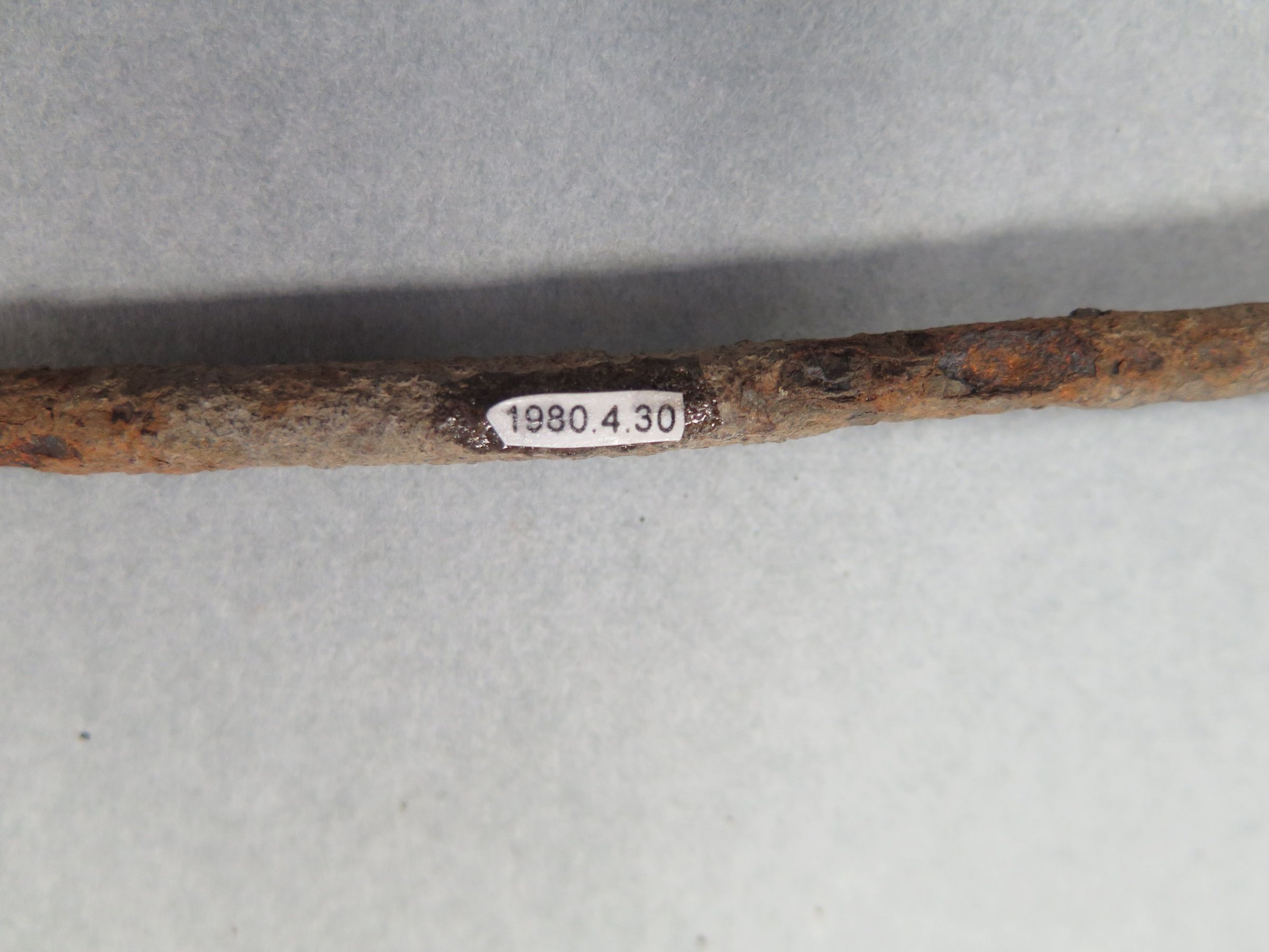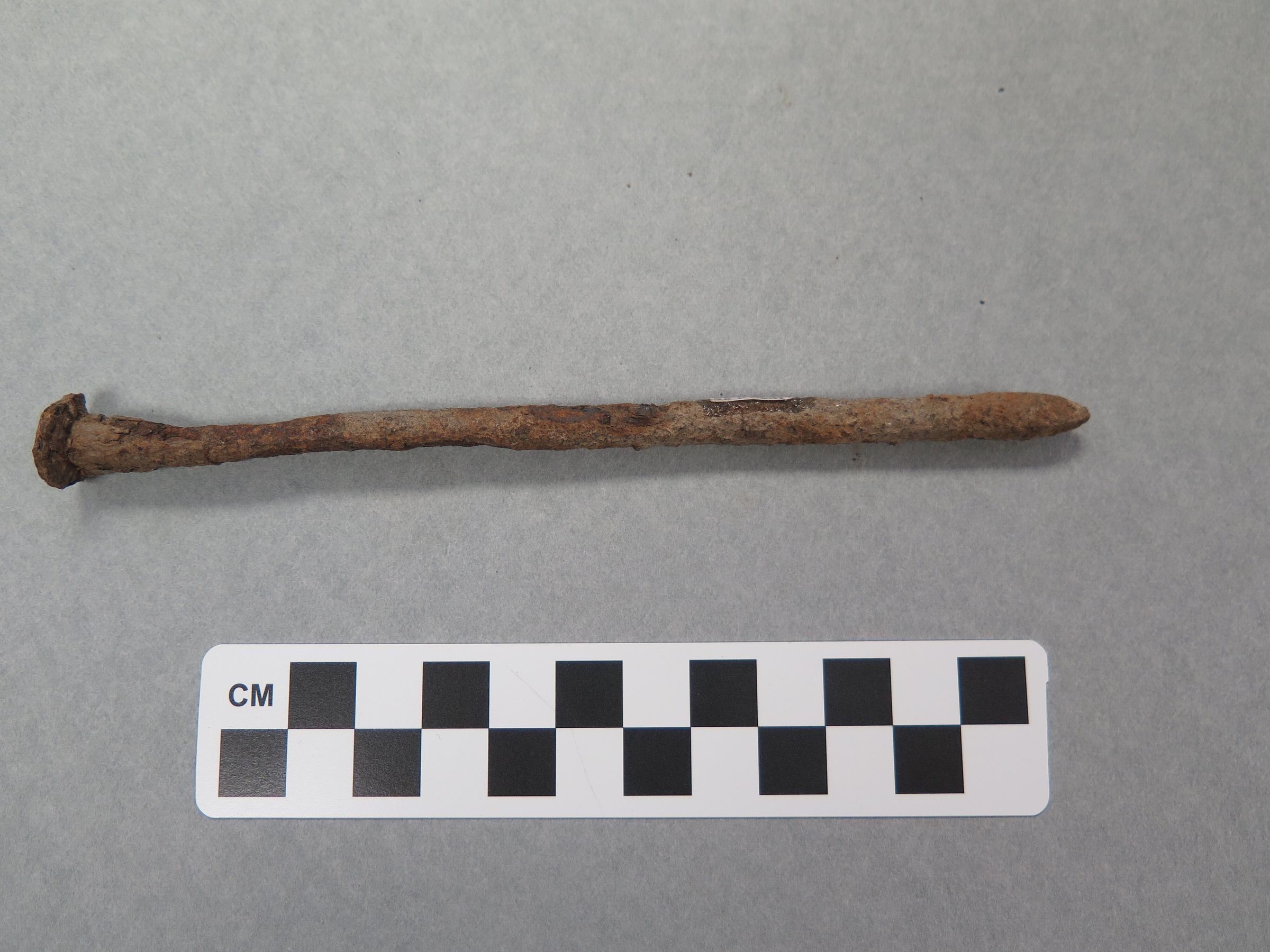 This is a metal nail that is very rusted. The head of the nail is circluar as well as the body of the nail. The nail measures .5" (h) x .75" (w) x 6" (l).