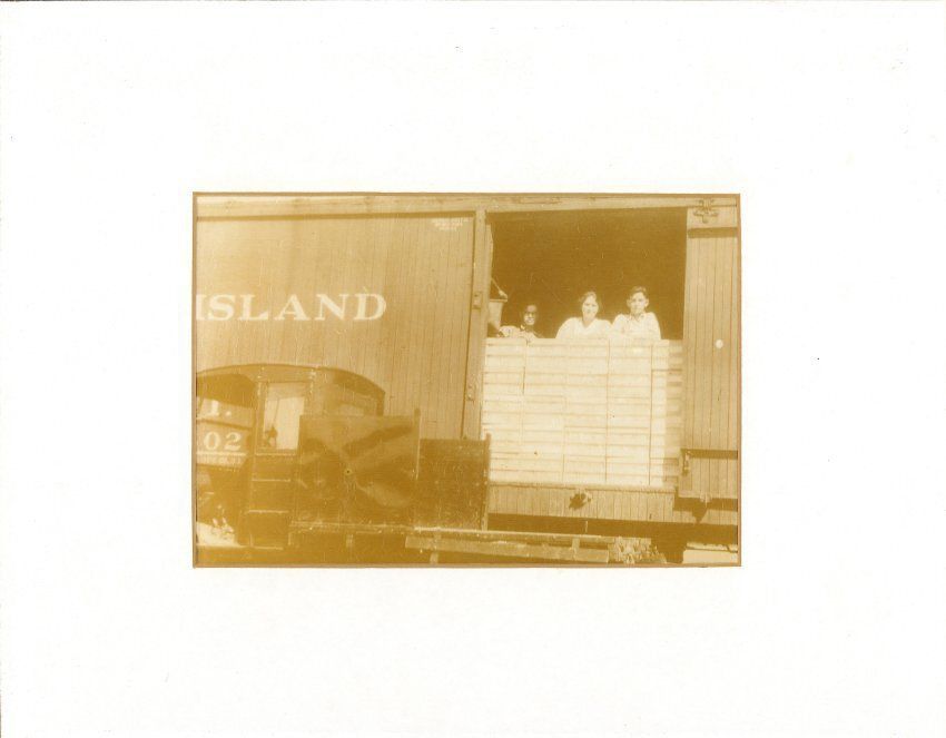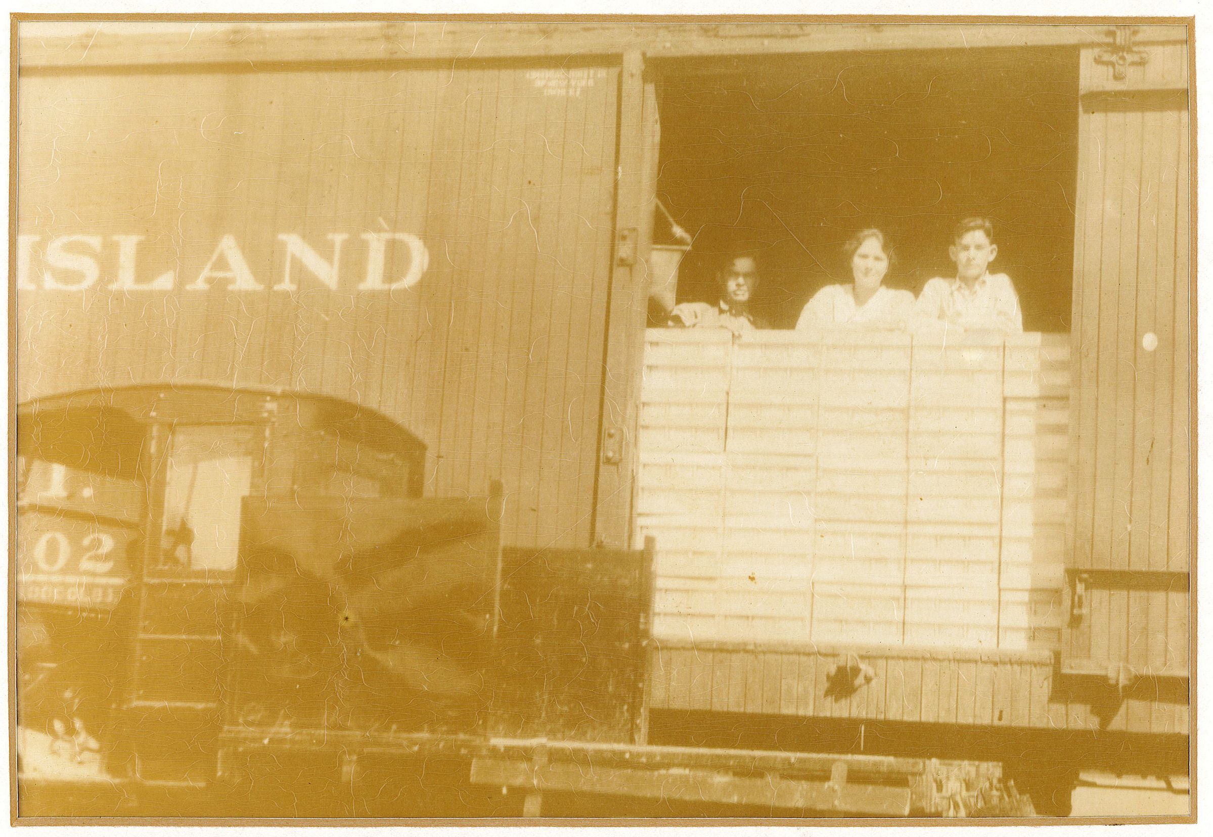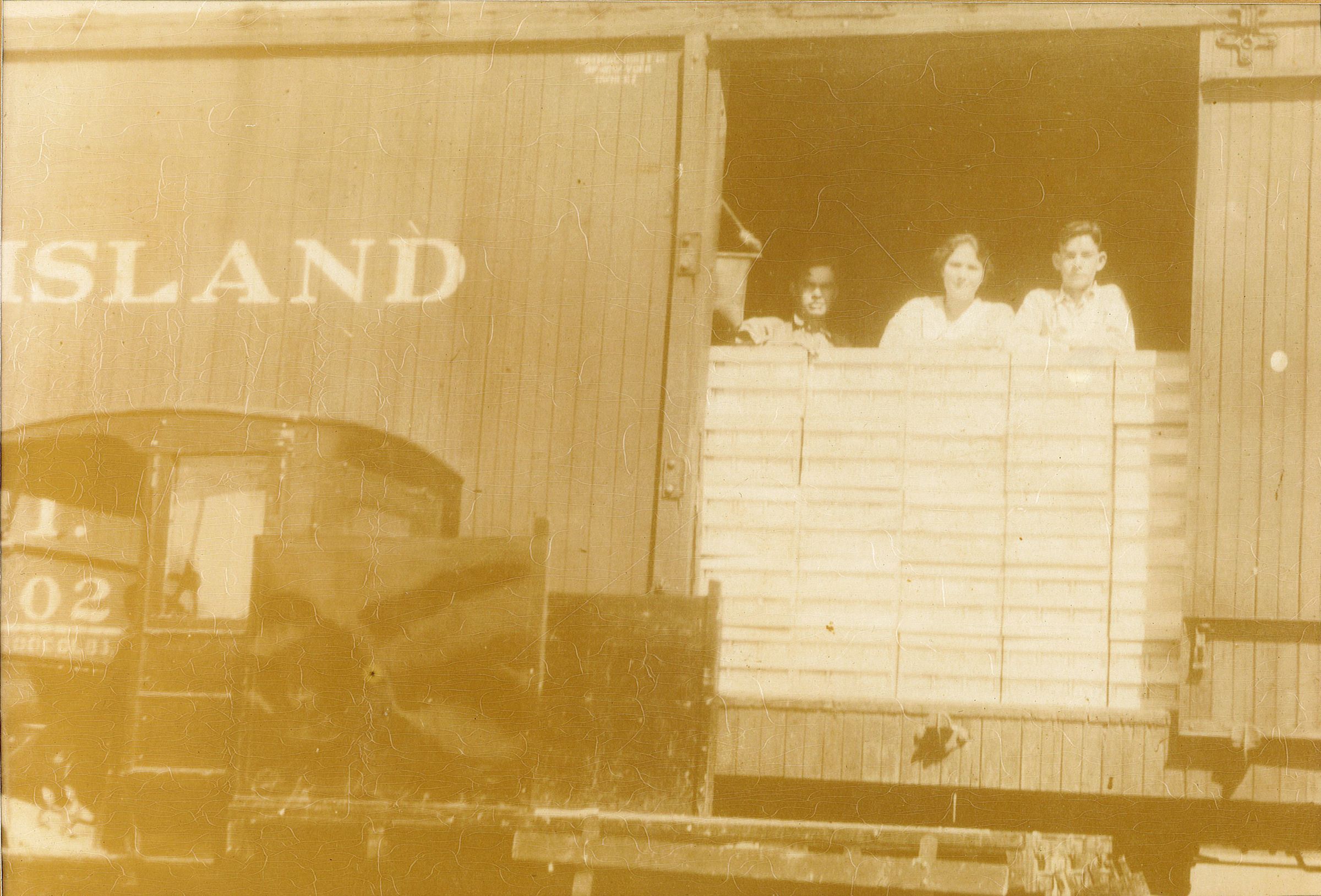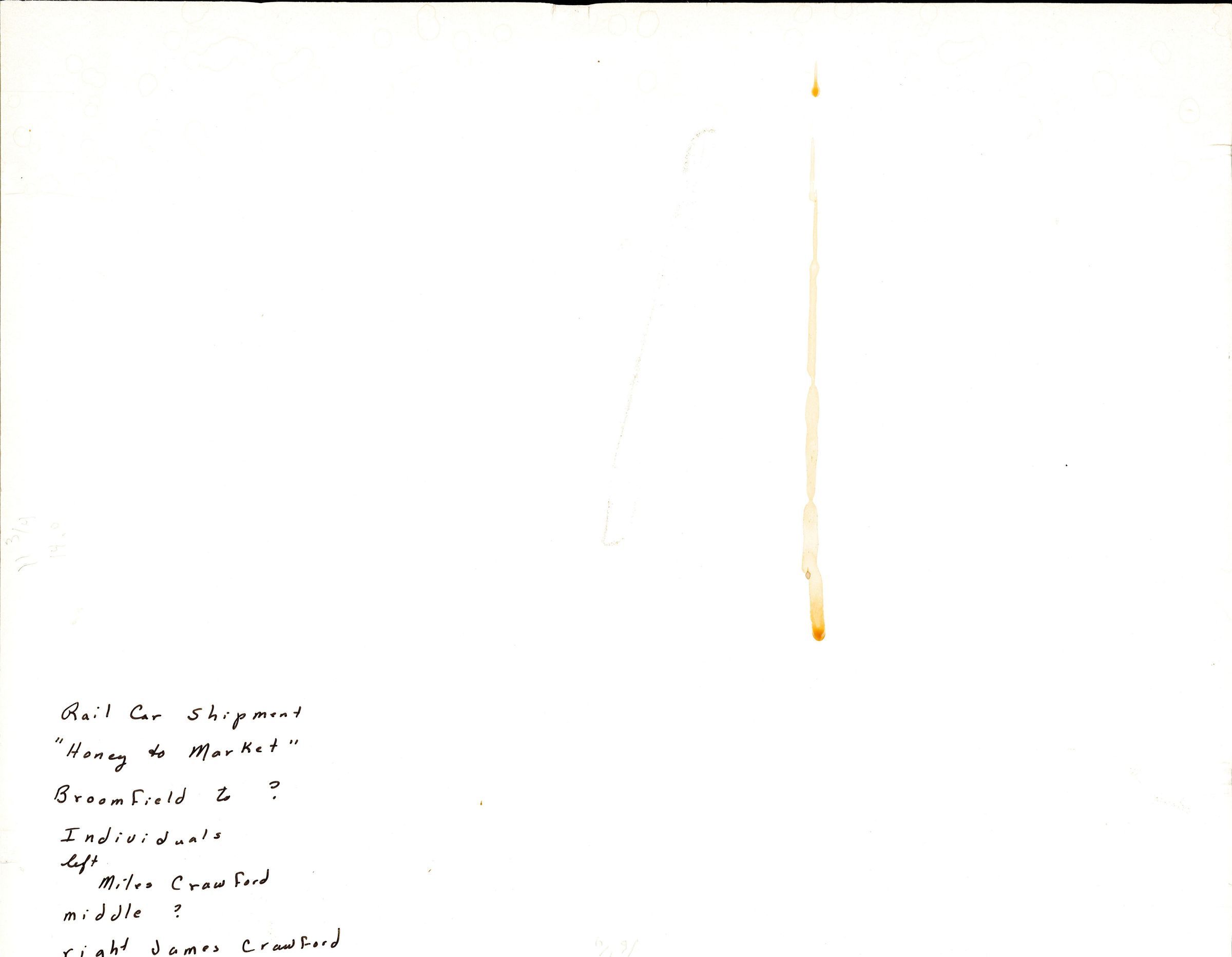 This is a photographic print showing three Crawfords standing in a train car with honey shipping boxes in front of them. Transcribed on the back of the matting, "Rail Car Shipment Honey to Market Broomfield to ? individuals left to right are Miles Crawford, middle ?, James Crawford."