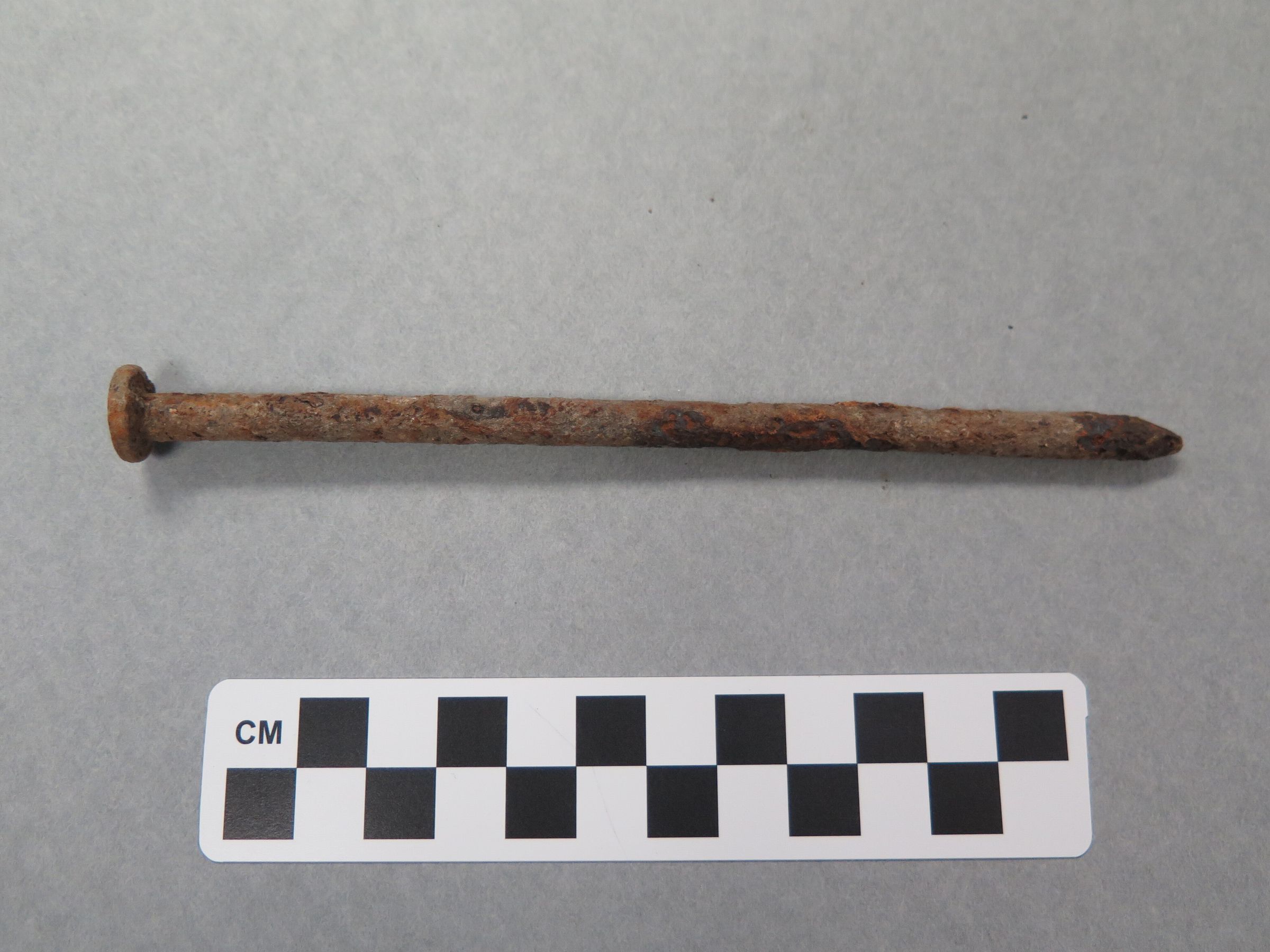 This is a metal nail that is very rusted. The head of the nail is circluar as well as the body of the nail. The nail measures 6" (l) x .5" (diam).