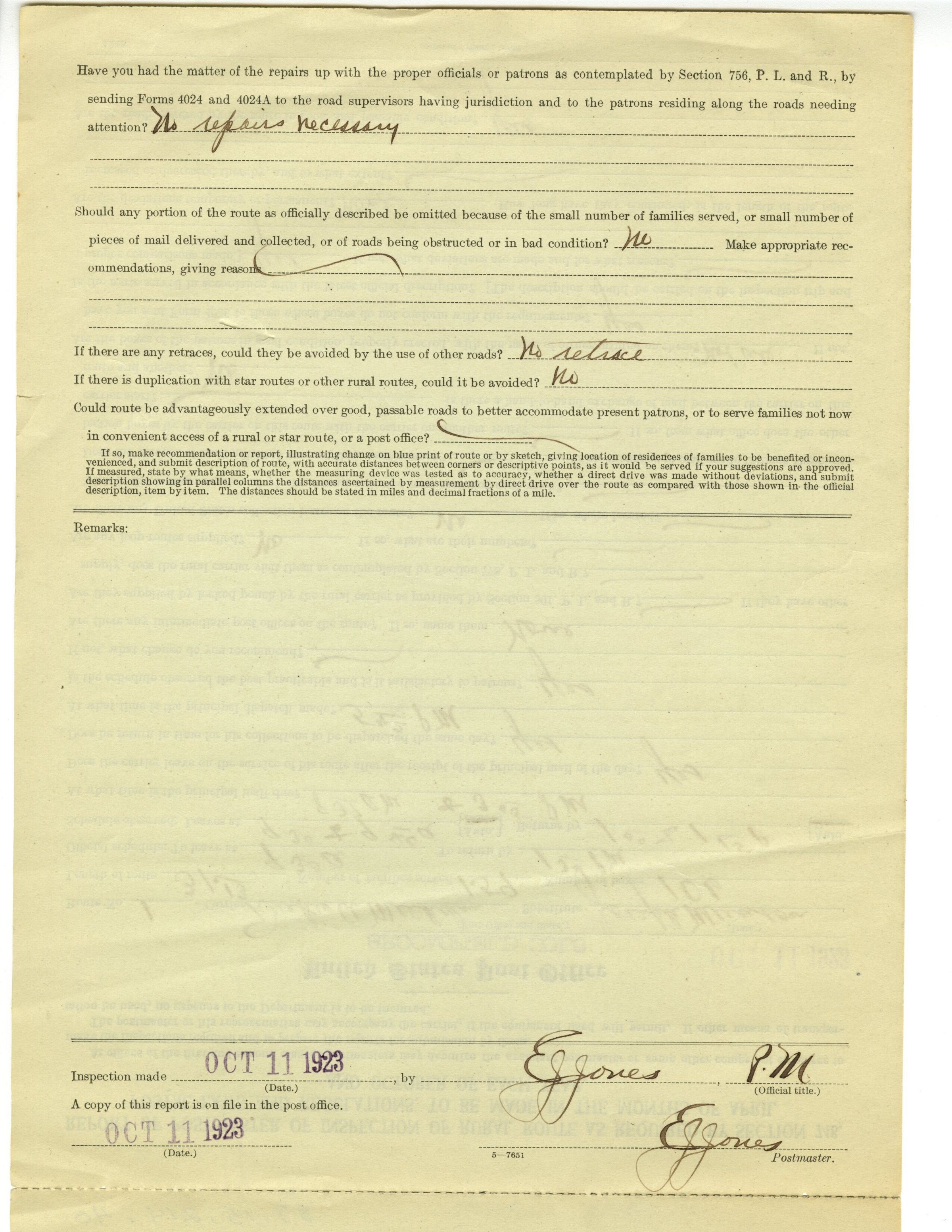 Two pages (attached), questions answered and notes made, signed Postmaster EJ Jones.Collection