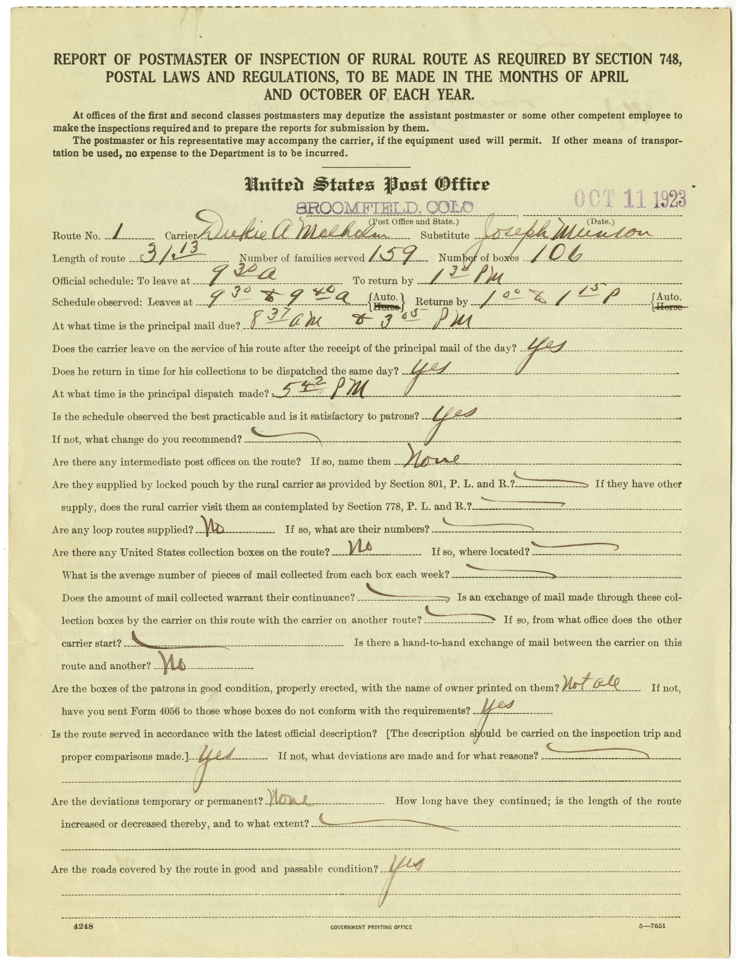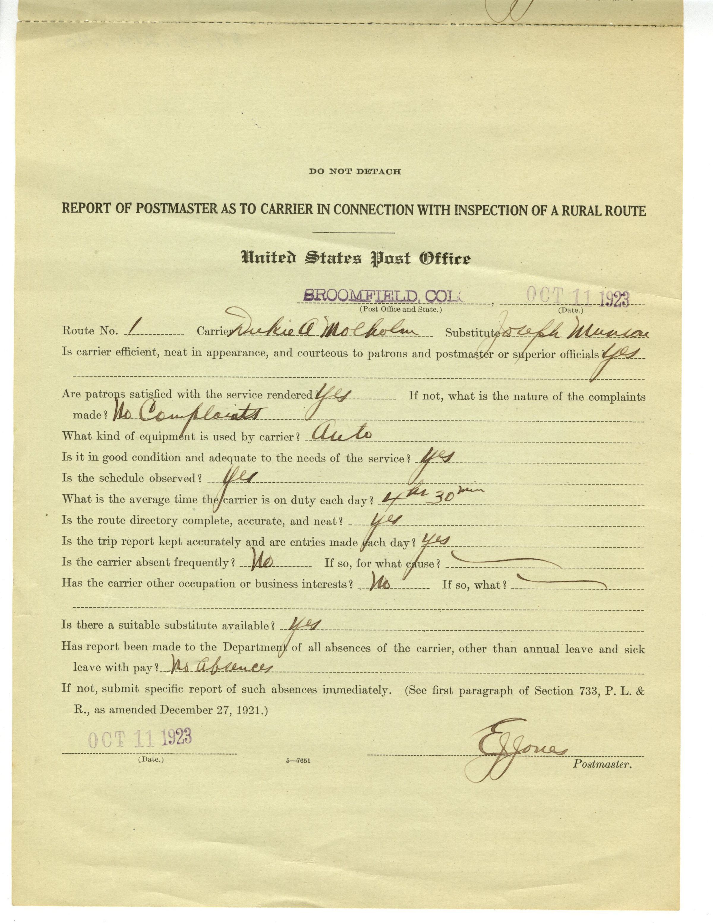 Dated Oct 11, 1923 for Mail Carrier Dukie A Molholm, Route no. 1.