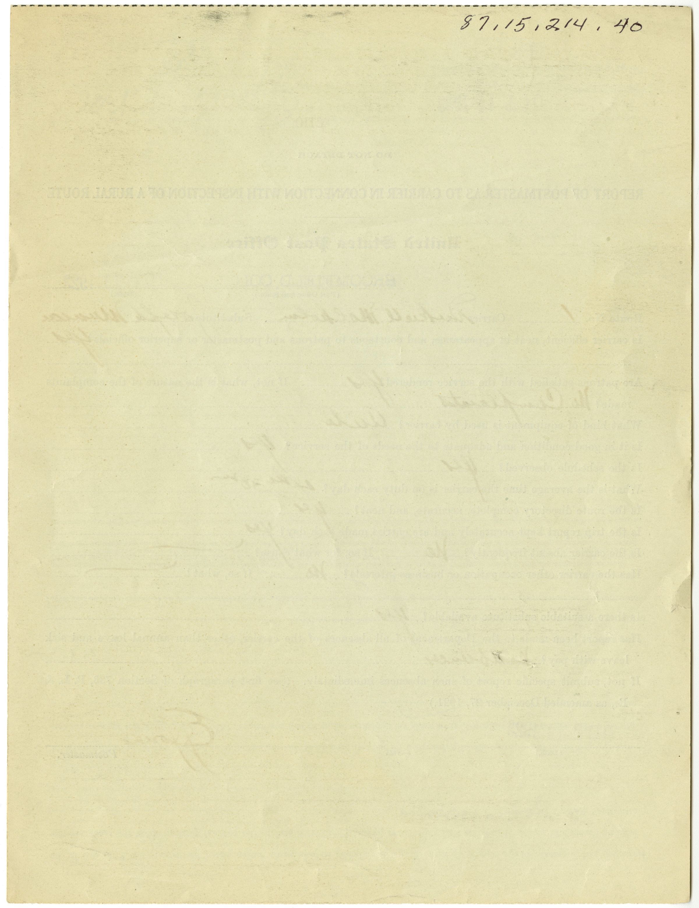 Report of Postmaster of Inspection of Rural Route as Required by Section 748, Postal Laws and Regulations, to be Made in the Months of April and October of Each Year.