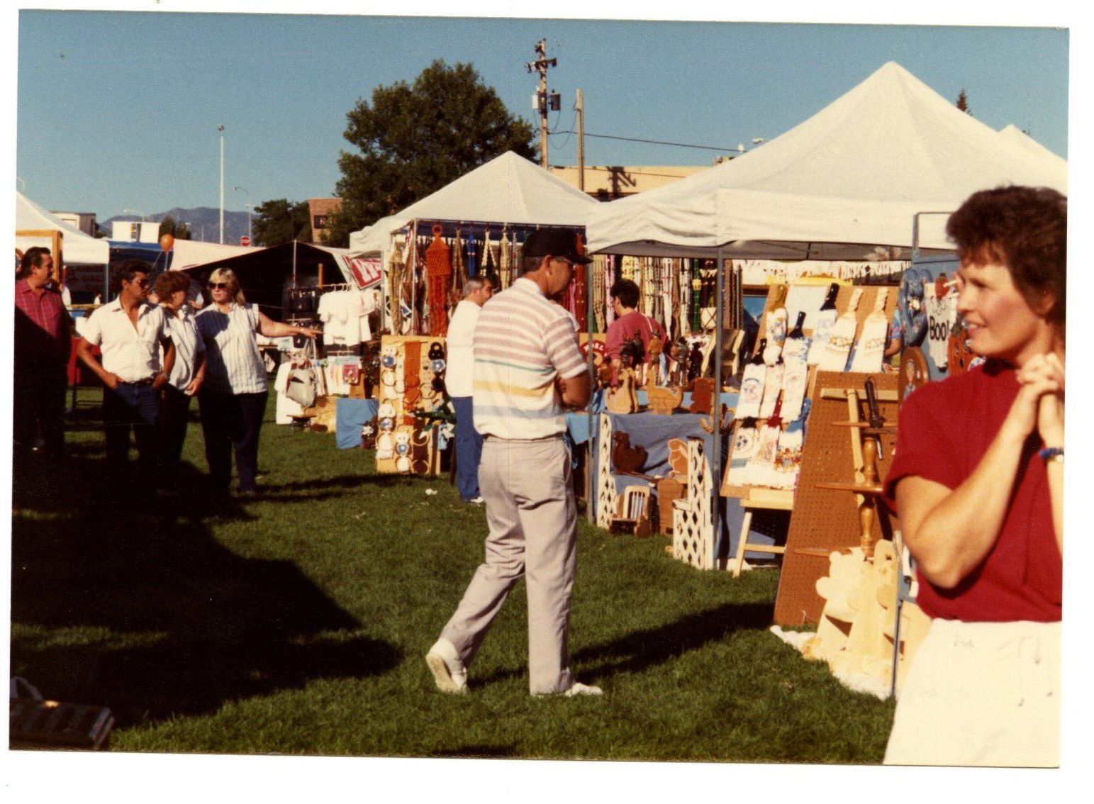 Item is a photograph printed on Kodak paper taken during the 1989 Broomfield Days event. In the photo, people are browsing booths set up beneath white tents. Most of them house arts and crafts and are set up in a grassy field. A man in a white striped shirt, gray pants, and a baseball cap admires one of the displays, and at the right, a woman in a red shirt folds her hands as she looks around. Trees and a faint mountain view under the blue sky complete the picture.Photograph Details