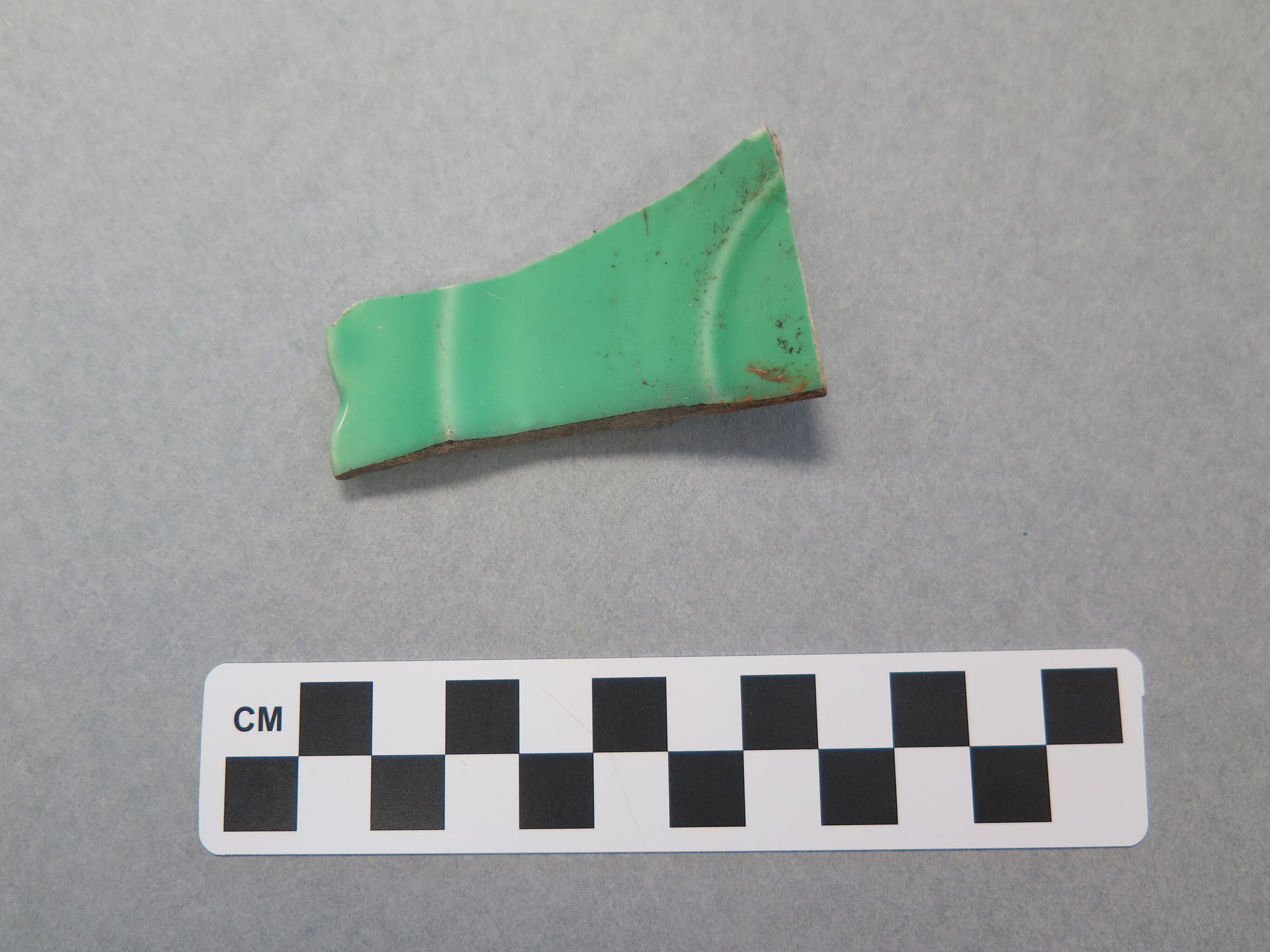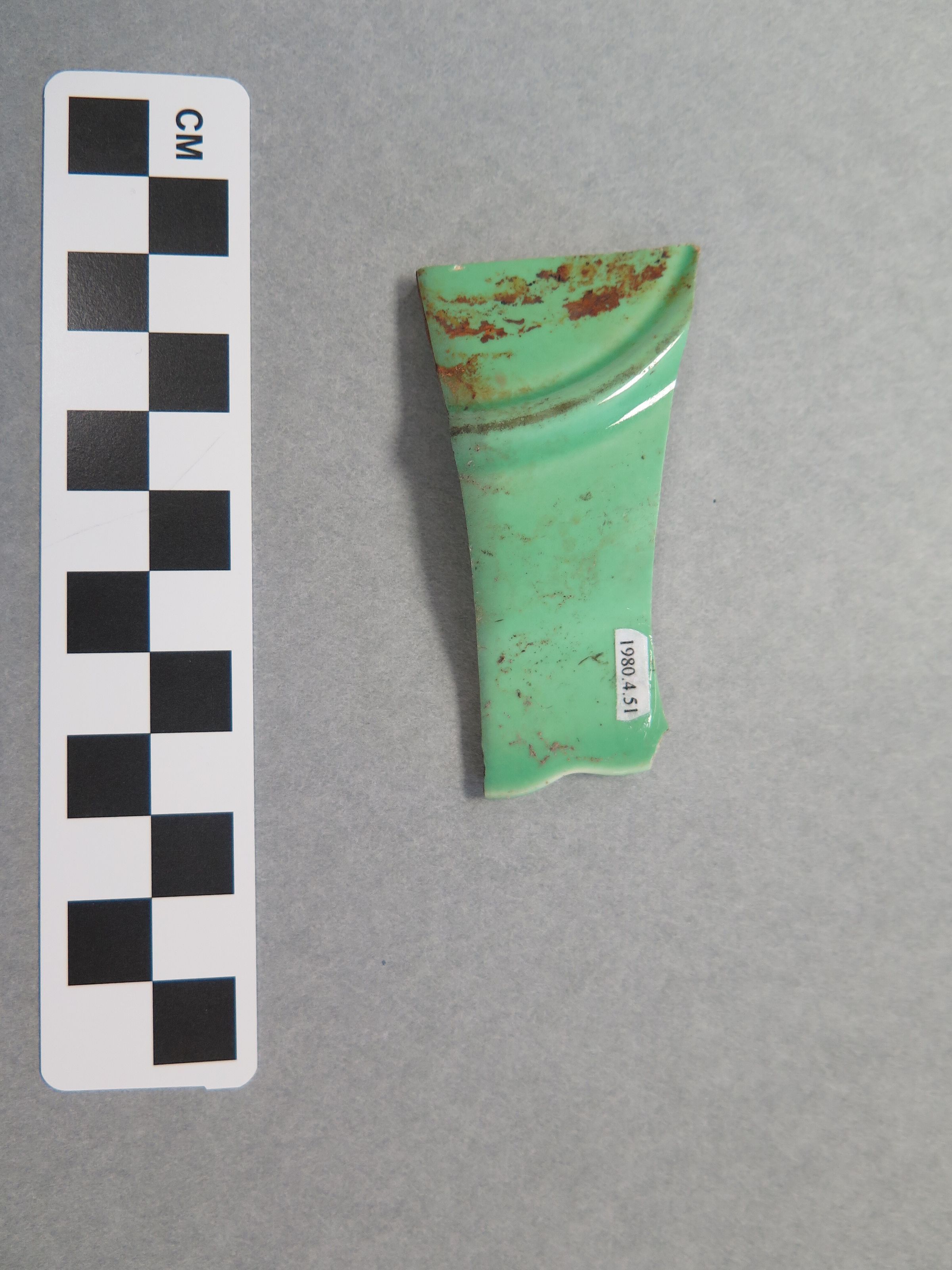 This is a fragment of a green ceramic saucer. It is the same pattern as 1980.4.50, but it is unclear if the fragments are from the same saucer or different saucers in the same set. The fragment has a scalloped edge and a flat ring in the center were a cup would have been placed. The saucer fragment measures .25" (h) x 1.5" (w) x 2.75" (l).