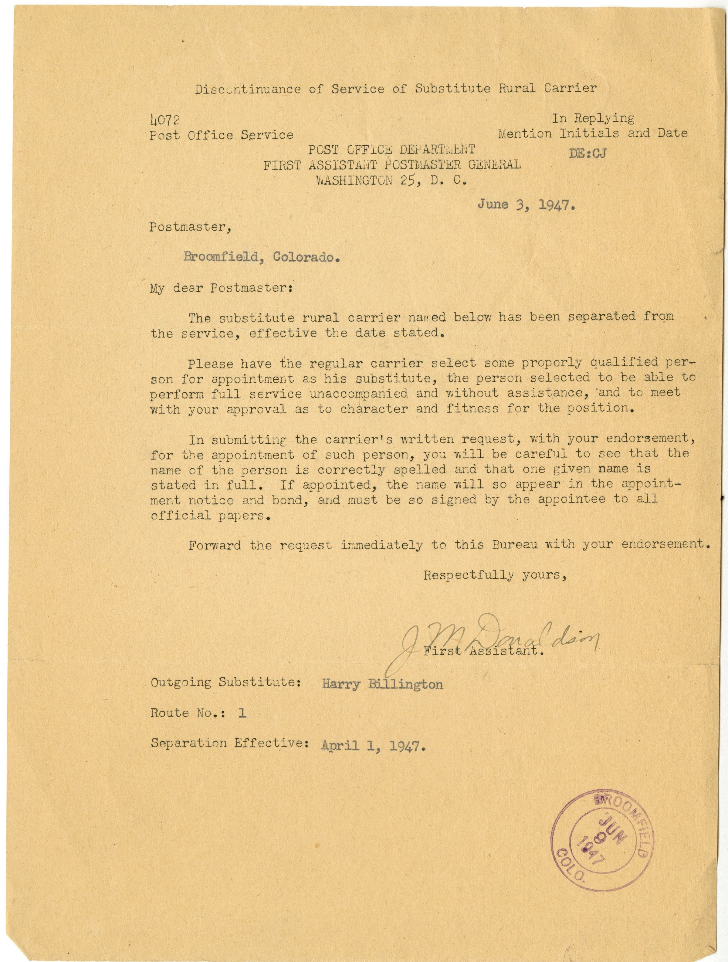 Dated June 3, 1947, addressed to the Postmaster, Broomfield, Colorado.