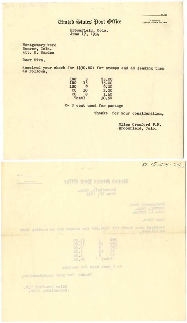 A: United States Post Office, Broomfield, Colo. June 17, 1954. Montgomery Ward, Denver, Colo. Att. R. Darden. "Dear Sirs, Received your check for ($30.60) for stamps and am sending them as follows,