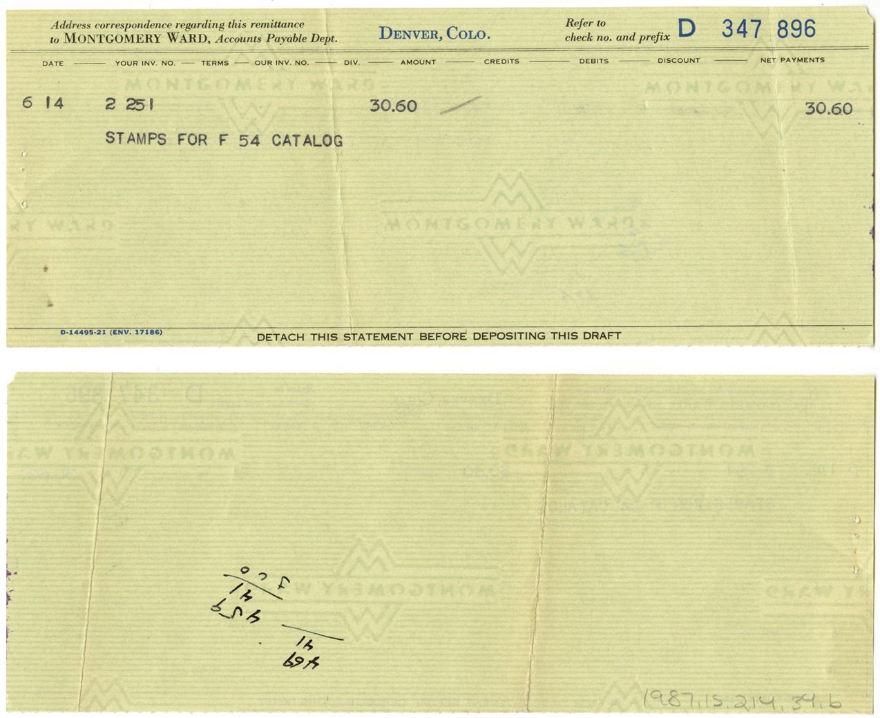B: Bank statement for $30.60. Stamps for F 54 Catalogs. Check no. D 347 896.