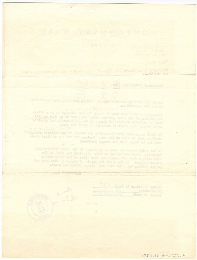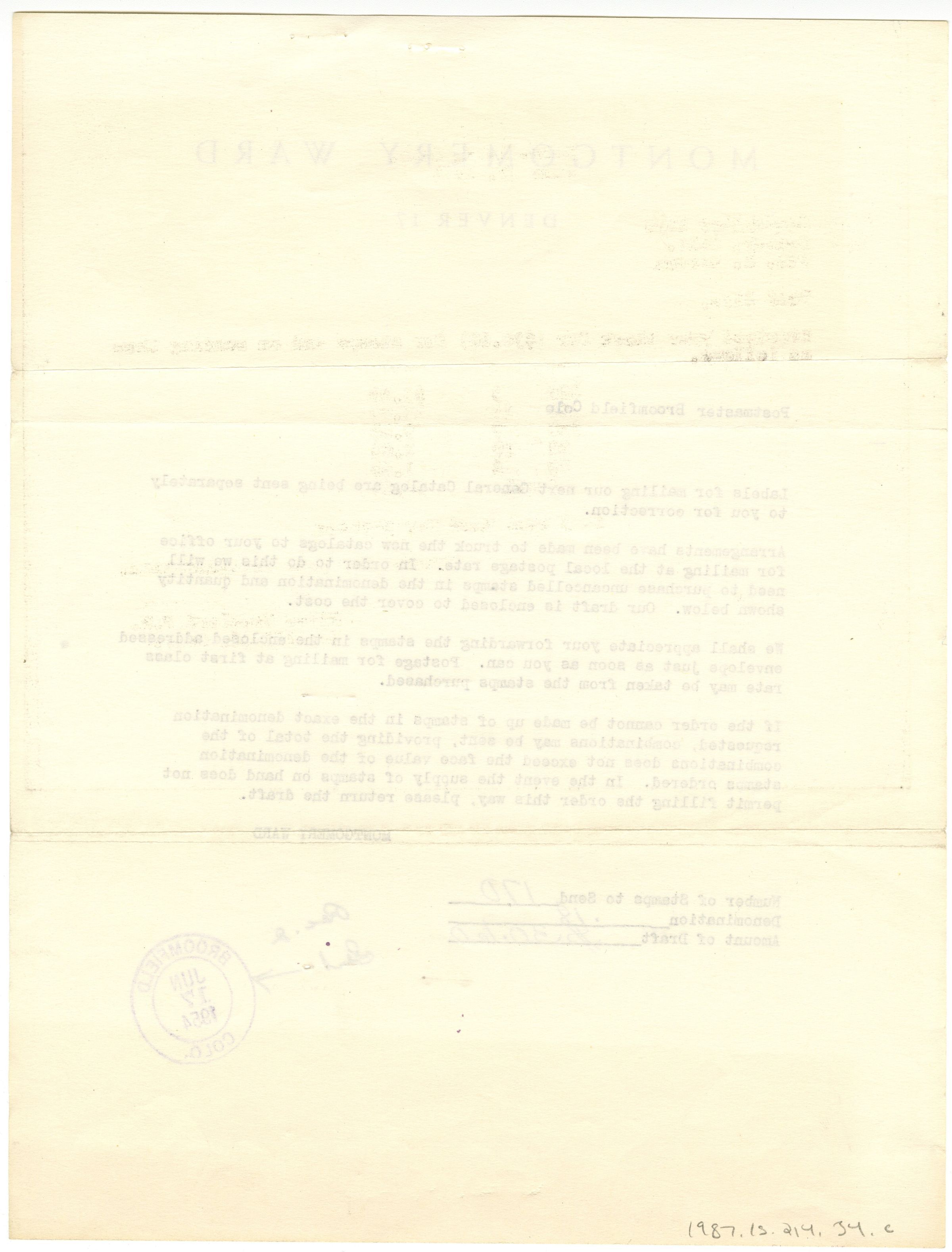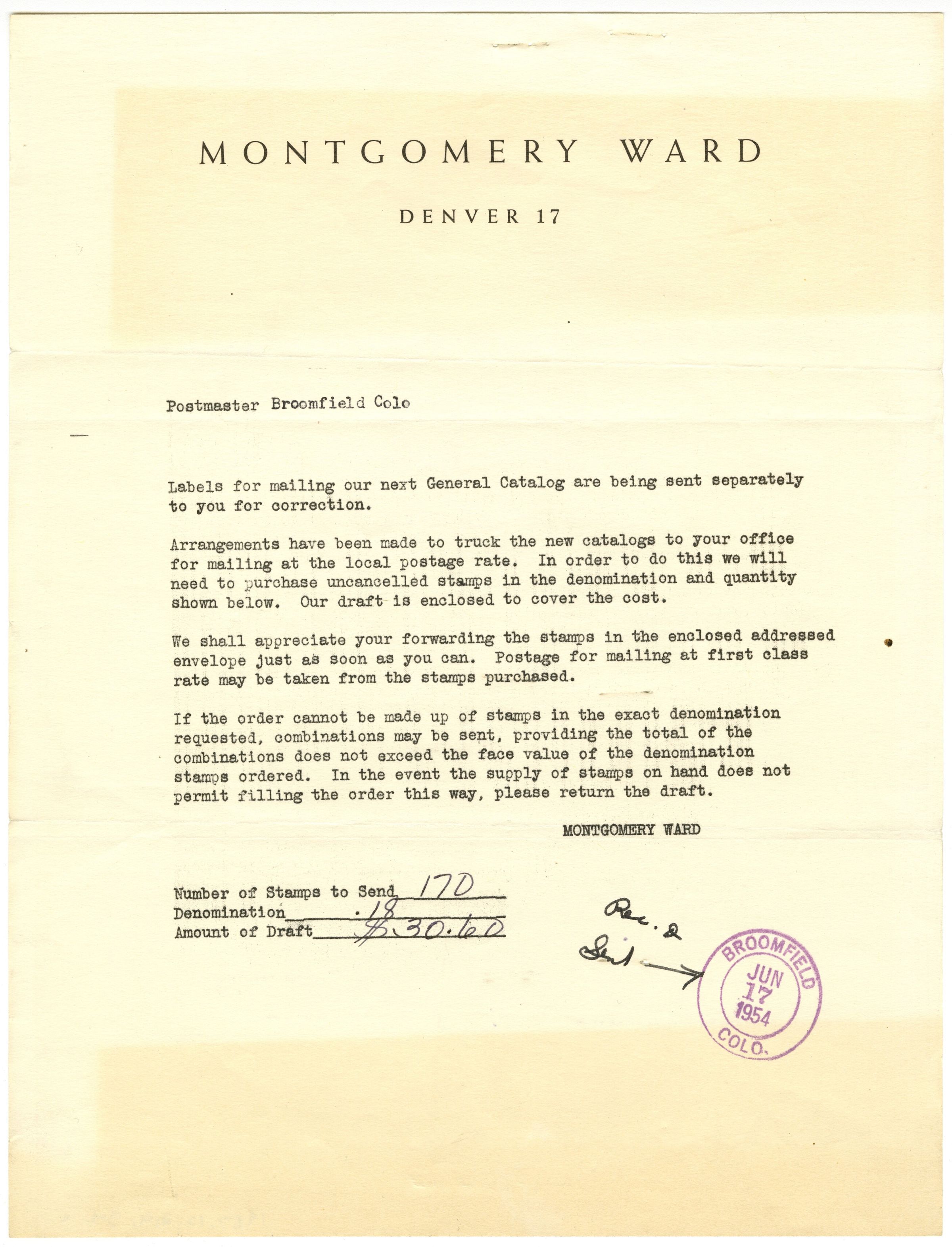 C: Montgomery Ward, Denver 17. Addressed to the Postmaster, Broomfield, Colo. Requesting stamps to send catalogs. Stamped at bottom in purple: Broomfield, Colo. Jun 17, 1954.Collection