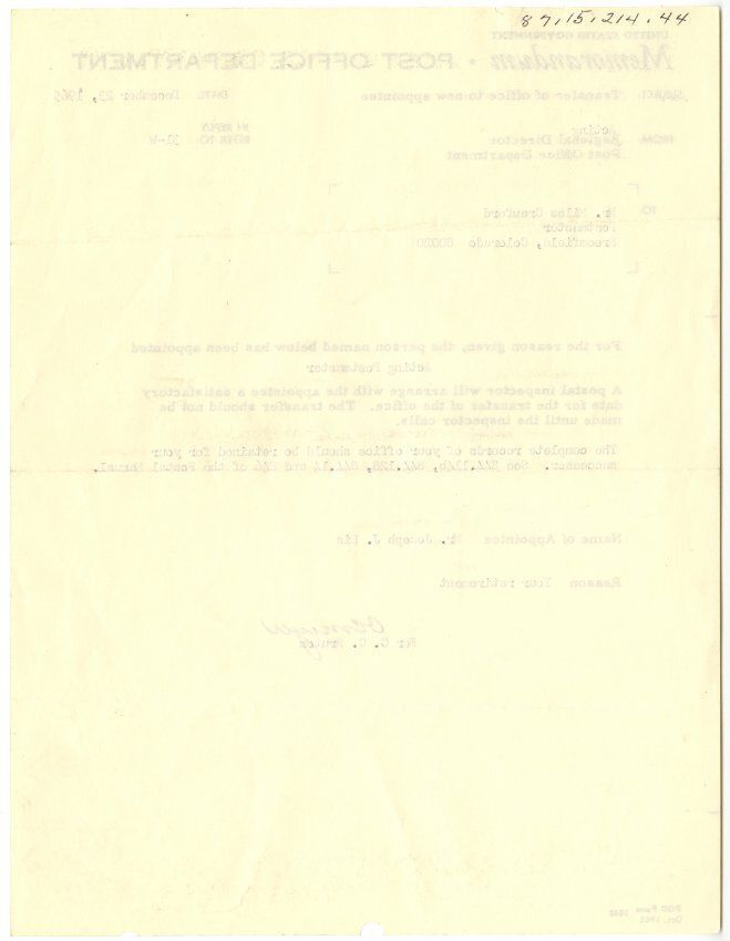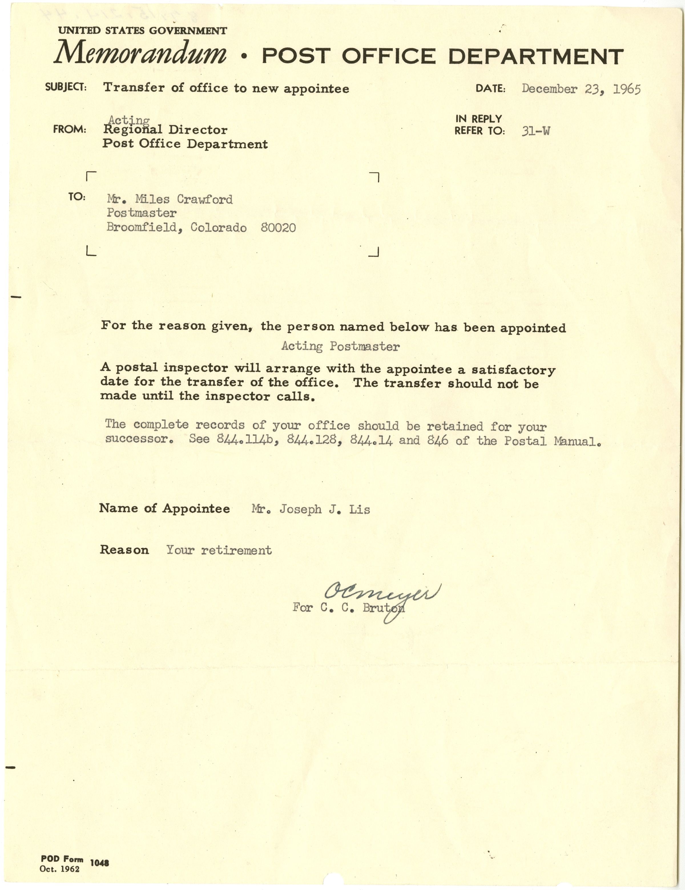 A memo fromt he Post Office, regarding a transfer of office to new appointee. Dated Dec 23, 1965. Naming Mr. Joseph J. Lis as actign postmaster on the retirement of Miles Crawford.