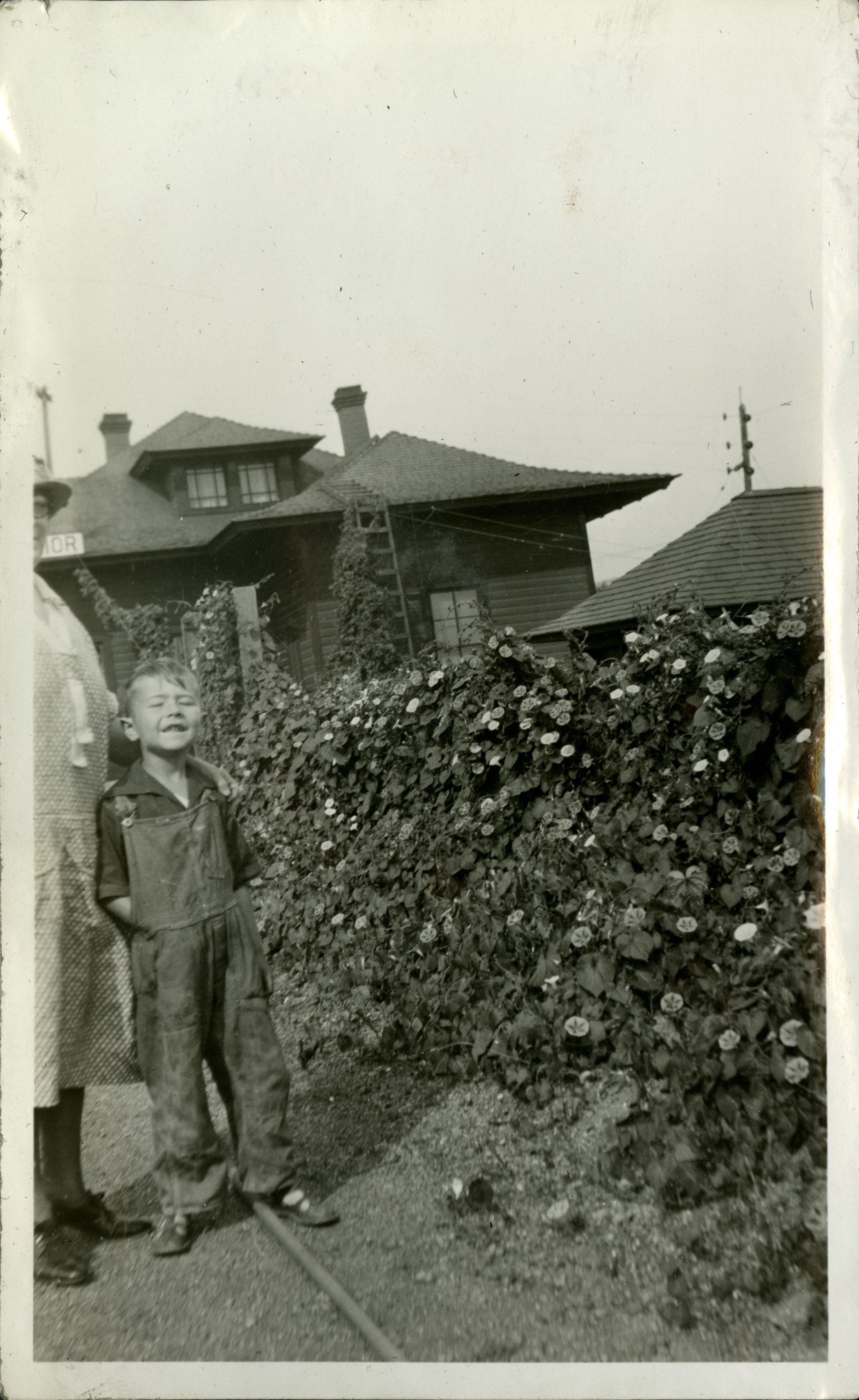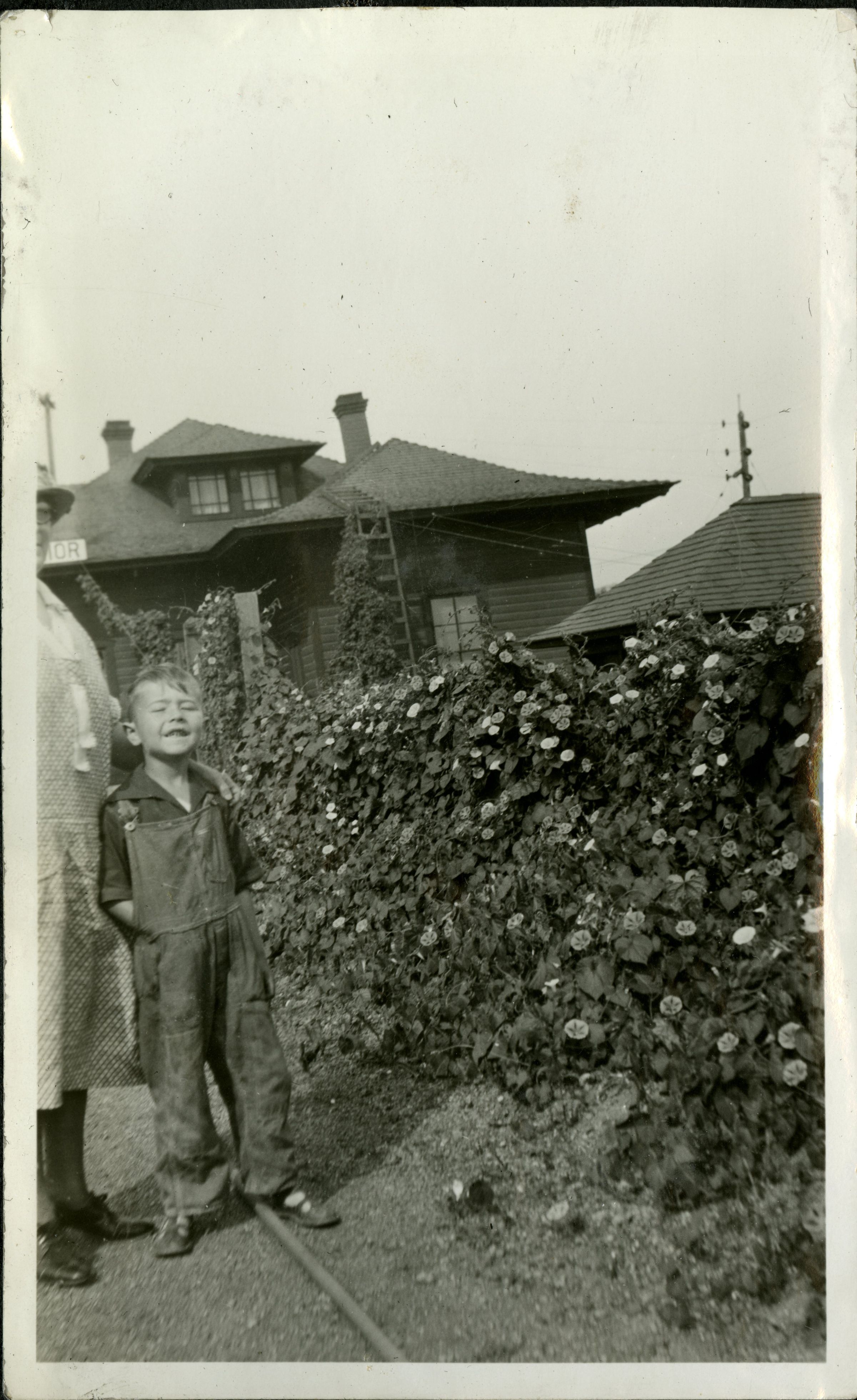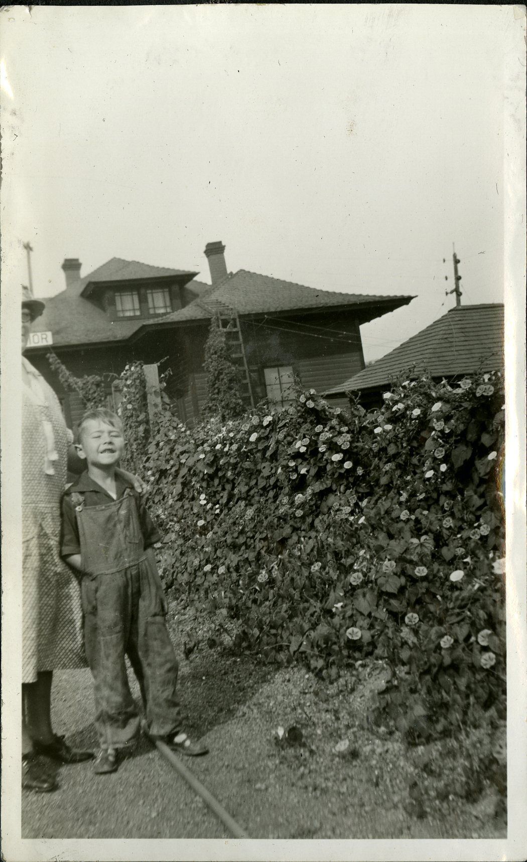 Scanned photograph of Robert Hillen posing with grandmother Jeanie Malott Hillen next to Jeanie's prized Clematis plants growing out from the Superior train depot, circa 1928. Robert was the grandson of the Superior Depot agent, who was also named Robert. Robert is wearing overalls with suspenders and a shirt. Jeanie is barely visible on the left edge of the image with a patterned dress and hat. Clematis can be seen growing on the depot sign marked "Superior," as well as on the fence, ladder, and roof, to the right and in the background.Photograph Details