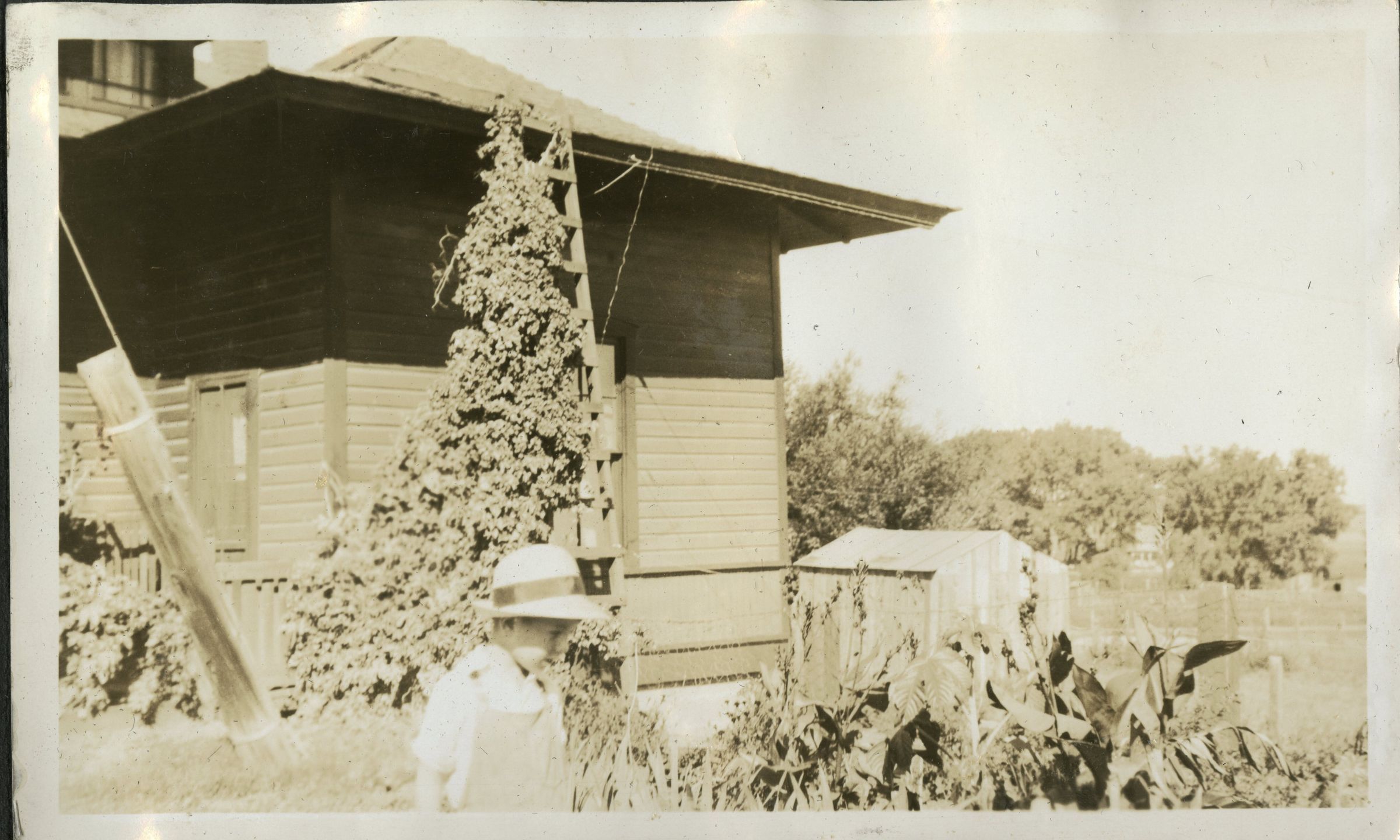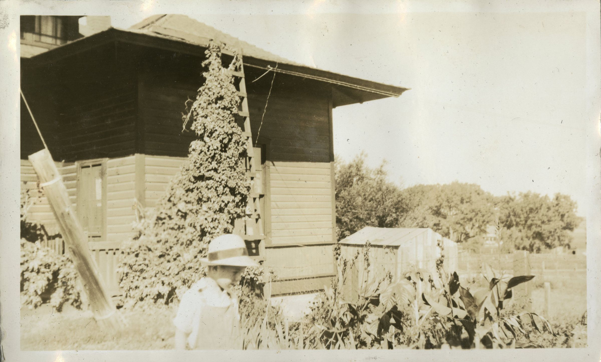 Scanned photograph of Robert Hillen walking in the yard in front of the Superior train depot, circa 1928. Robert was the grandson of the Superior Depot station agent, who was also named Robert. He is wearing overalls, a light shirt, and a small straw hat with a band. His grandmother Jeanie Hillen's prized Clematis plants are seen growing up the side of the Superior depot and ladder, with various other plants growing in the yard itself. A shed is also visible in the background.Photograph Details