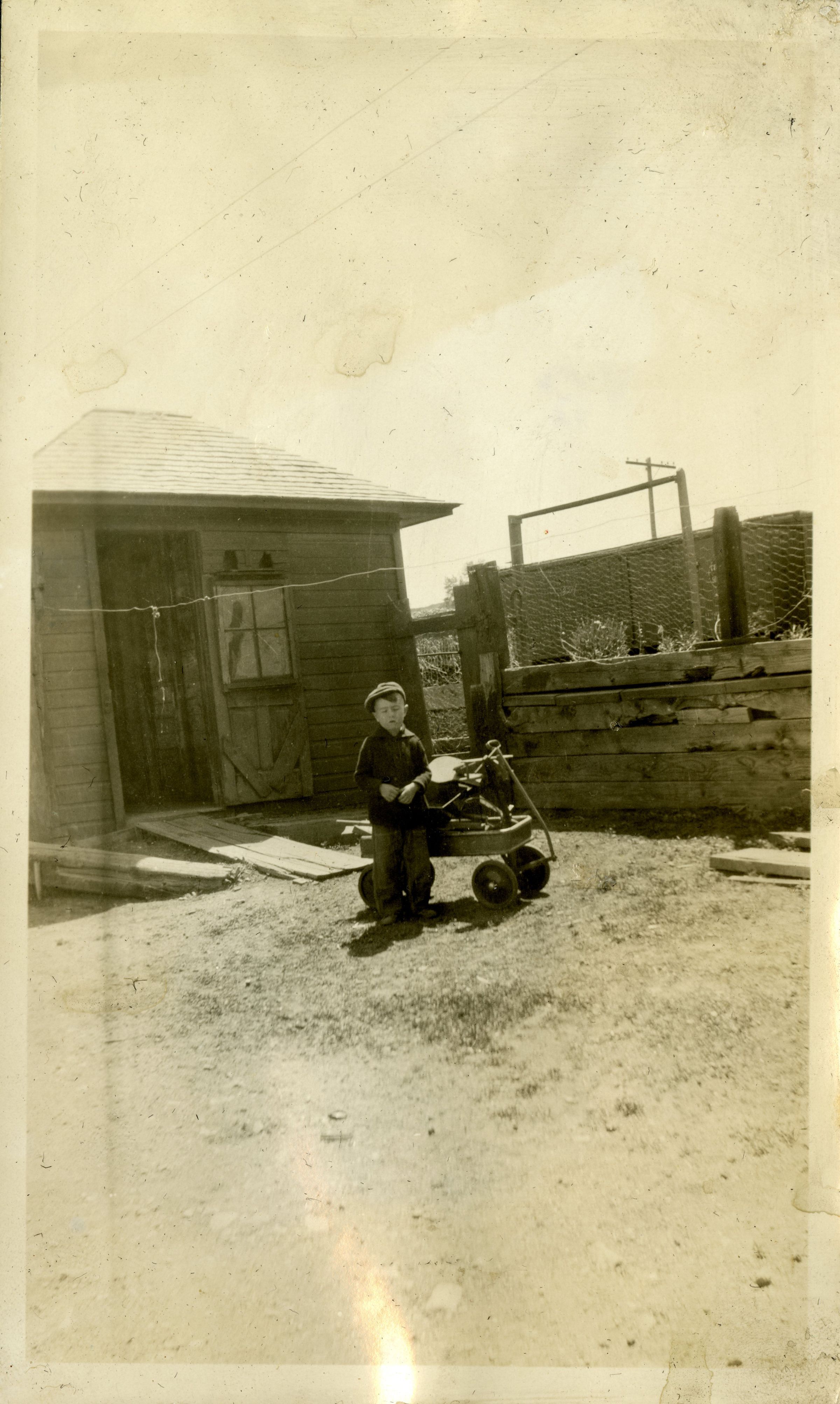 Robert Hillen playing in front of a shed at the Superior train depot with a wagon, 1927. Robert was the grandson of the Superior Depot station agent. who was also named Robert. Robert is seen in dark pants and a shirt with a newsboy cap next to a toy wagon, with a shed, fence, and clothes line behind him.Photograph Details