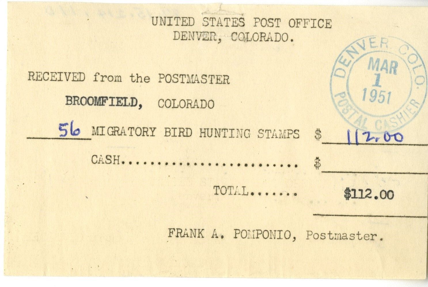 Received from the Postmaster, Broomfield, Colorado. 56 Migratory Bird Hunting Stamps $ 112.00.