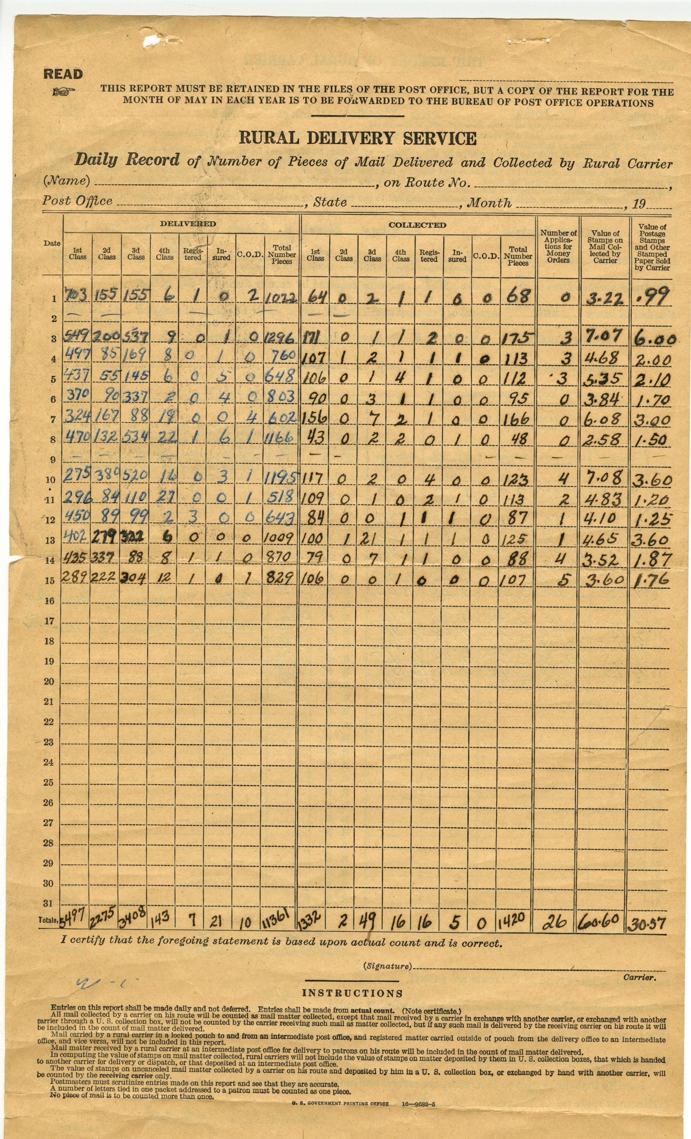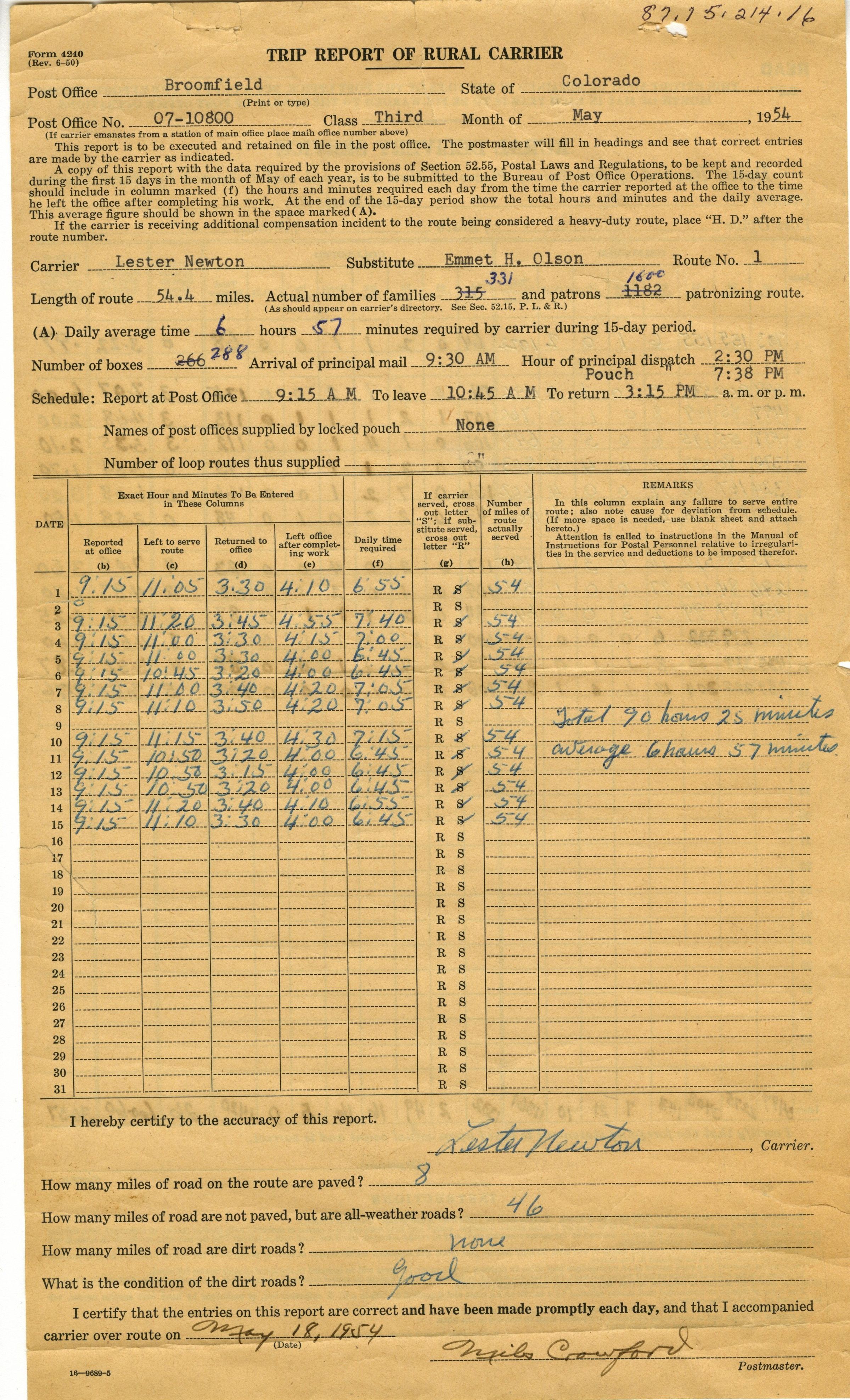 Rural Delivery Service, Daily Record of Number of Pieces of Mail Delivered and Collected by Rural Carrier. On back, Trip Report of Rural Carrier, Dated May 1954, signed Miles Crawford.Collection