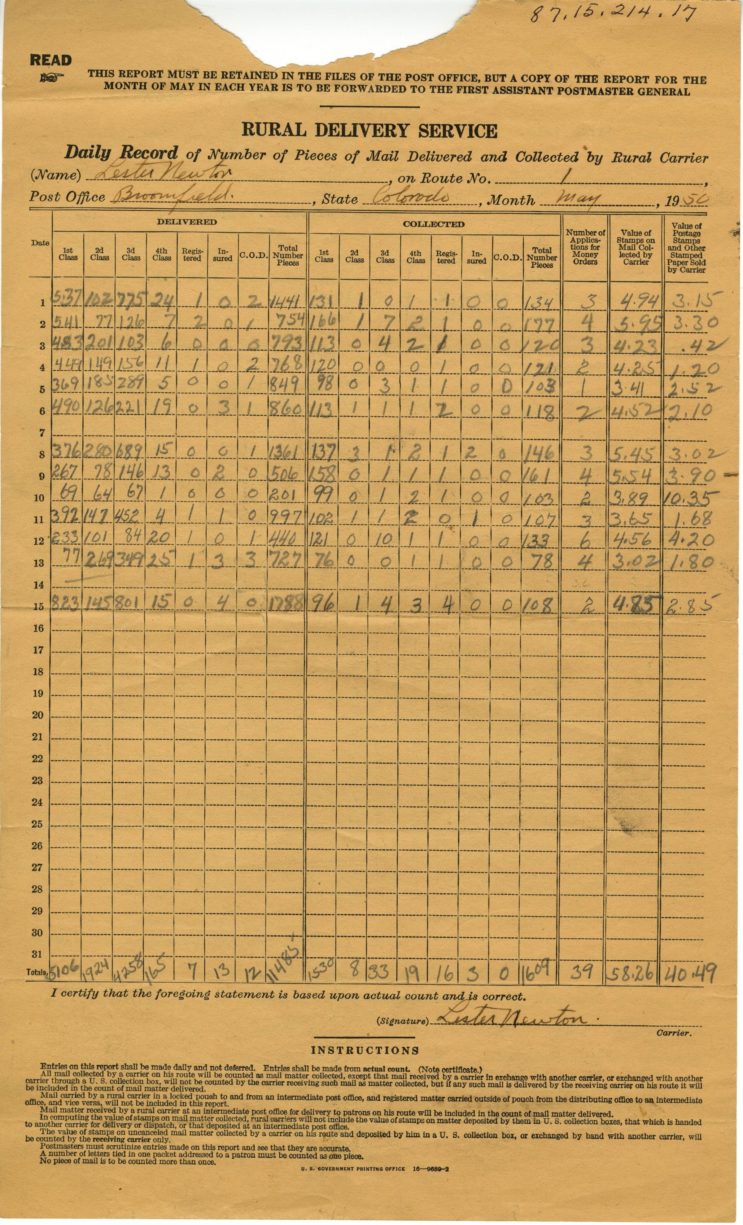 Rural Delivery Service, Daily Record of Number of Pieces of Mail Delivered and Collected by Rural Carrier. On back, Trip Report of Rural Carrier, Dated May 1950, signed Miles Crawford.Collection