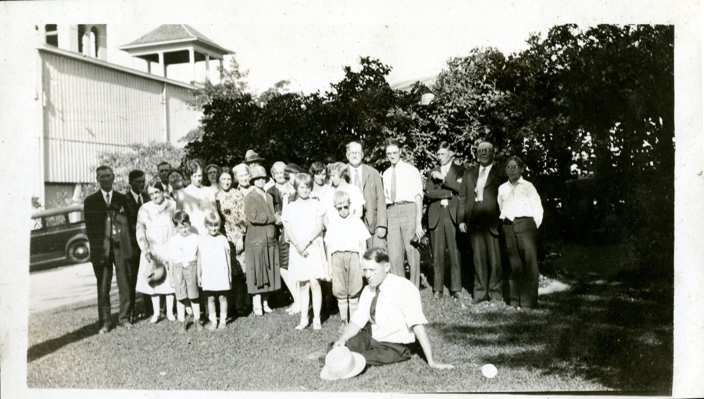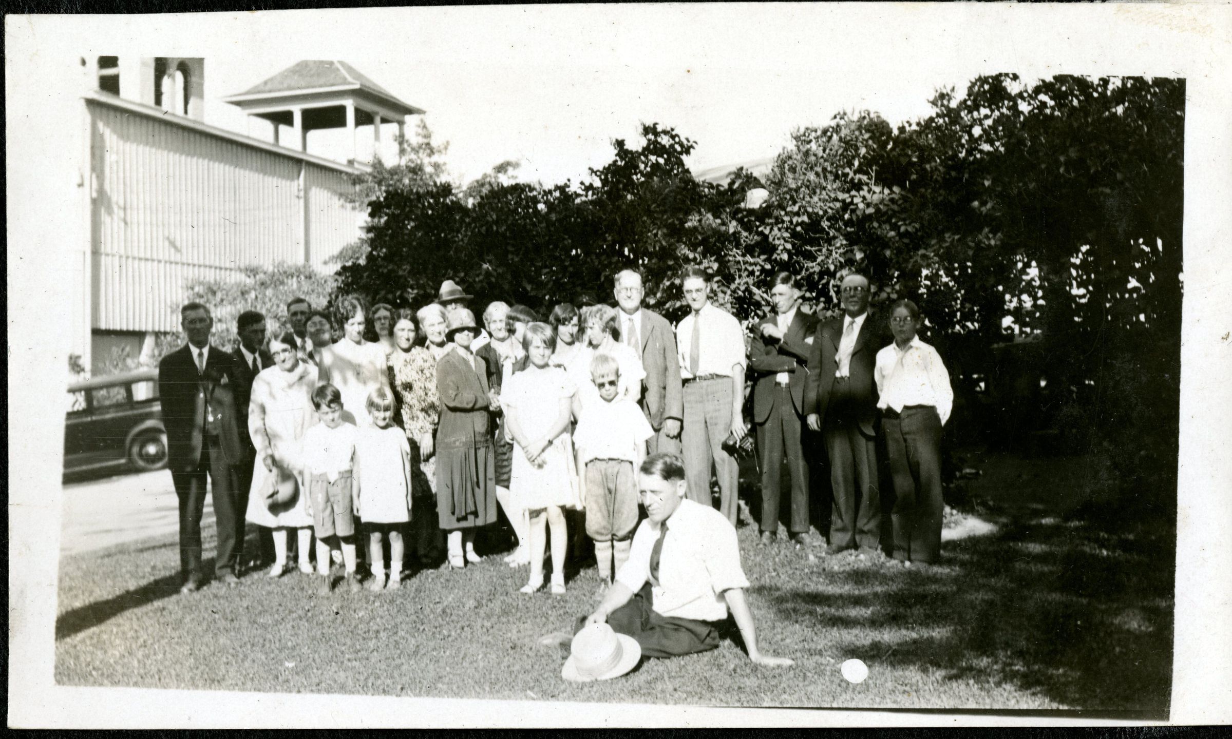 Scanned photograph of the Hillen family posing with various friends and acquaintances at a Chautauqua in Boulder, Colorado, circa 1928. Chautauquas were popular lectures and forums prevalent in the late nineteenth and early twentieth centuries which focused on education and discussion of events, culture, and entertainment. The Hillens attended Chautauquas multiple times. Hillen family members in the photograph include Roger Hadley Hillen (front, sitting), Jeanie Hillen (2nd row, 2nd from left), Robert Hillen (Jeanie's grandson) and sister Rose Hillen (2nd row, 3rd and 4th from left), and Superior station agent Robert Hillen (back row, 5th from right). Roger was the son of Robert and Jeanie Hillen, father of siblings Robert and Rose Hillen. He worked as an accountant with the C&S Railroad.Photograph Details