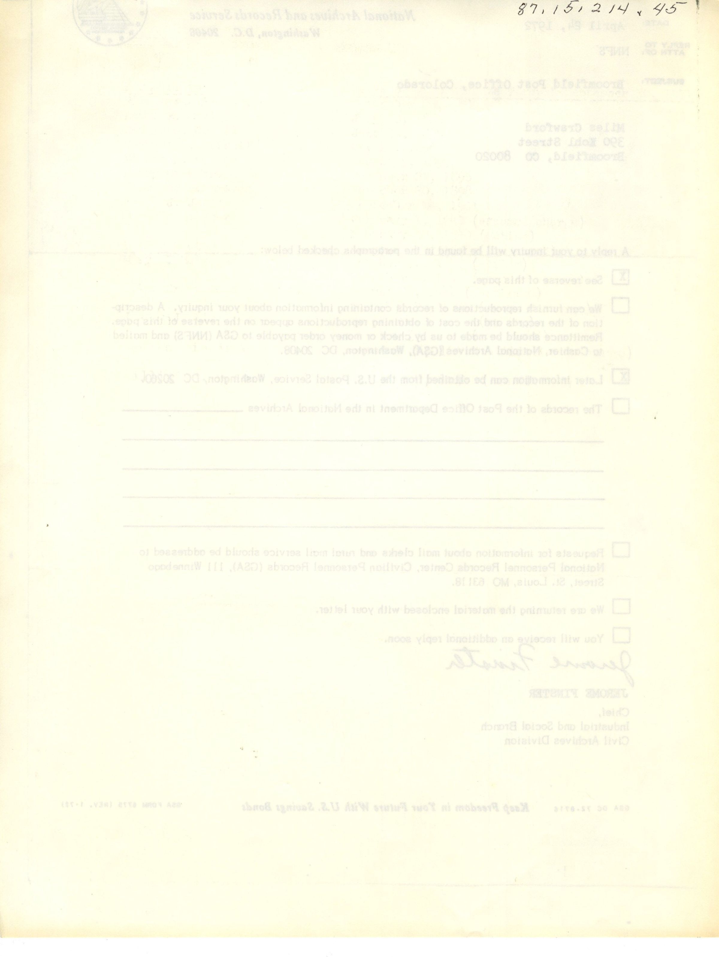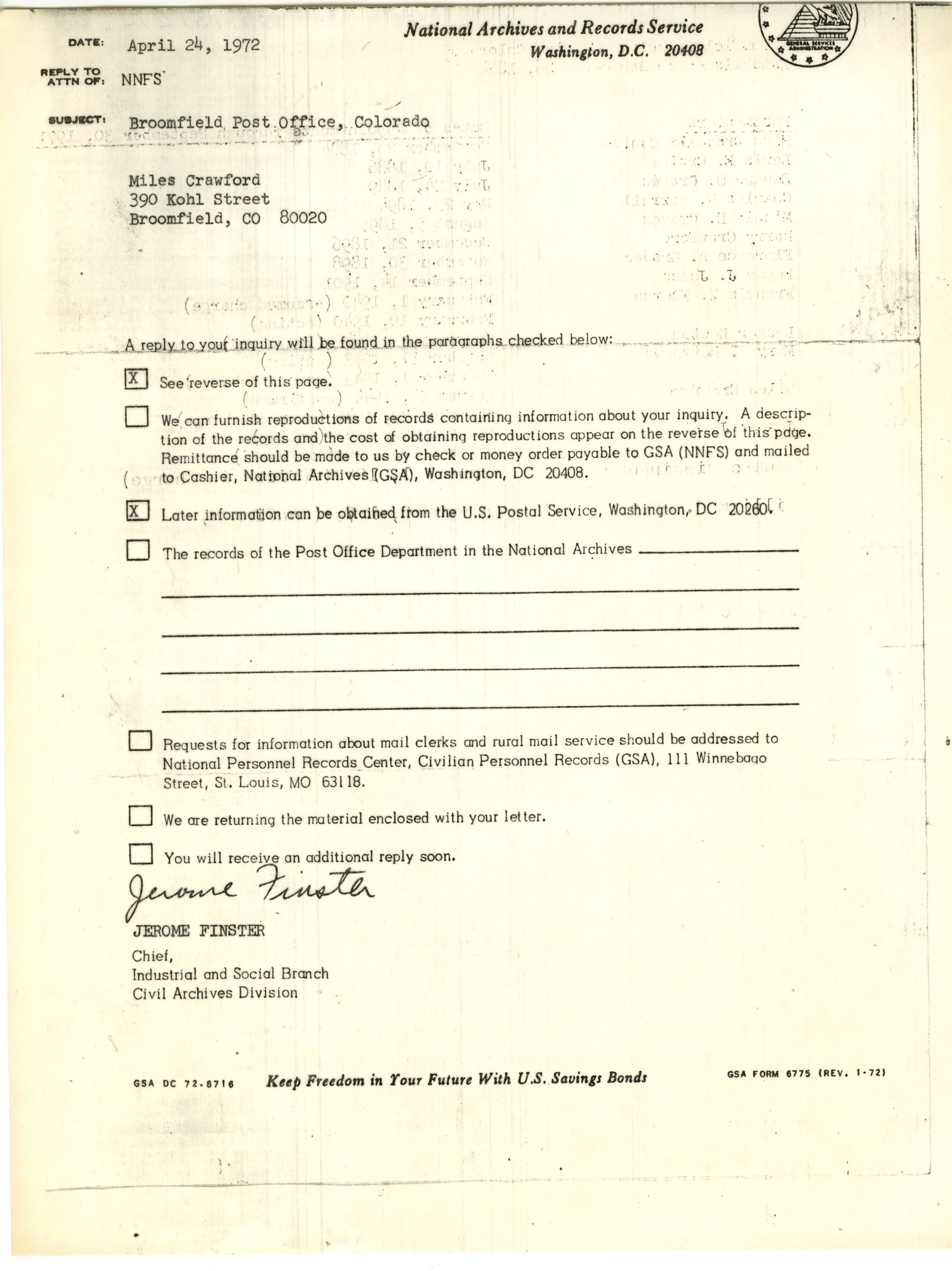 National Archives and Records Service report, regarding the Broomfield Post Office, Colorado. Addressed to Miles Crawford, 390 Kohl Street, Broomfield, CO 80020. Dated April 24, 1972.Collection