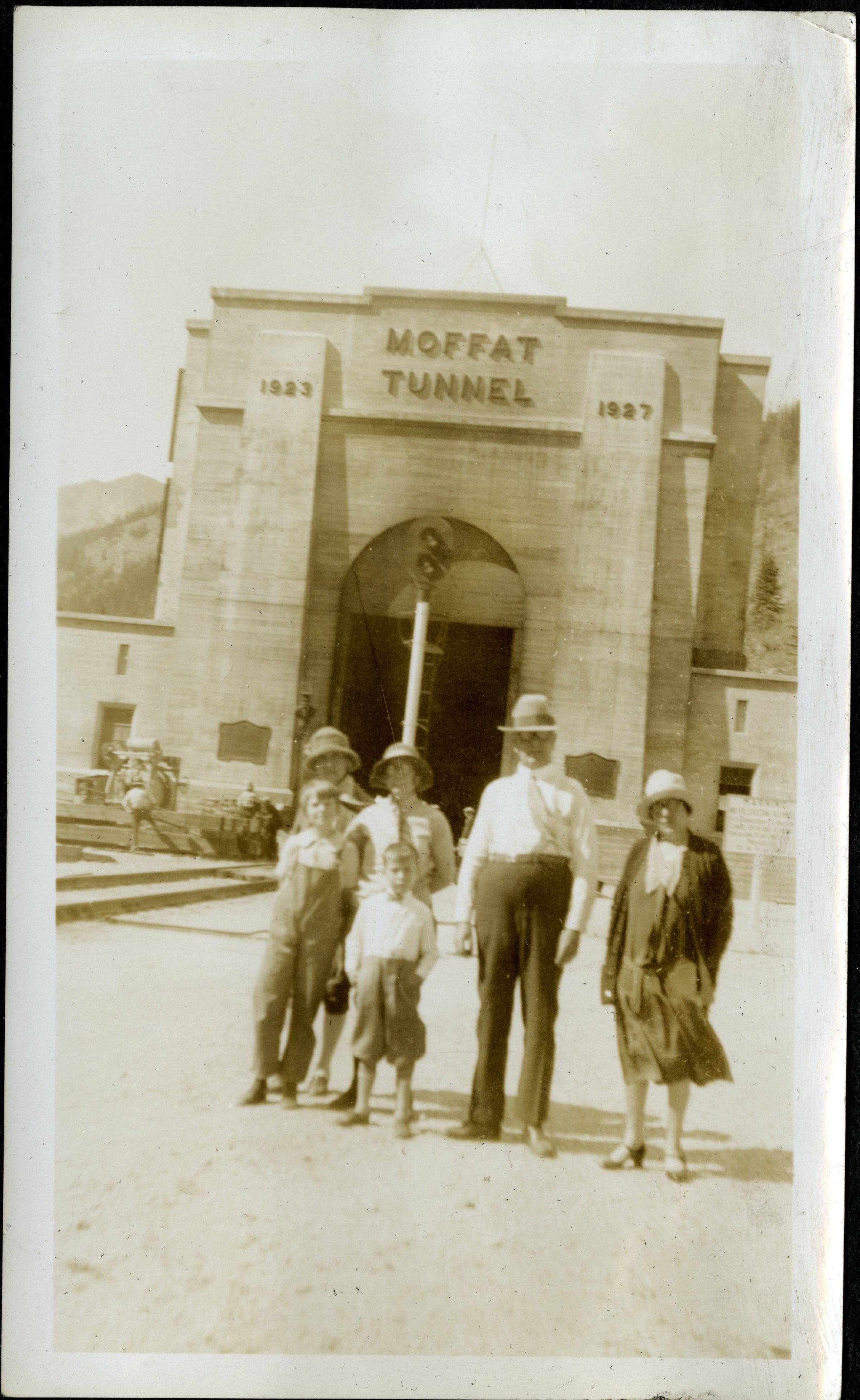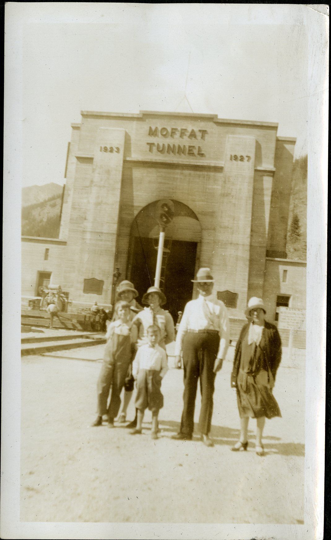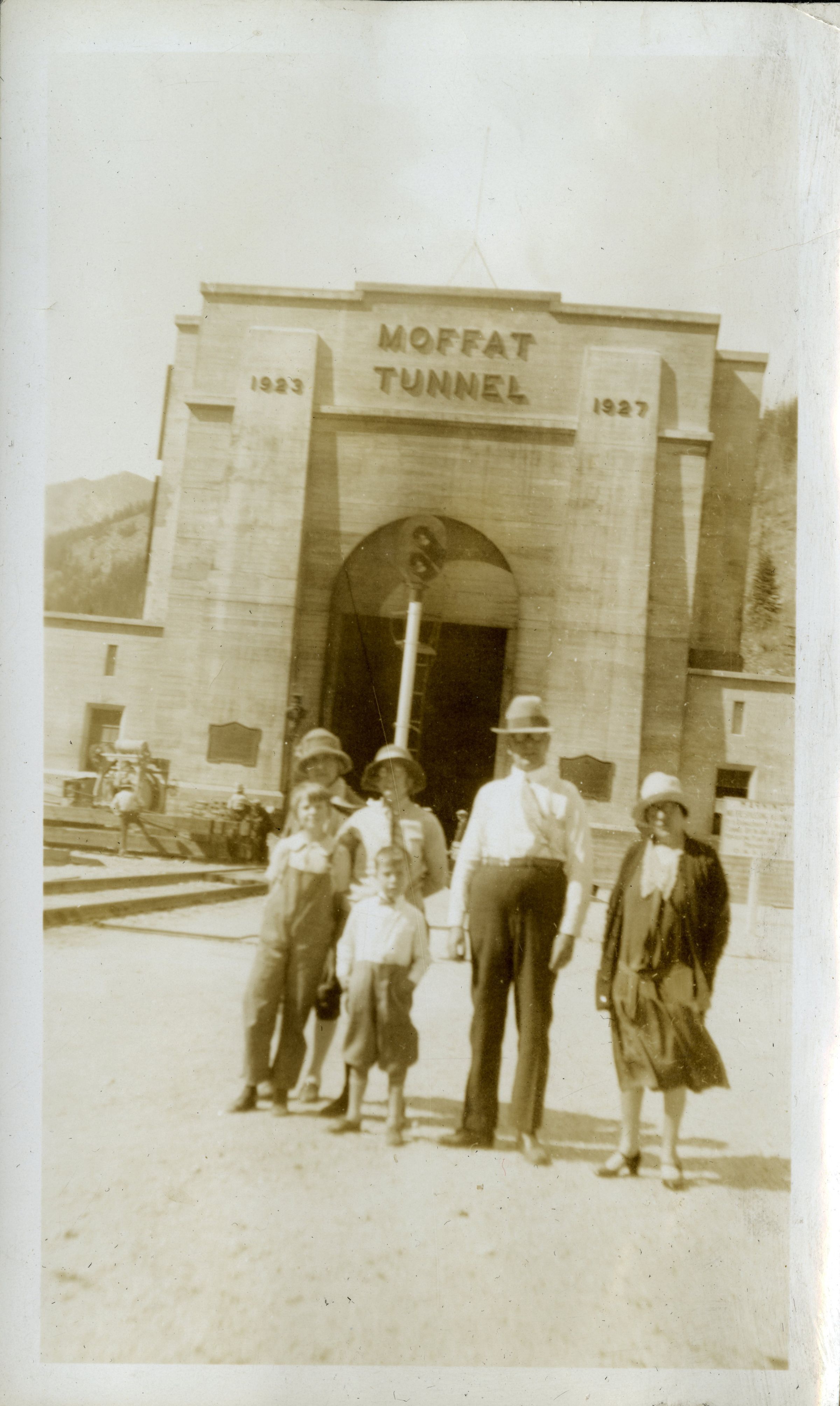 Scanned photograph of the Hillen and Hicks family trip to Moffat Tunnel, circa 1928. Back, left to right: Rosina Jane "Rose" Hillen Hicks, Lois Hicks, Superior station agent Robert Hillen, Jeanie Hillen. Front, left to right: Dora Hicks, Robert Hillen. Rosina Hicks was station agent Robert Hillen's sister. Lois Hicks was Rosina's daughter-in-law, and Dora was Lois' daughter. Children Dora Hicks and Robert Hillen were cousins. The East entrance to Moffat Tunnel can be seen clearly behind the family. The letters above the tunnel read, "Moffat Tunnel," "1923," "1928." Named for railroad industrialist David Moffat, the tunnel served as a route through the Continental Divide from Denver, for both train traffic and water flow.Photograph Details