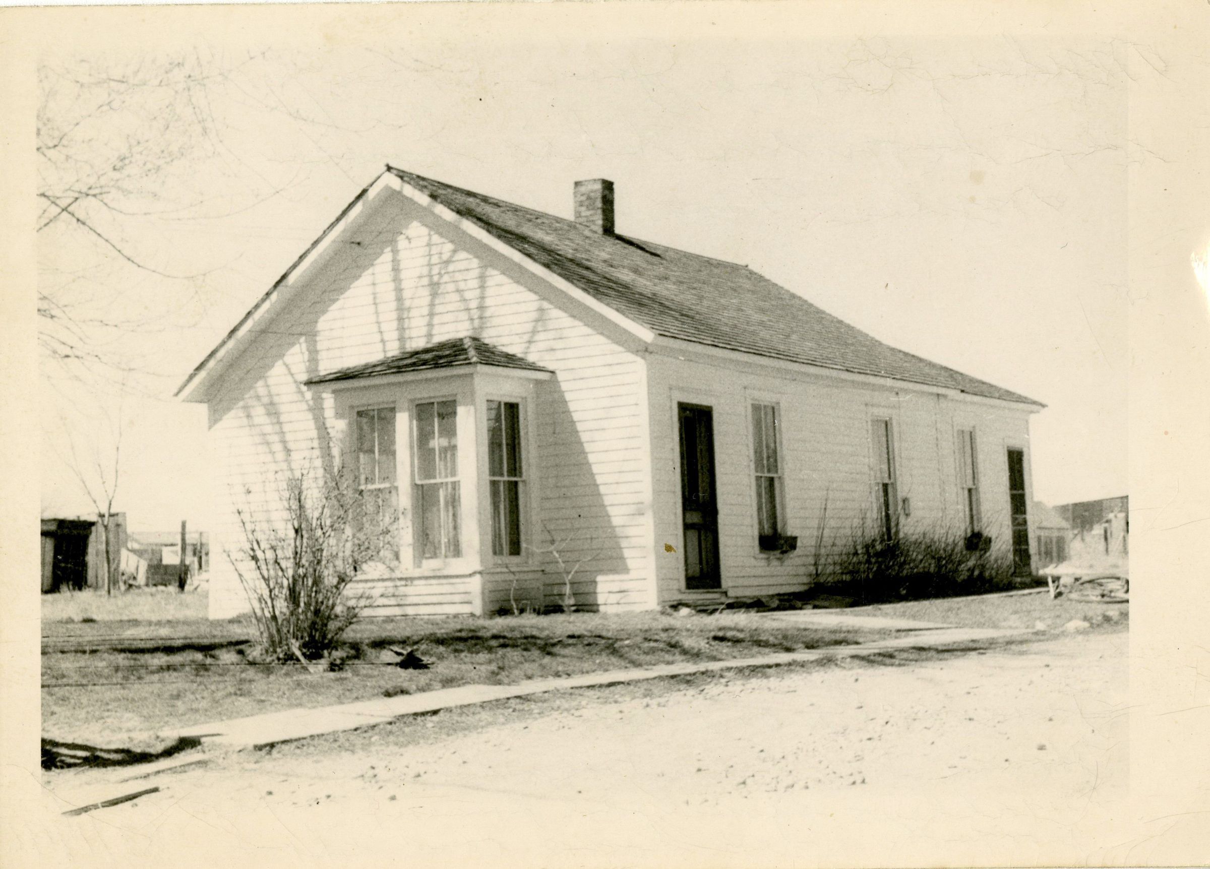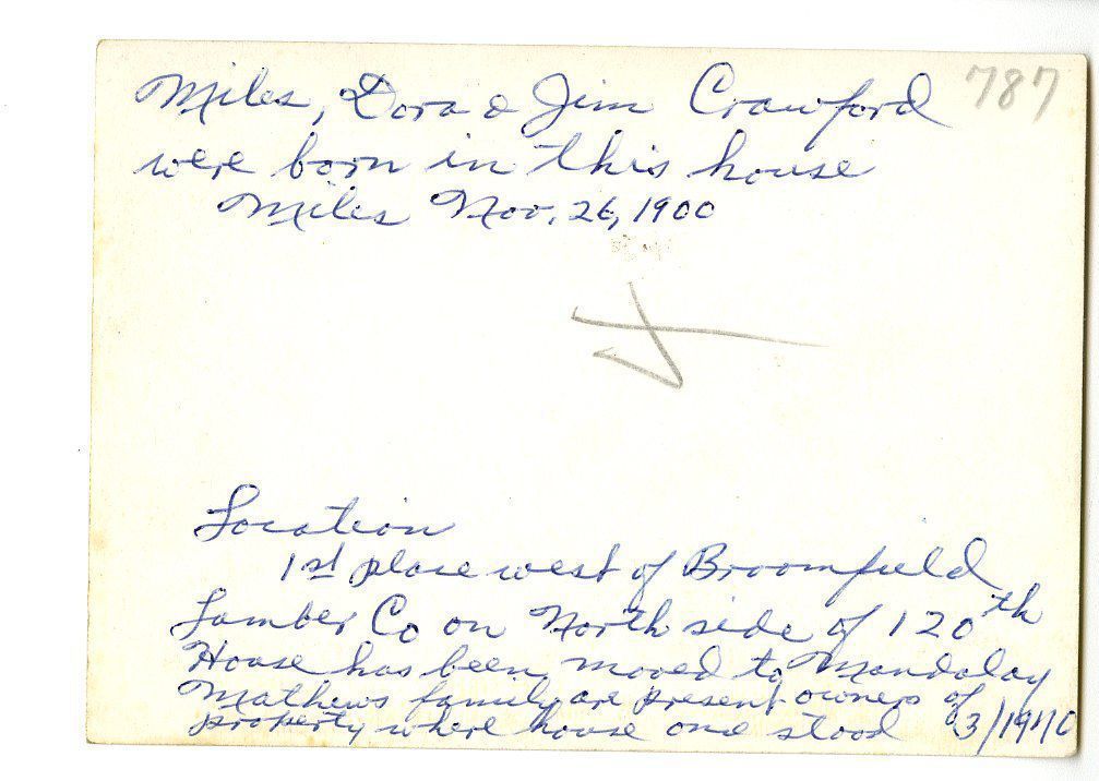 Photograph of the house where Miles Crawford, Dora Ada Crawford, and Jim Crawford were born. It was the first place west of Broomfield Lumber Co. on the north side of 120th. House later moved to Mandalay. At time of donation the Mathews family owned the property.