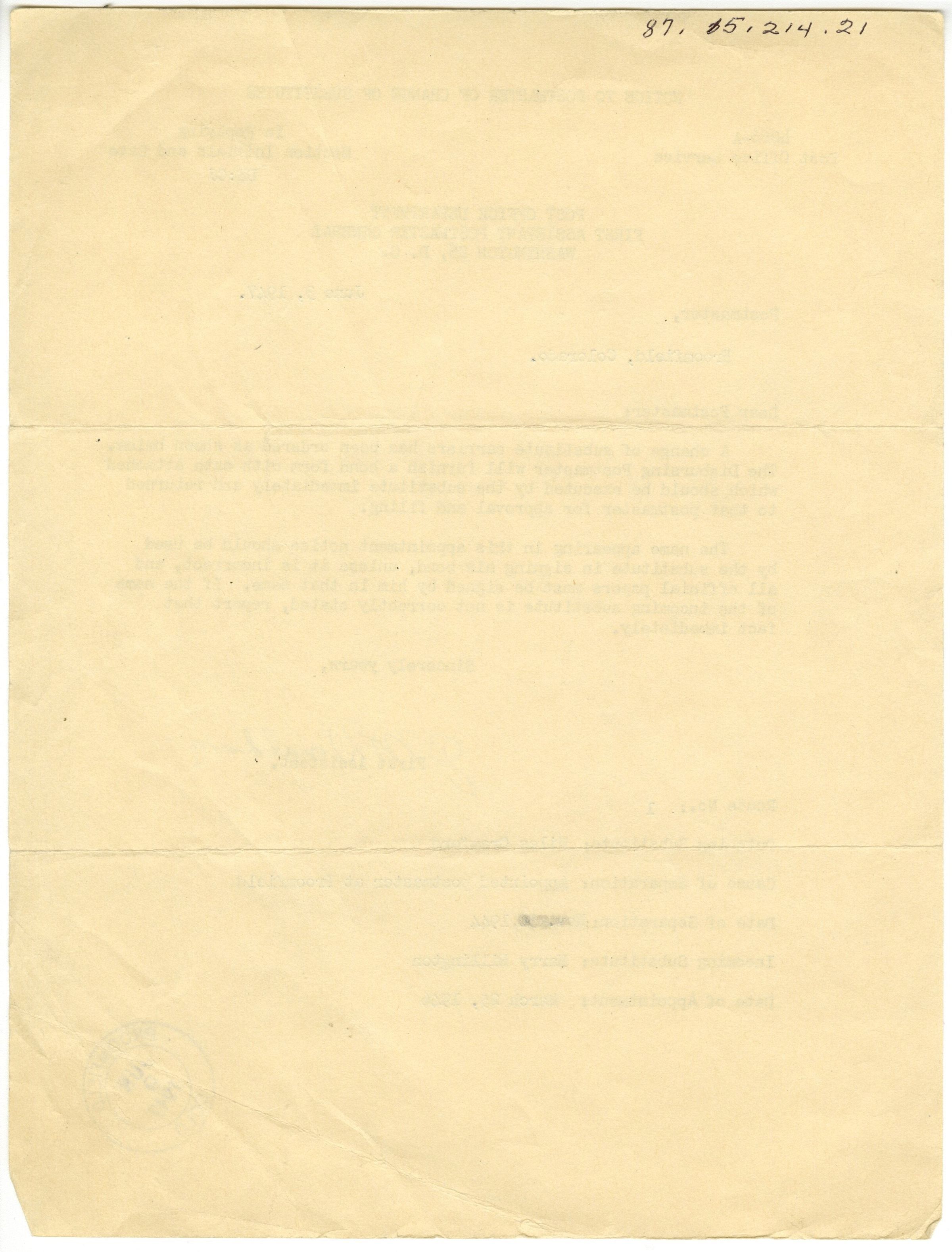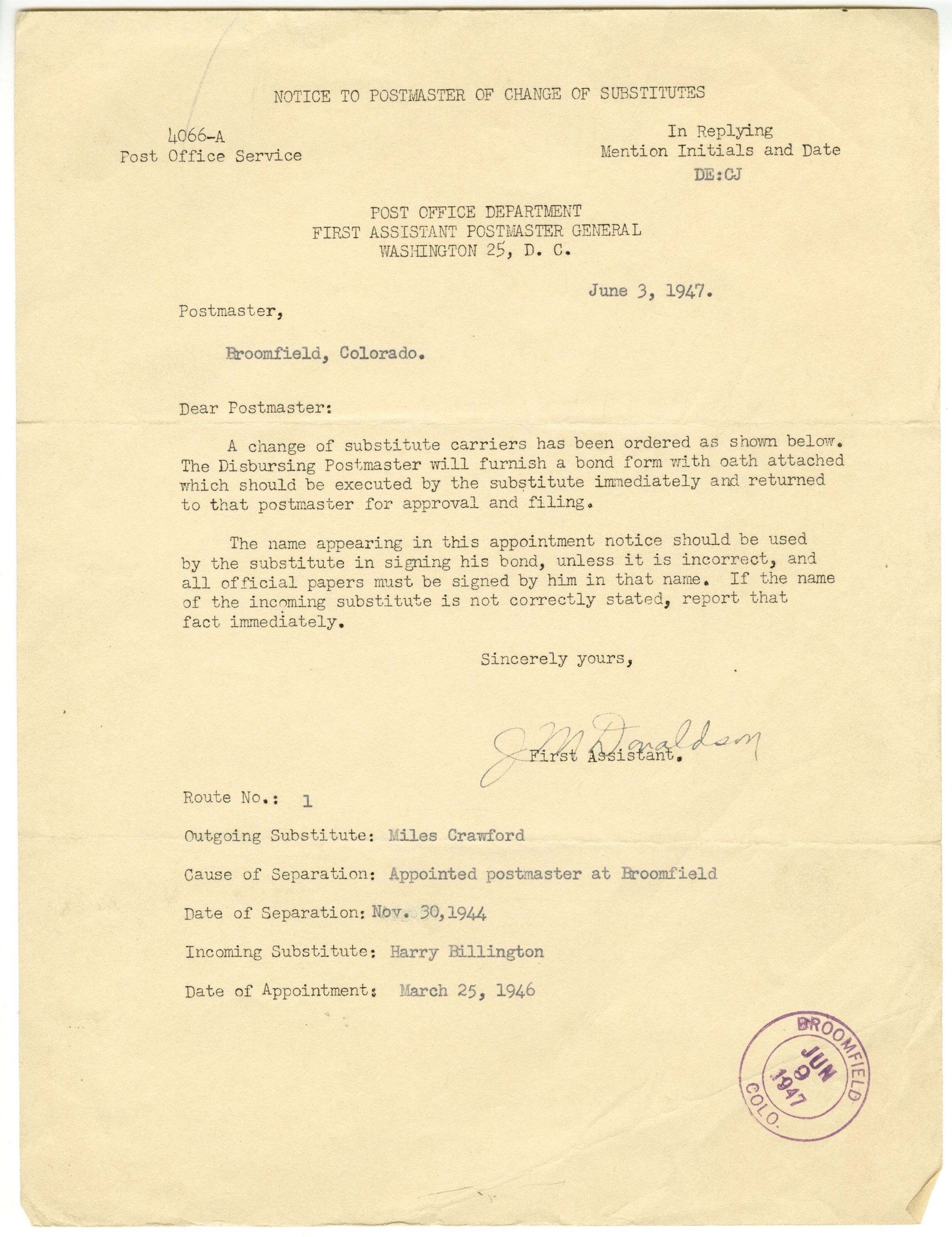 Notice to Postmaster of Change of Substitutes. Dated June 3, 1947. Miles Crawford appointed postmaster, incoming substitute to take his place was Harry Billington.