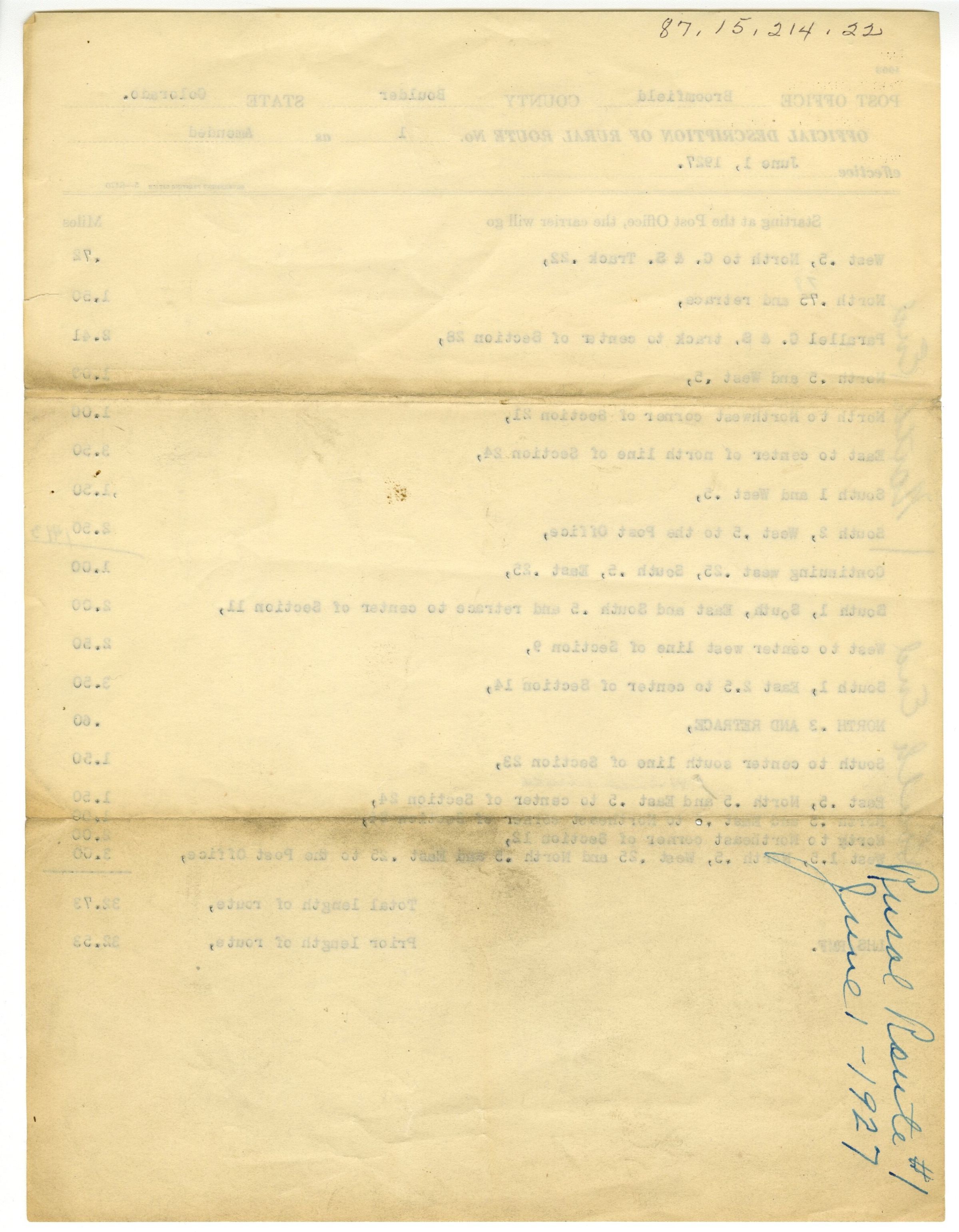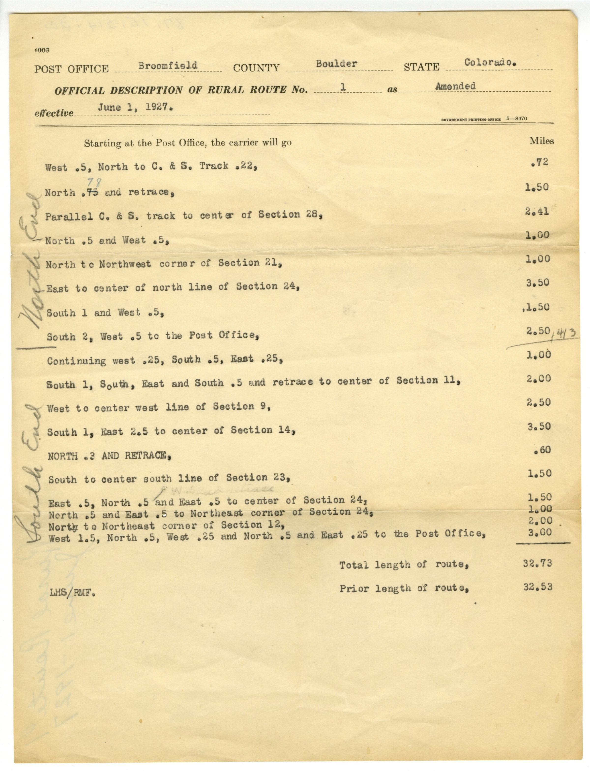 Official Description of Rural Route No. 1 as Amended, effective June 1, 1927.