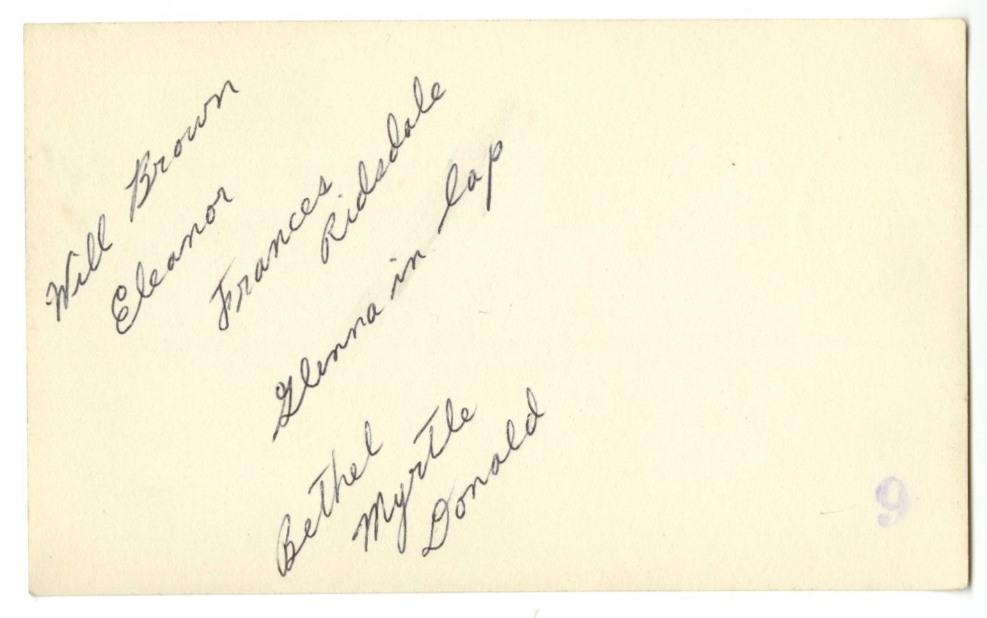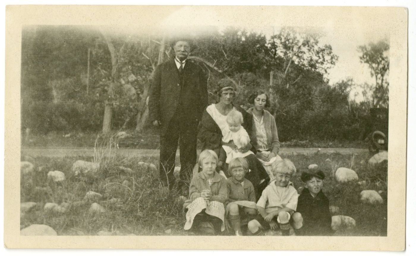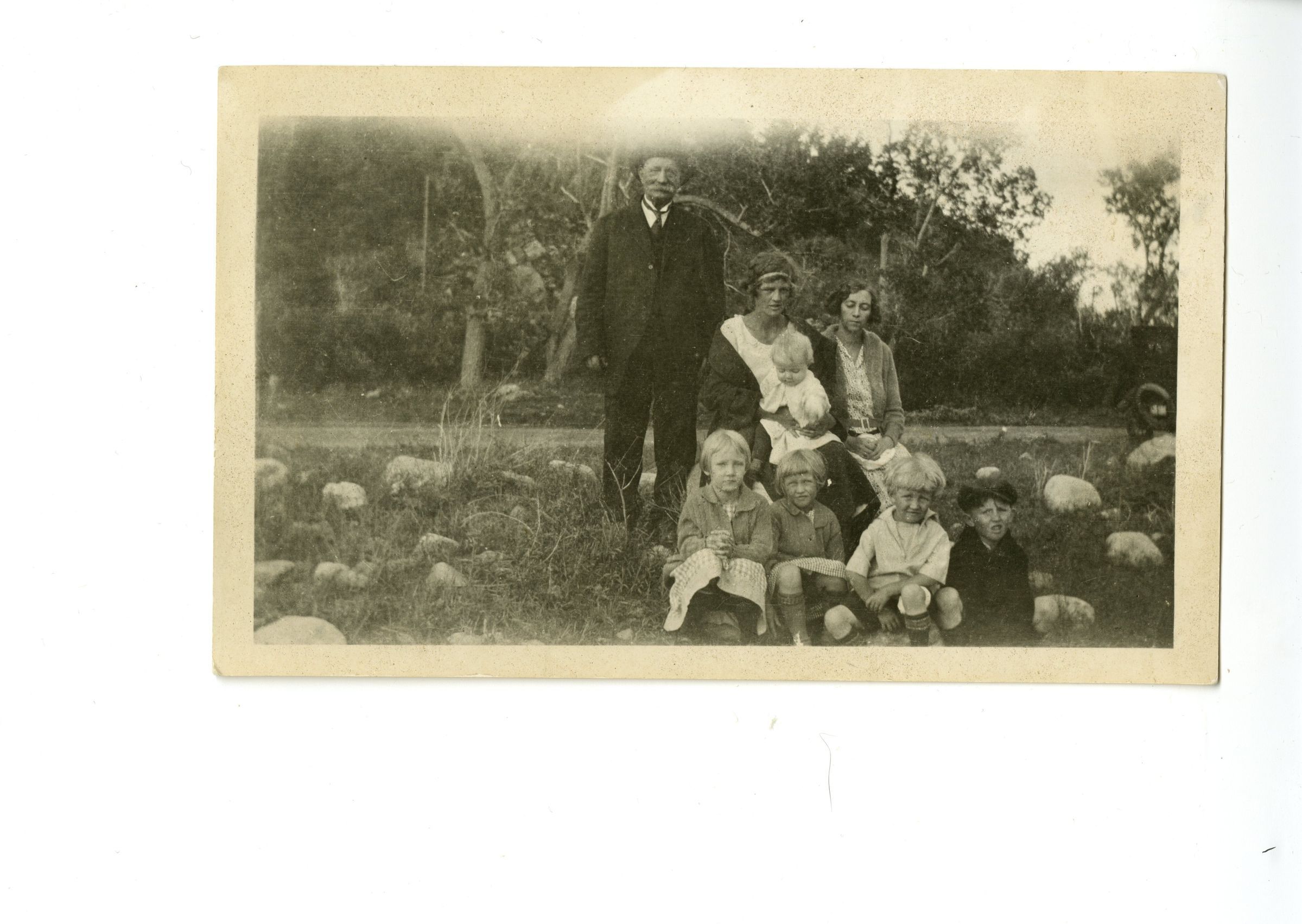 Scanned photograph of William Brown posing with two of his daughters and grandchildren, circa 1925. From left to right, back to front: William Brown, Ellenor Van Horn, Frances Ridsdale, Glenna Ridsdale, Bethel Ridsdale, Myrtle Van Horn, Donald Van Horn, unidentified child. The group is posing in a field, with trees in the background. The backside of the photograph has inscriptions in ink, probably written by descendants of the Brown family long after the photograph was taken. The inscriptions name most of the individuals in the photograph.Collection