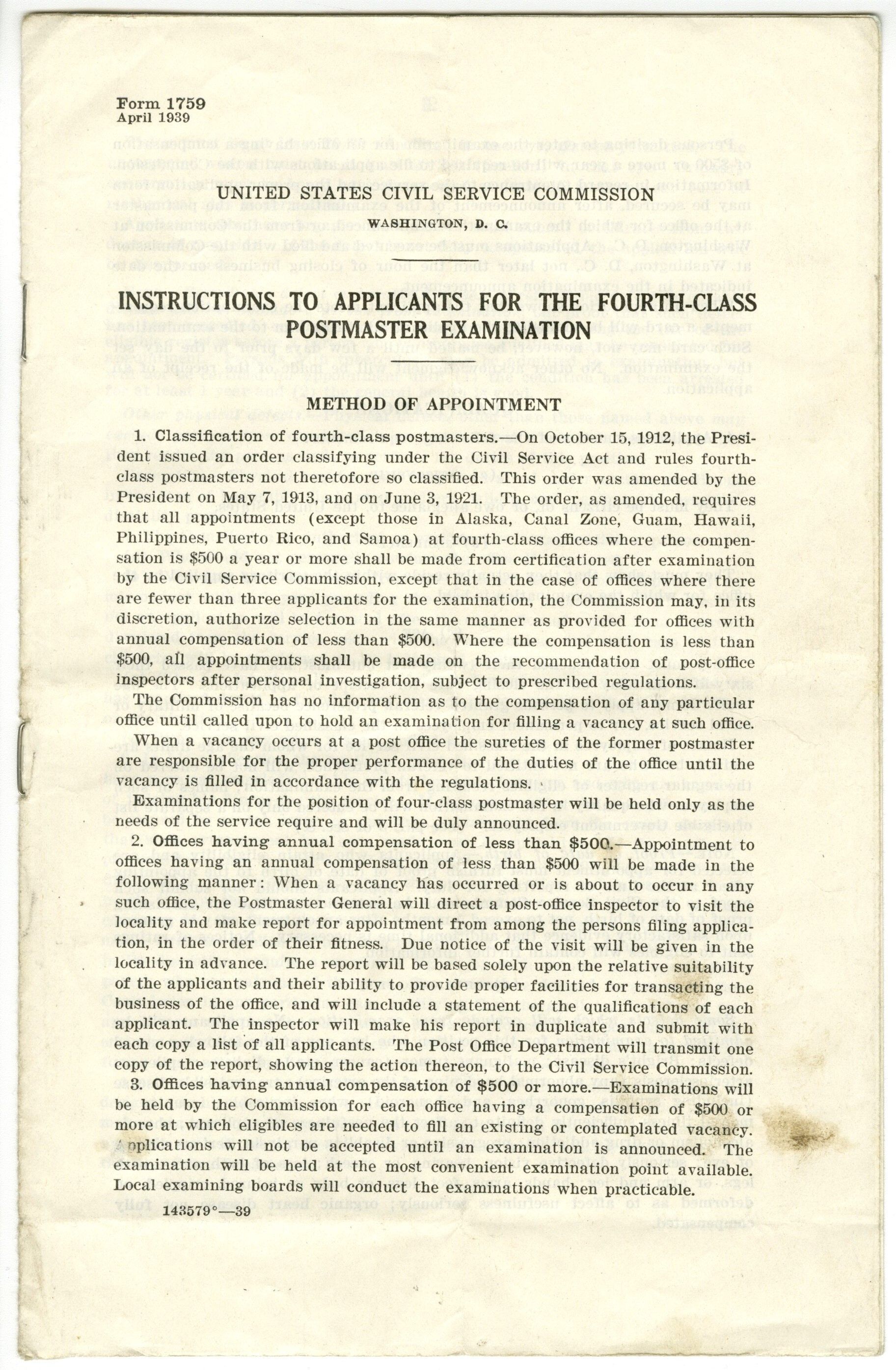 Instructions to Applicants for the Fourht-Class Postmaster Examination.