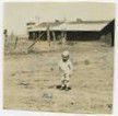 Black and white photograph of a toddler standing in an empty field. There is a building, meant for storage, in the background. The boy is identified as Gib. Photograph was probably taken at the Brunner Farm.
