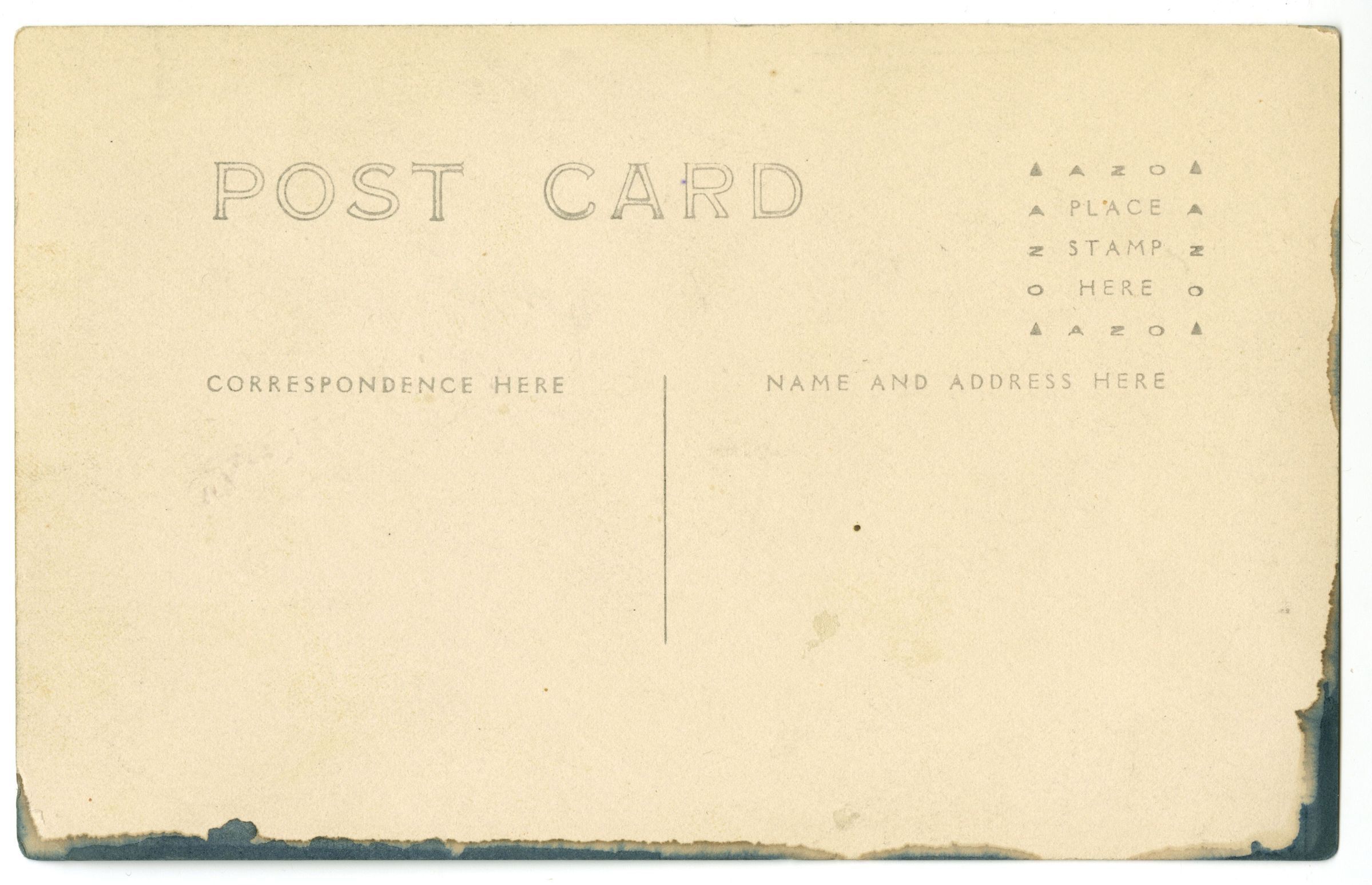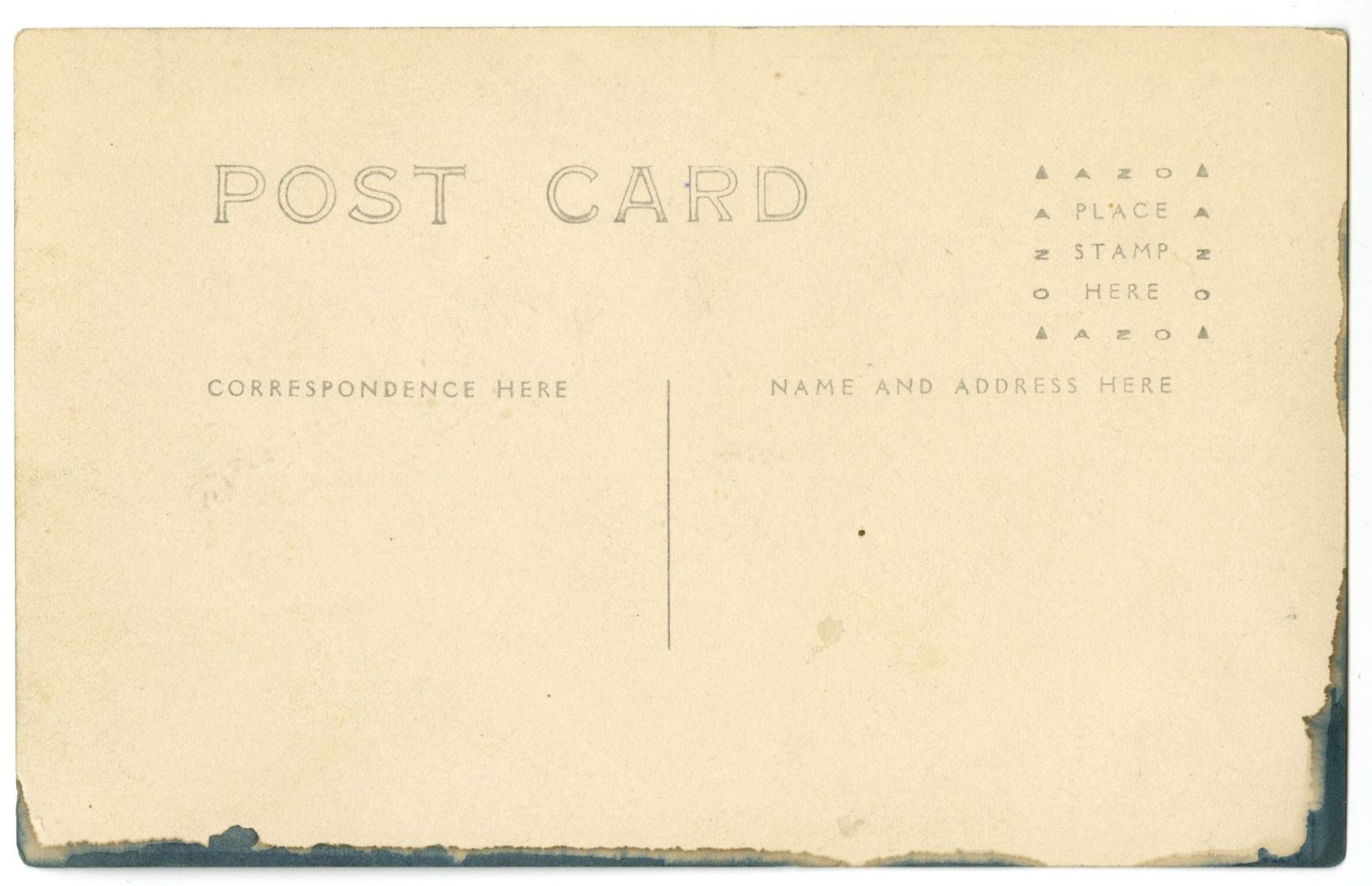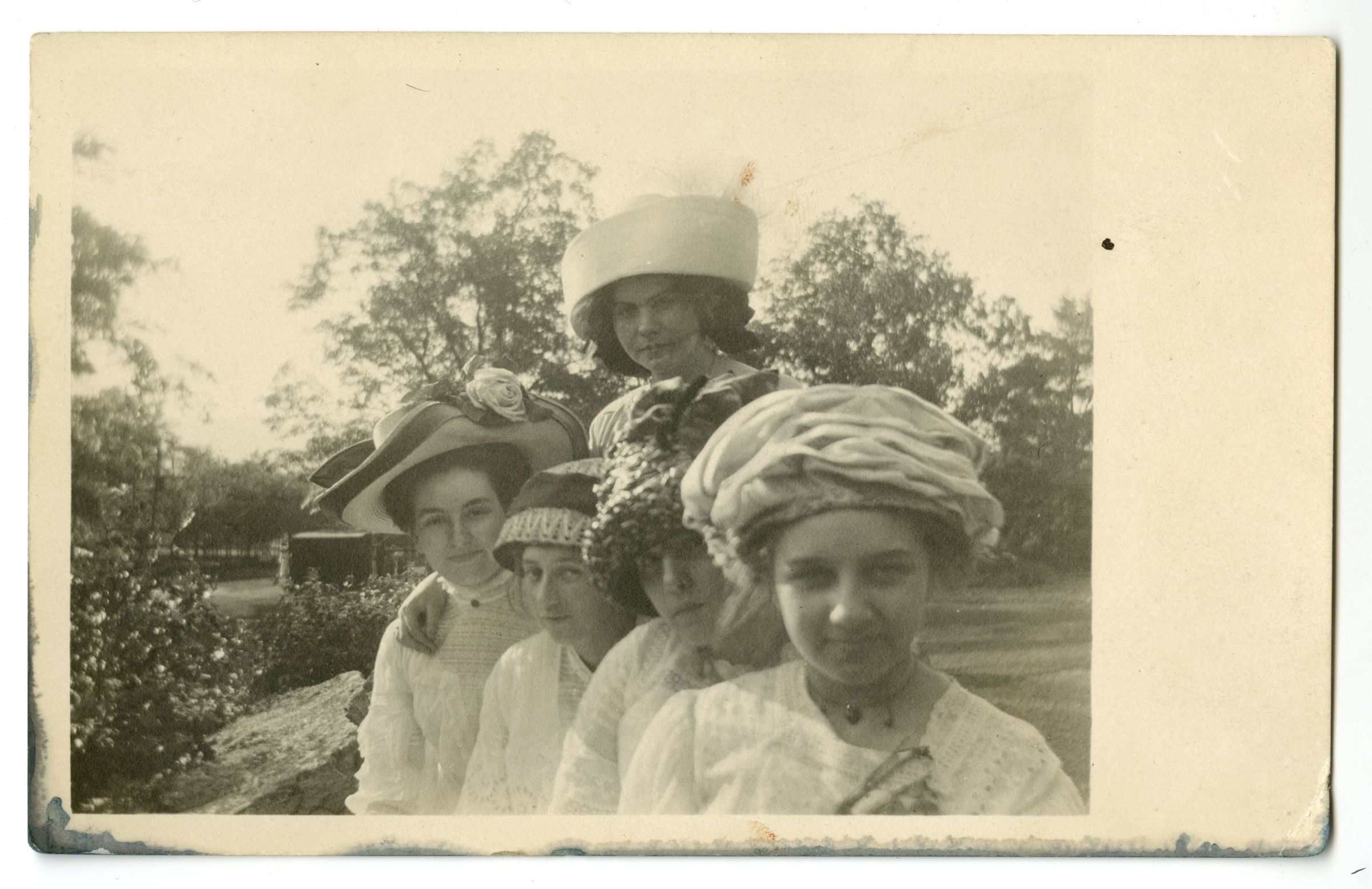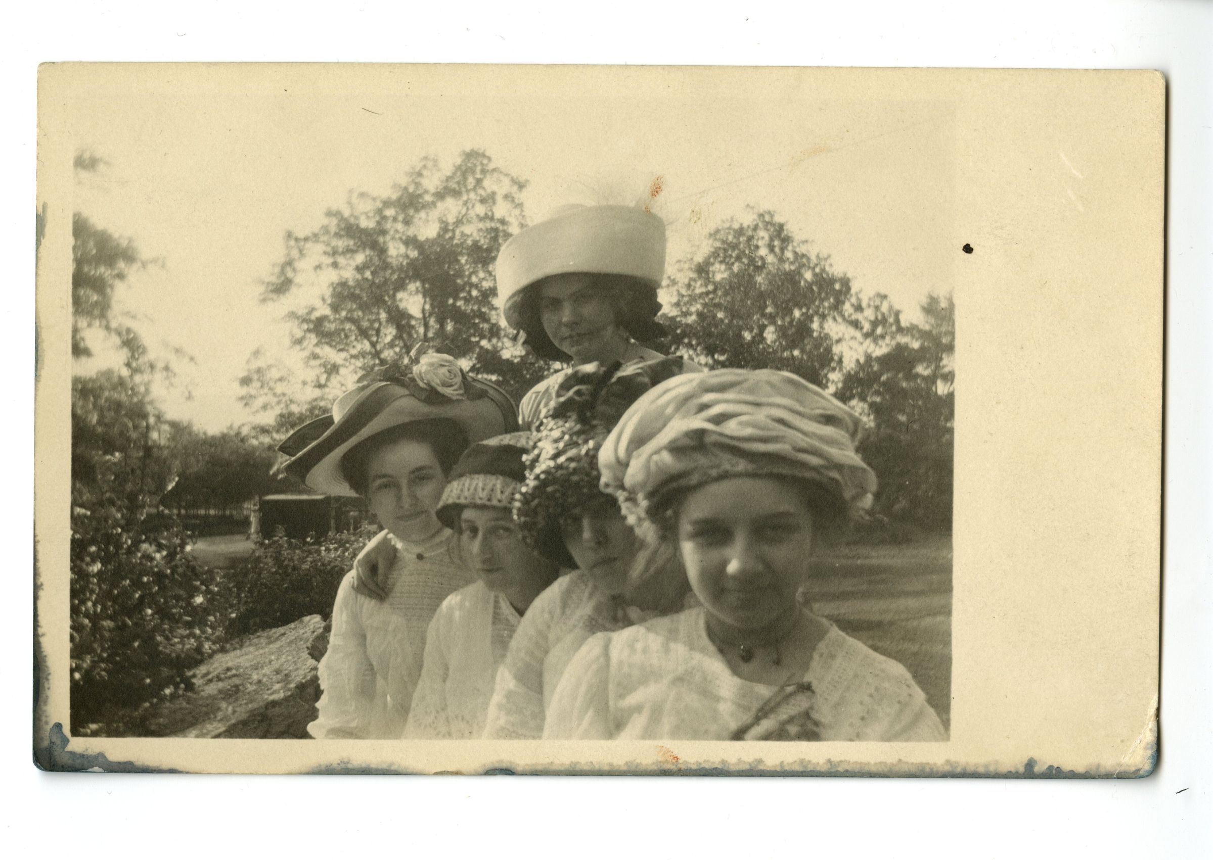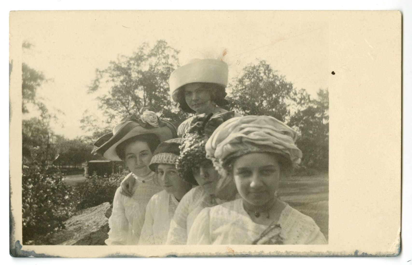 Scanned photograph of Frances Cron (second from the left) posing with four friends outside, circa 1914. The young women are wearing similar white dresses with formal hats. A house or shed and trees are seen in the background. The original photograph was printed on an Azo postcard. The reverse side is blank, with designated areas for postage, correspondence, and address.Collection
