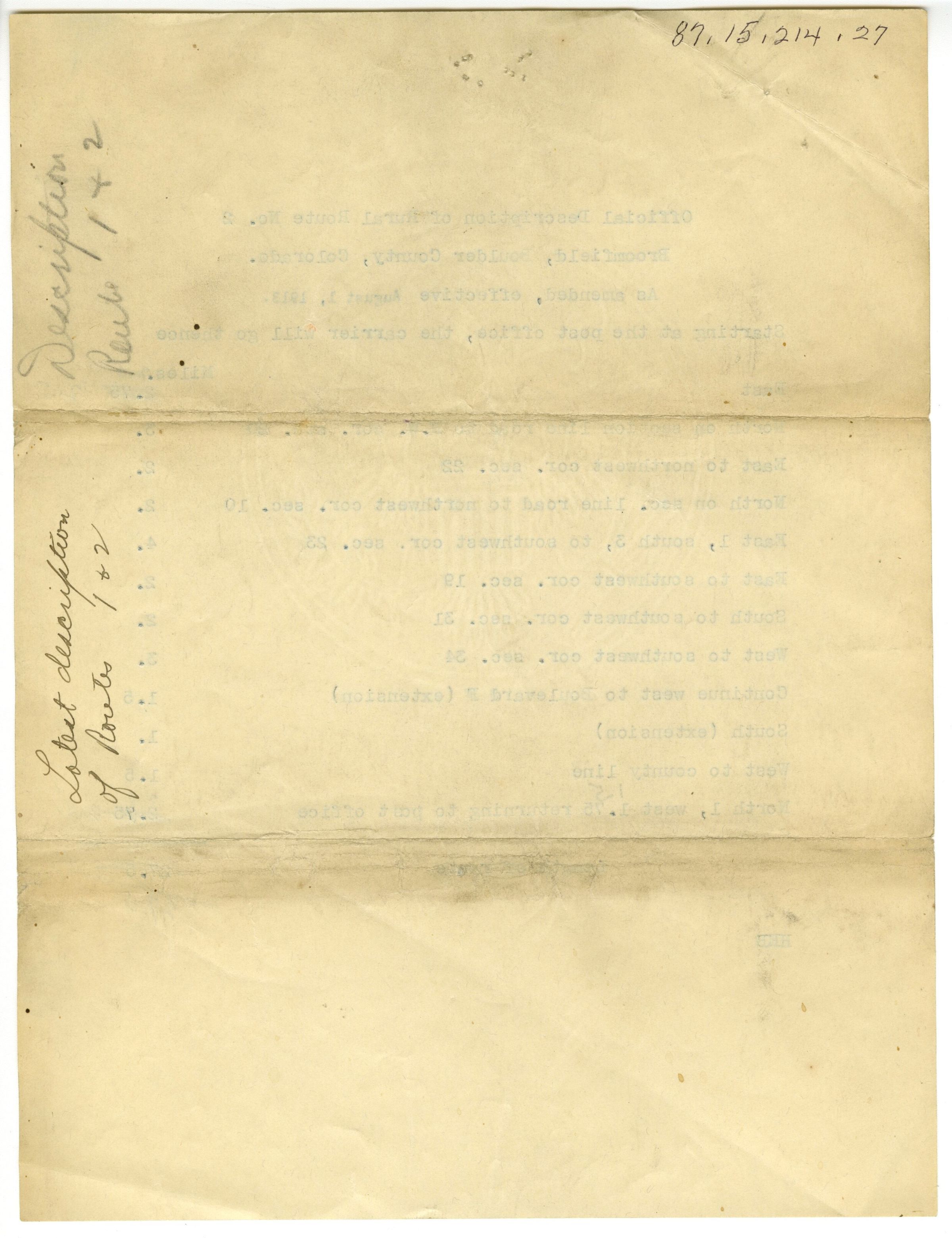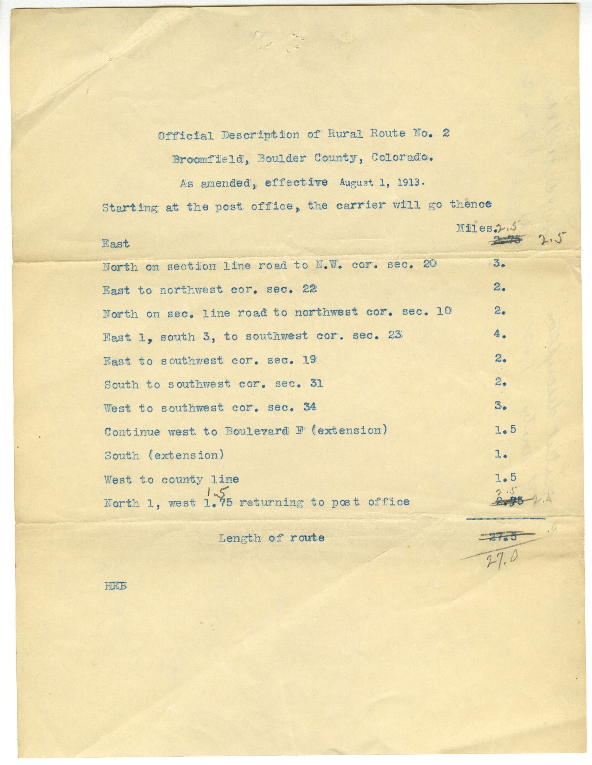 Official Description of Rural Route No. 2 as amended, effective August 1, 1913.