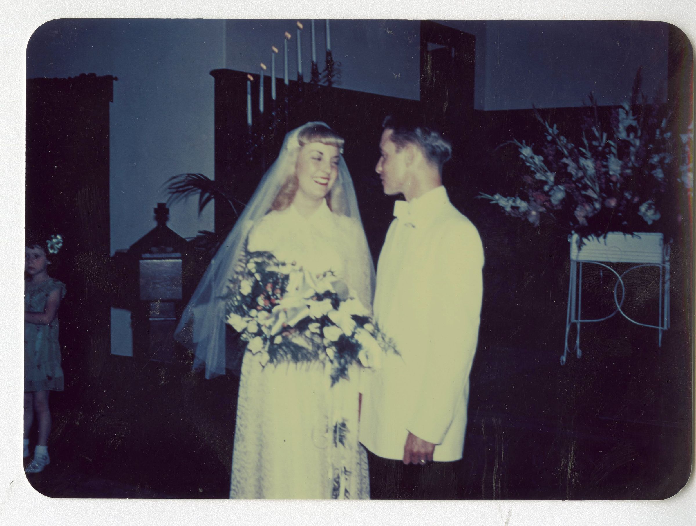 Color photograph of a wedding. The two people shown are likely Gilbert Brunner and Ila Brunner