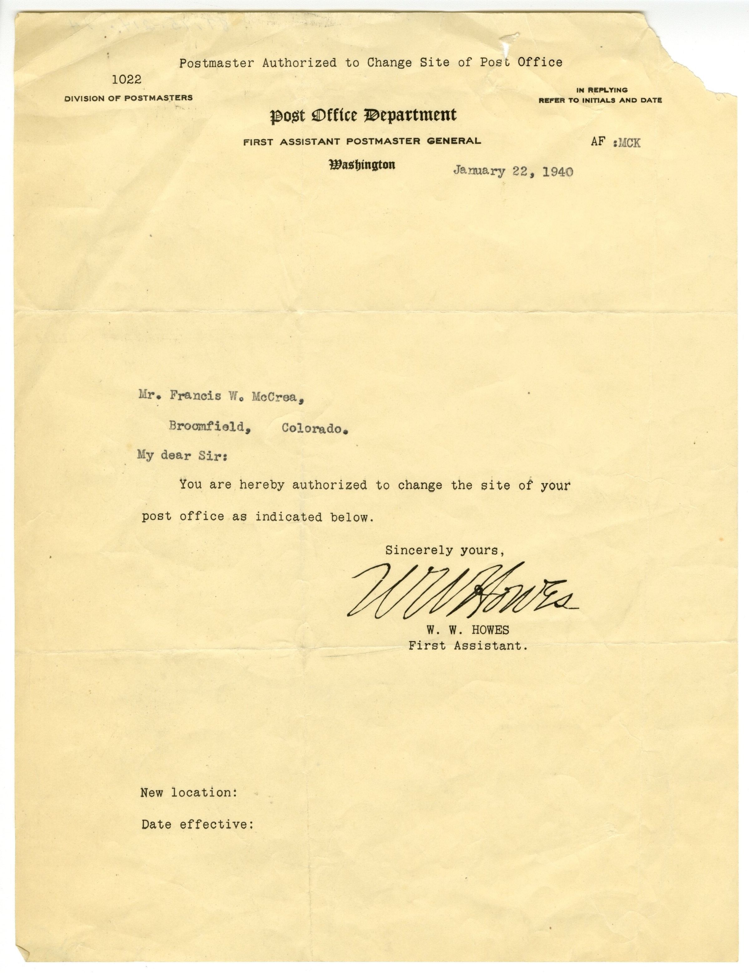 Report to Mr. Francis W. McCrea, Broomfield Colorado, from W.W. Howes, First Assistant, Post Office Department. Letter regarding changing the site of a post office.Collection