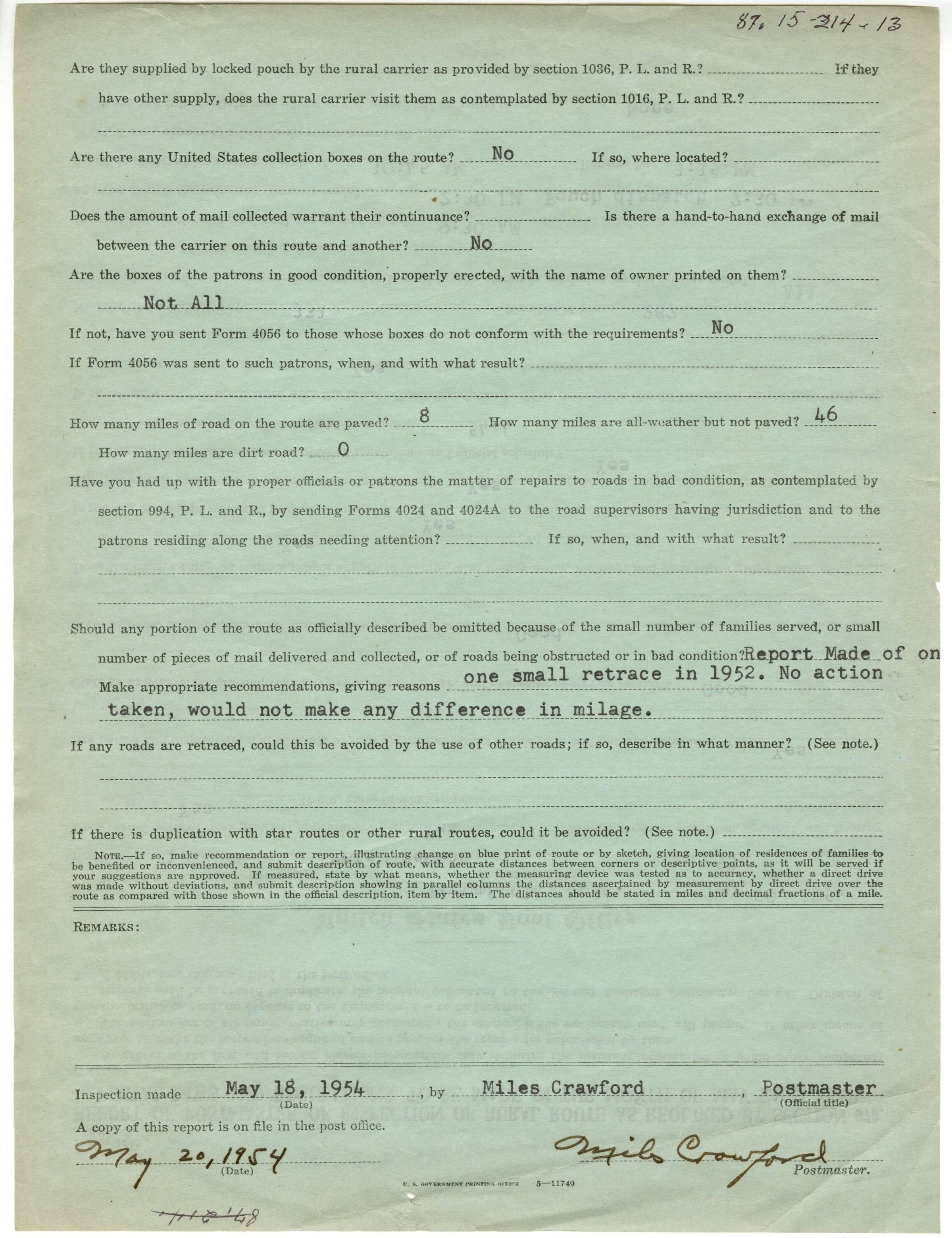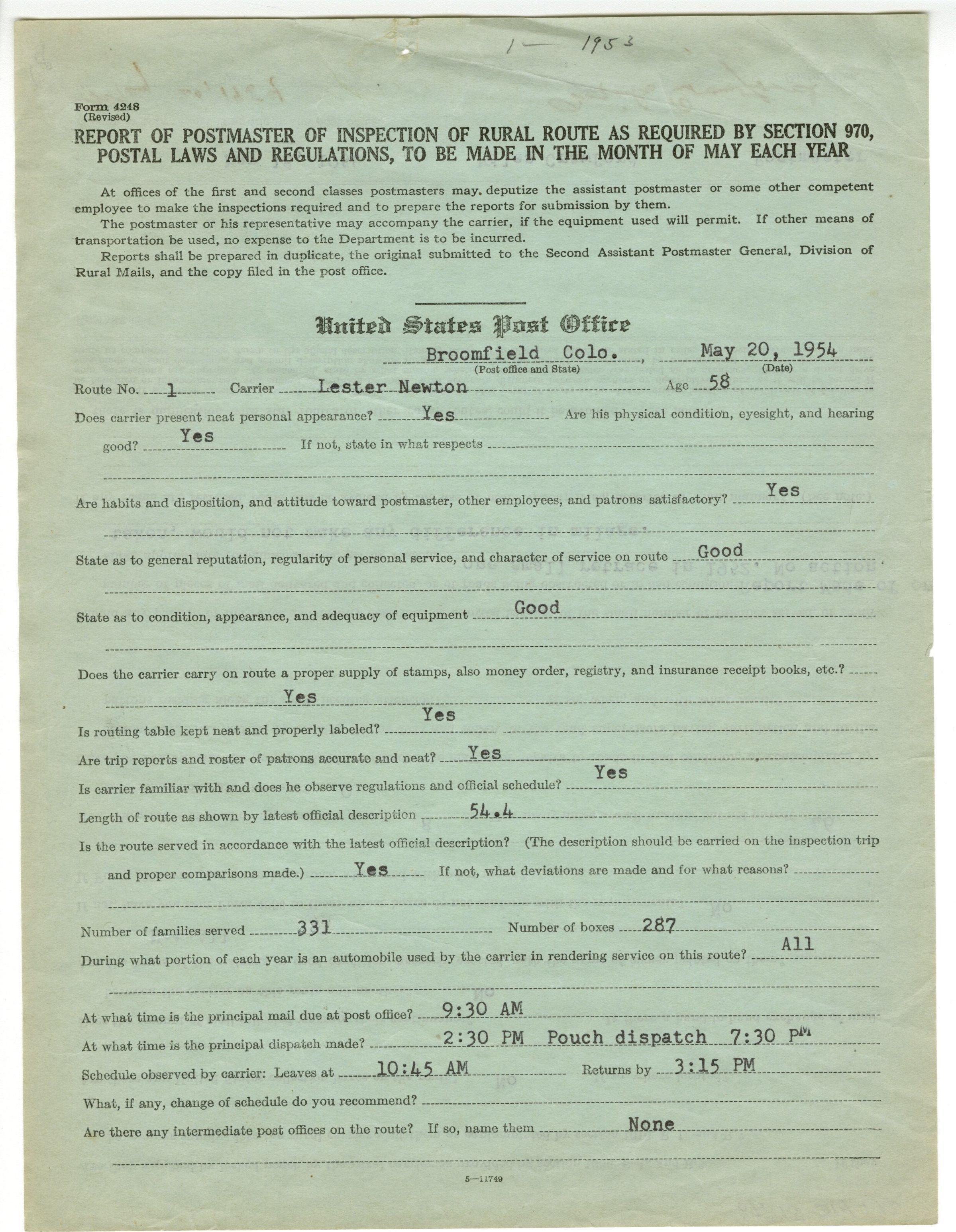 Dated May 20, 1954, carrier Lester Newton. Signed by Miles Crawford.Collection