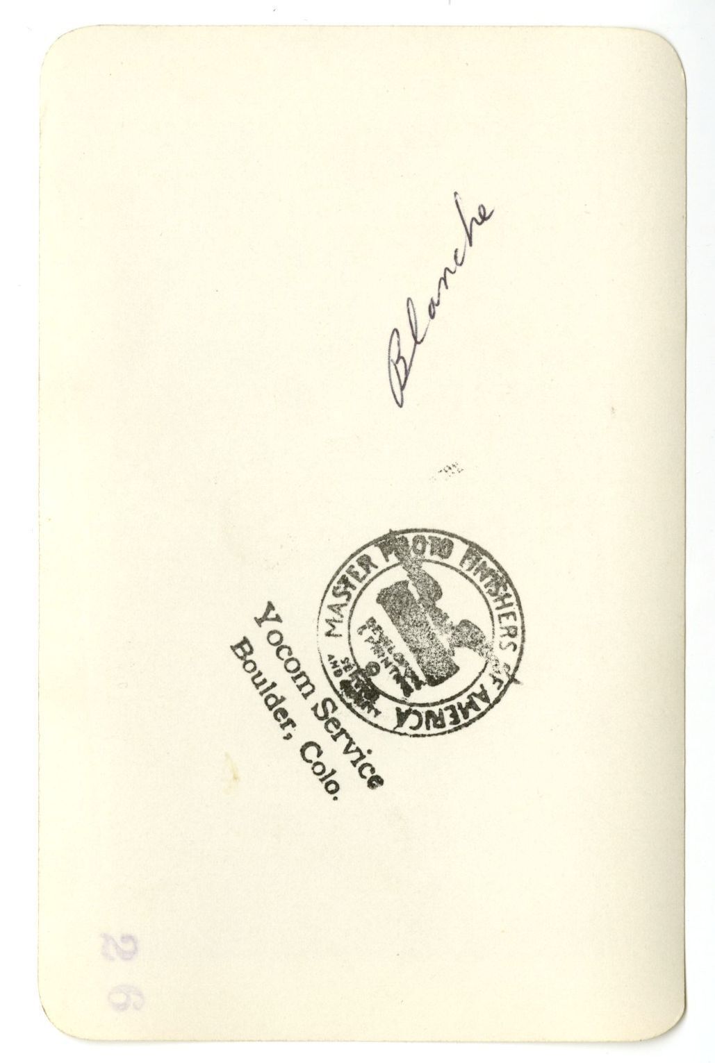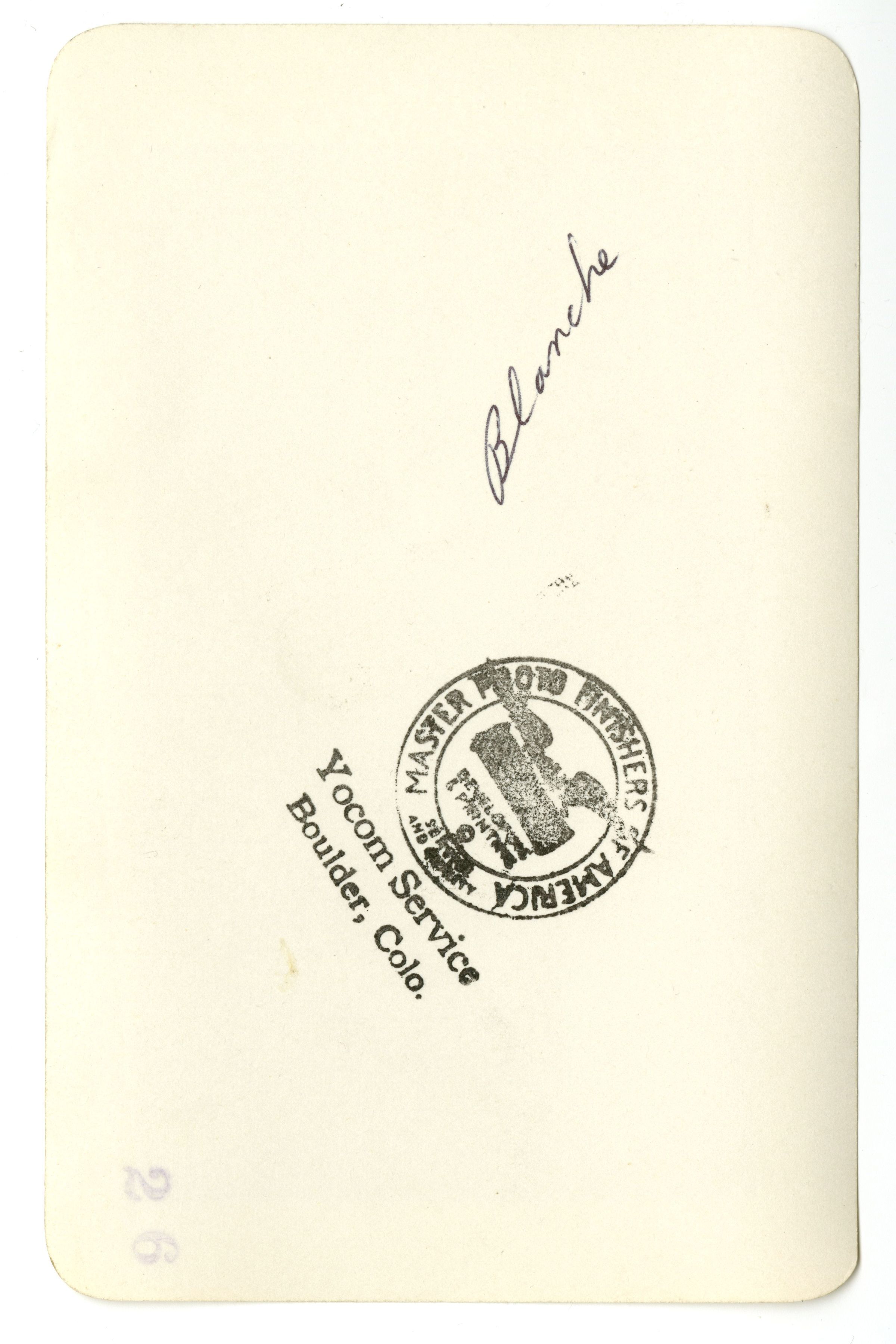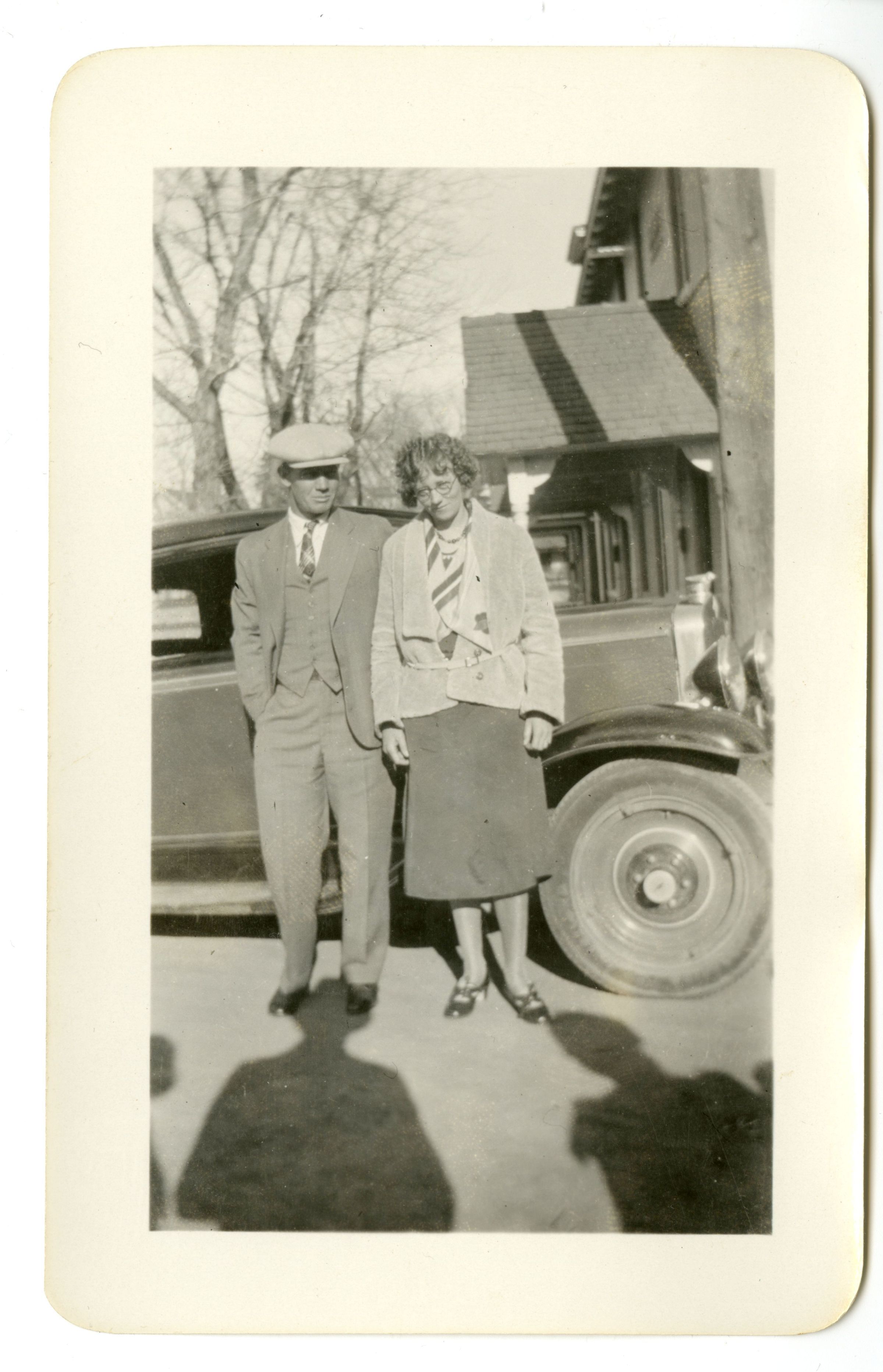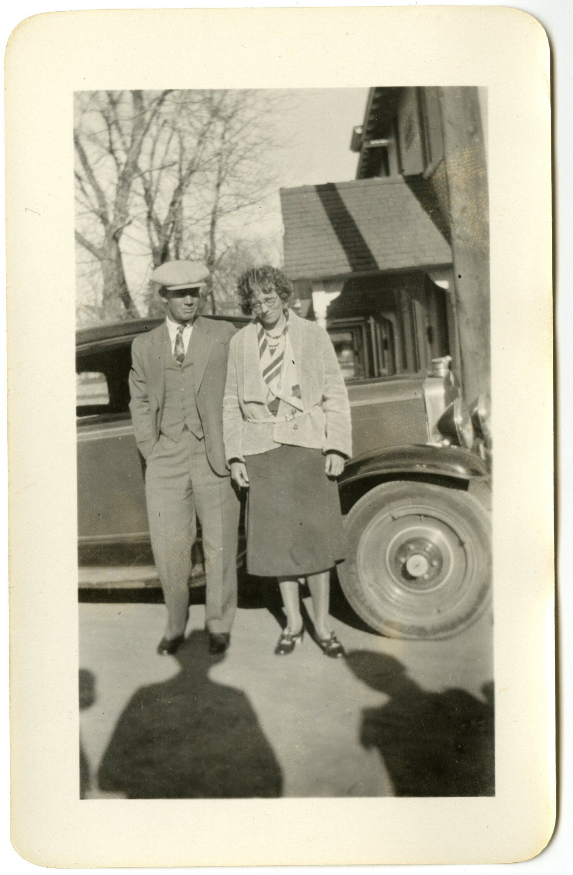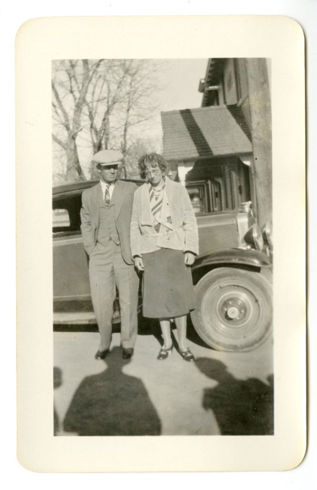 Scanned photograph of Blanche Brown Mayor with her husband Gus Mayor posing in front of a car, circa 1927. The side of a house can be seen in the background, and the shadows of onlookers are in front of them. The backside of the photograph has the inscription "Blanche" handwritten on it, and a stamp with an eagle that reads, "Master Photo Finishers of America. Yocom Service. Boulder Colorado."Collection