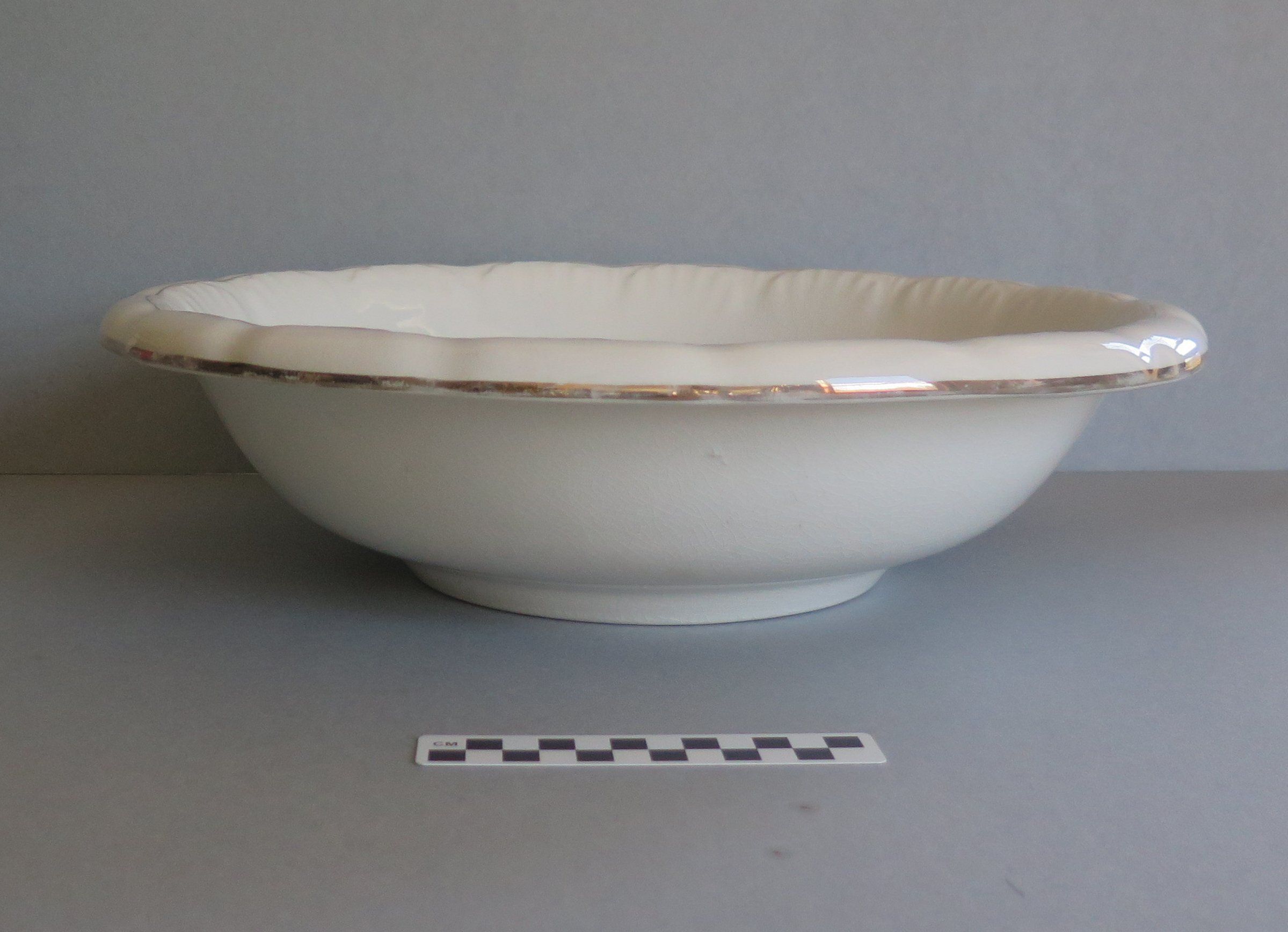 This is a white porcelain washbasin from a washstand set made by Knowles, Taylor & Knowles. There is no maker's mark on the bottom. The washbasin has a gold colored ring around the rim that is worn off in some places. There is a smaller gold colored ring 1 inch from the rim. The lip of the washbasin is curved down towards the bottom. The washbasin has crazing throughout that is visible on both the inside and the outside. The washbasin measures 4.75" (h) x 16.75" (diam).