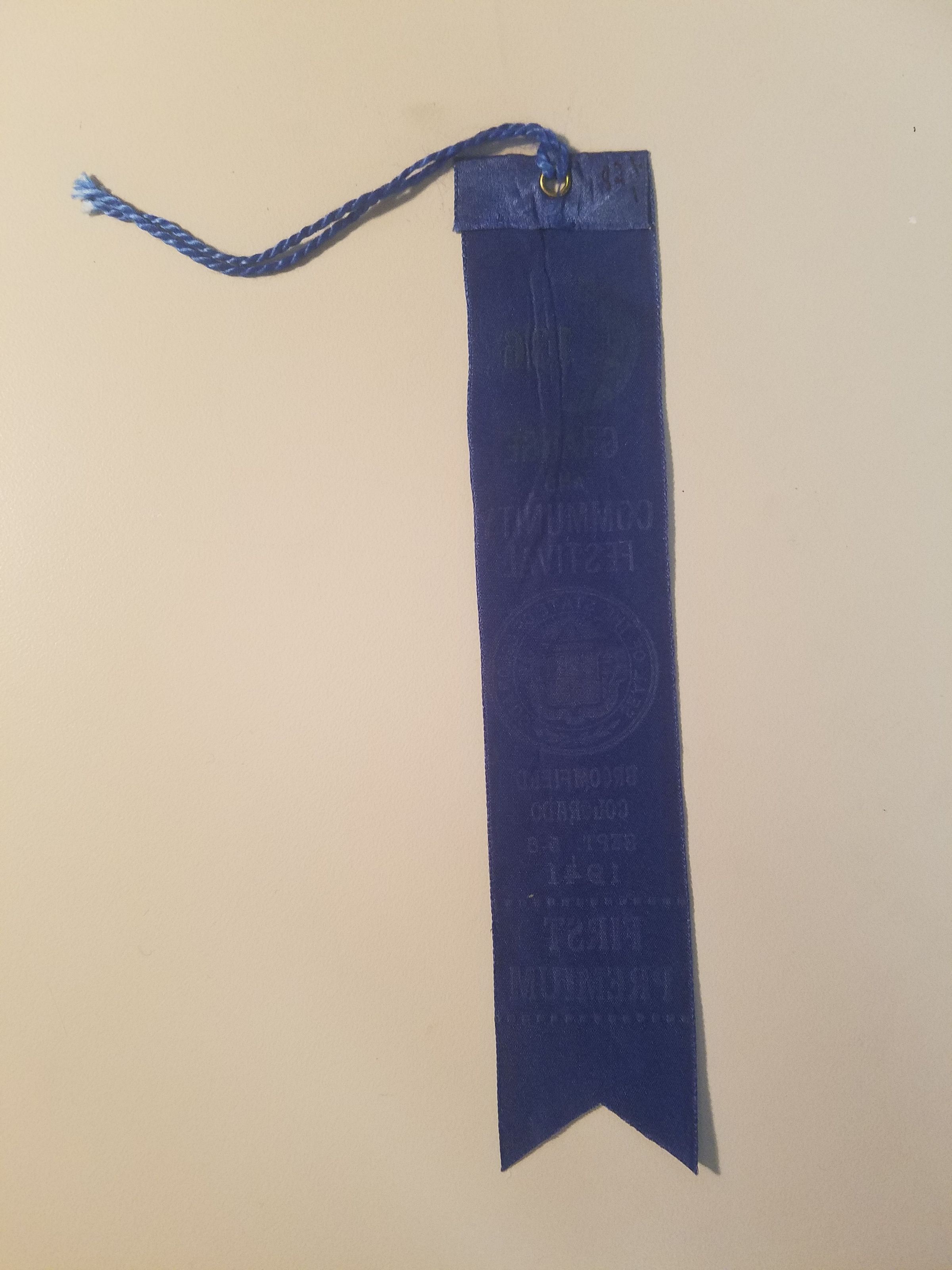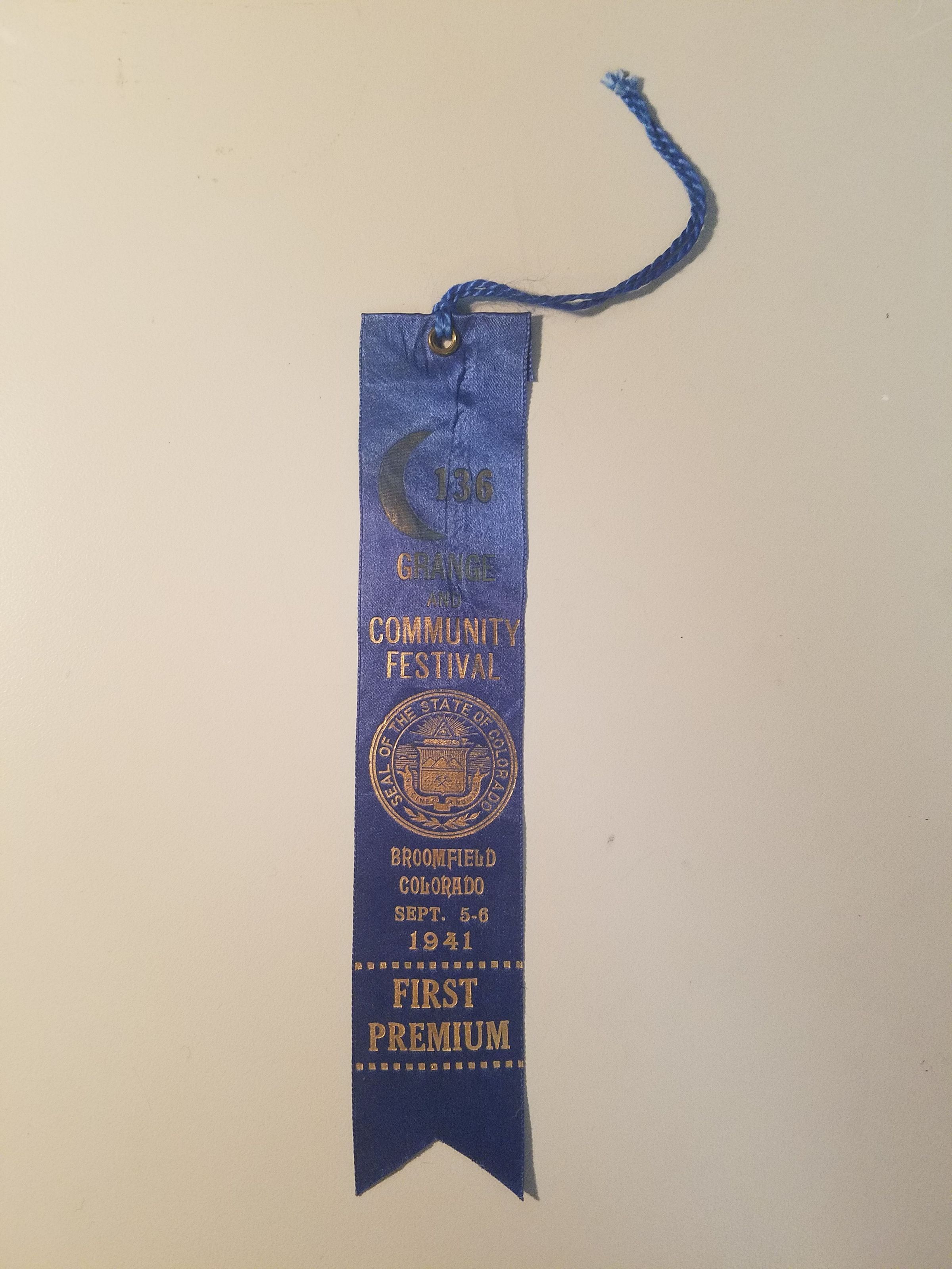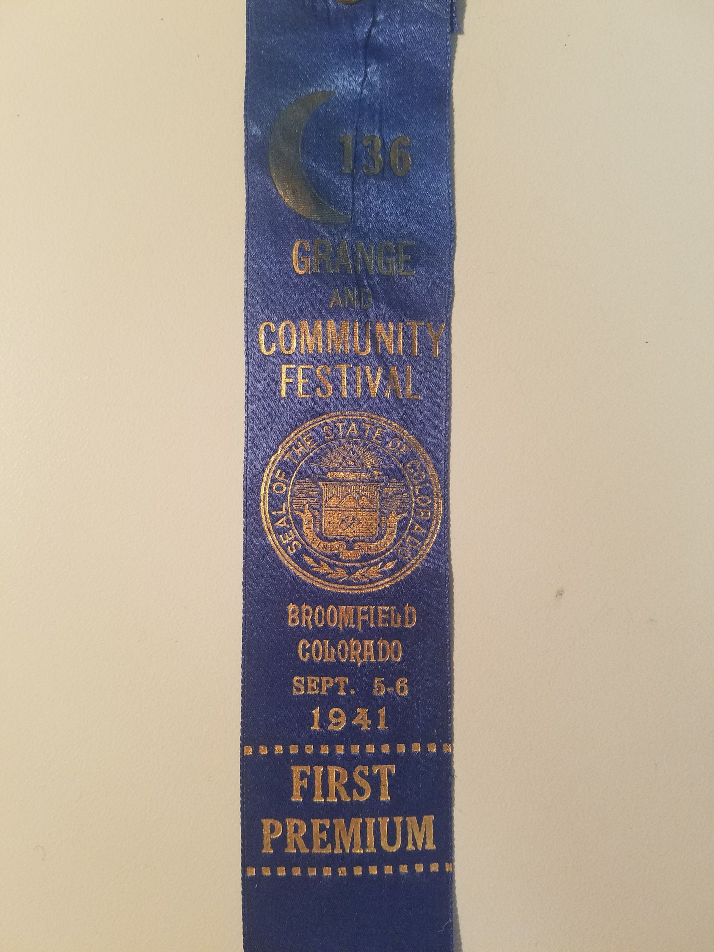 Ribbon, blue prize Grange & Community Festival 1941. From Laura Spitter Ap. 1982 - 1941 Grange Blue Ribbon. On front it reads "136 / GRANGE AND COMMUNITY FESTIVAL / SEAL OF THE STATE OF COLORADO / BROOMFIELD COLORADO / SEPT. 5-6 1941 / FIRST PREMIUM "
