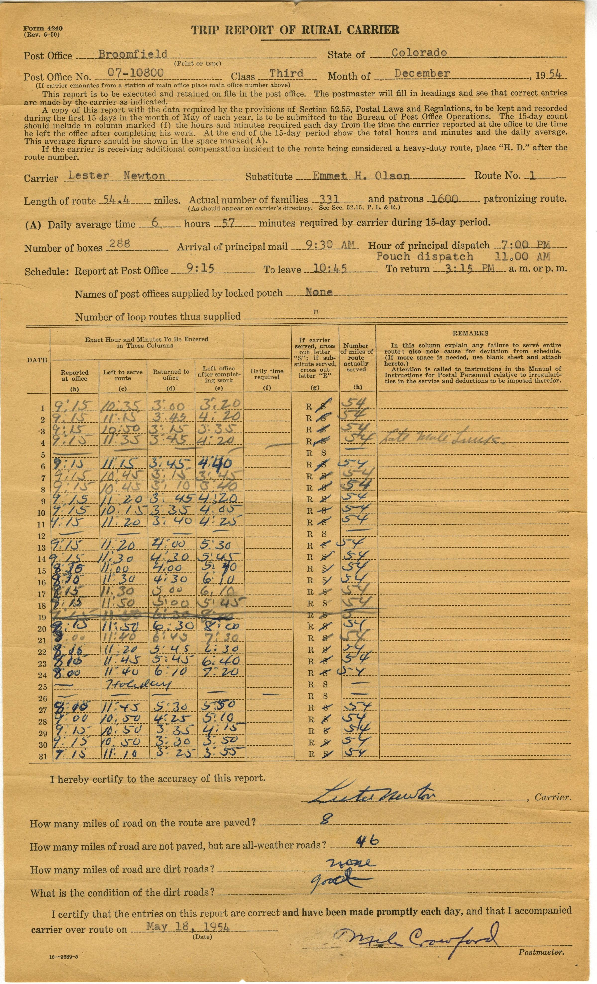 Dated December, 1954. Carrier: Lester Newton, Substitute: Emmet H. Olson, Route No.: 1.