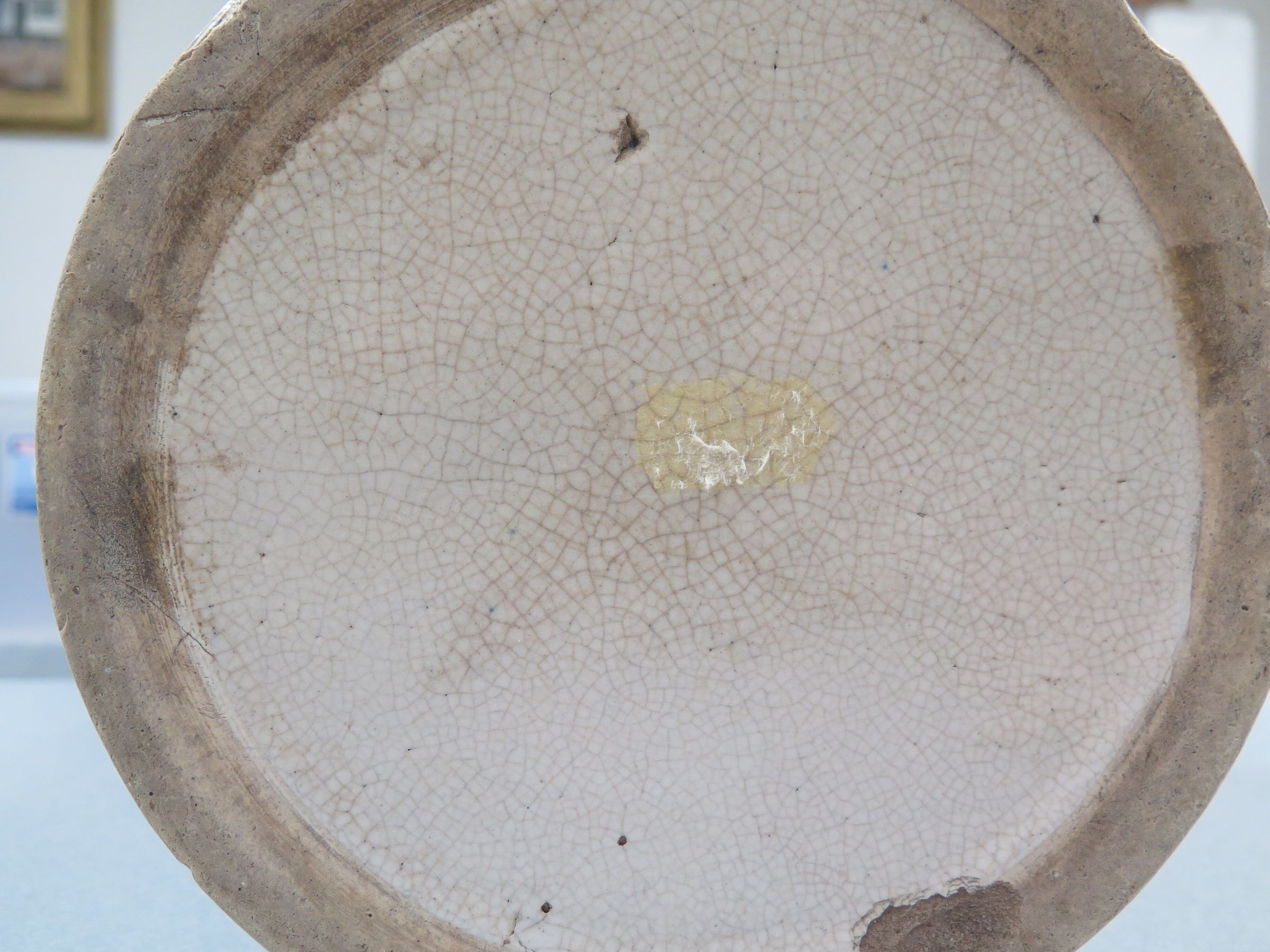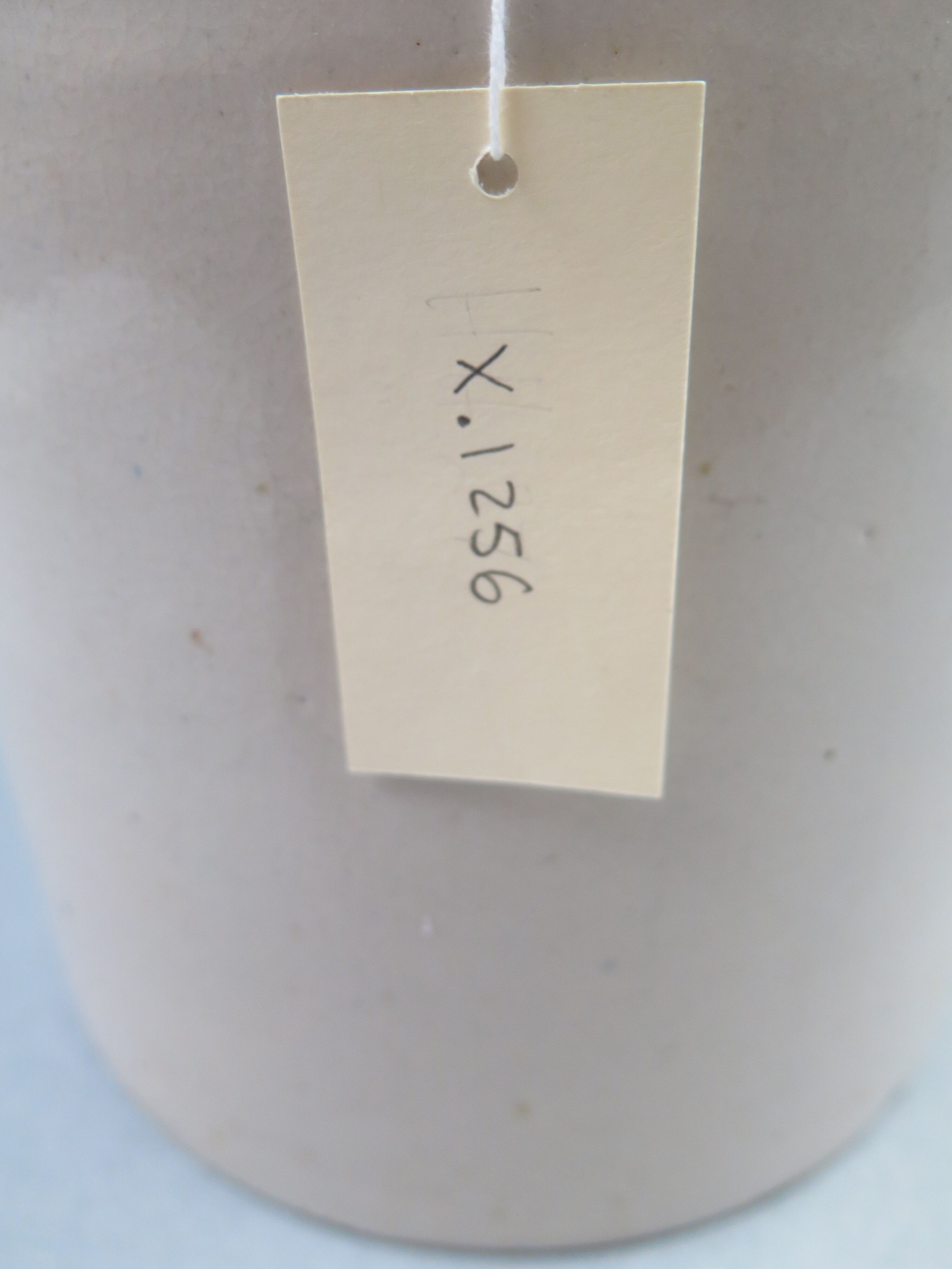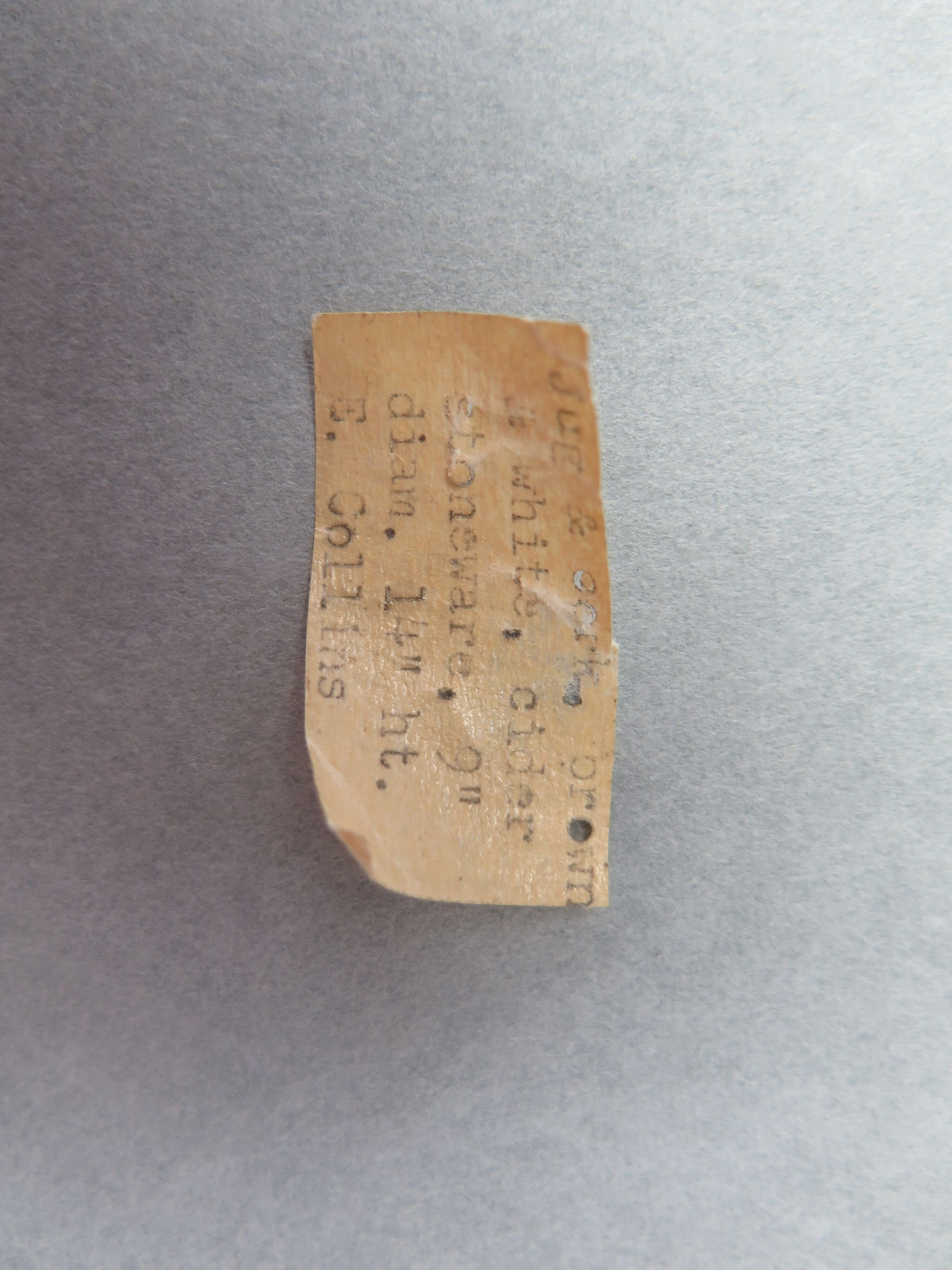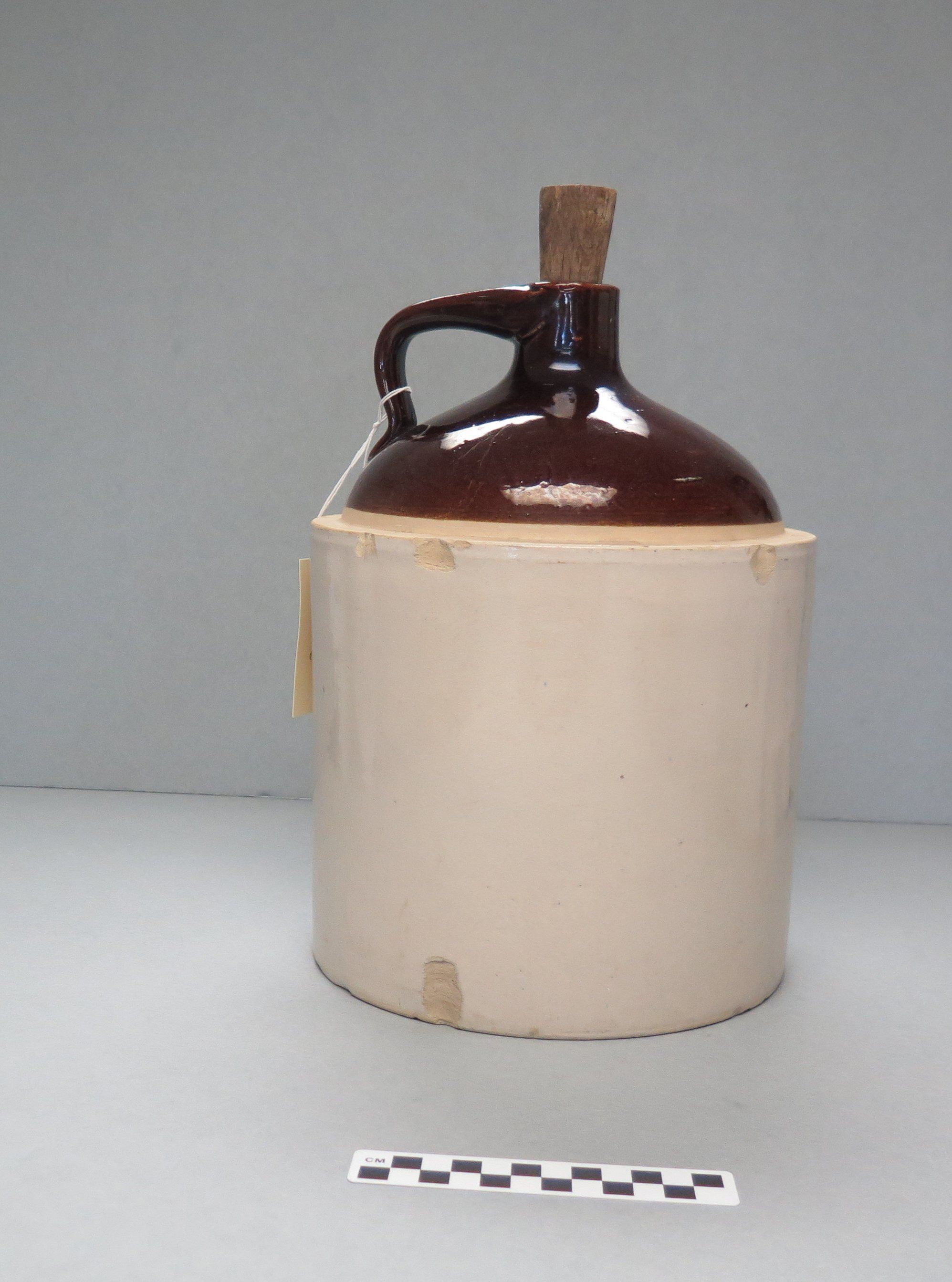 Ceramic jug, the body of the jug is a white glaze, which has crazing, and the top of the jug is a brown glaze. The top of the jug has a handle starting at the opening. There is a cork in the opening of the jug. On the bottom of the jug is a sticker that has the text printed in black ink reading "Jug & cork, brown / & white, cider / stoneware. 9" / diam. 14" ht. / E. Collins." The jug measures 14" (h) x 9" (diam).Lexicon